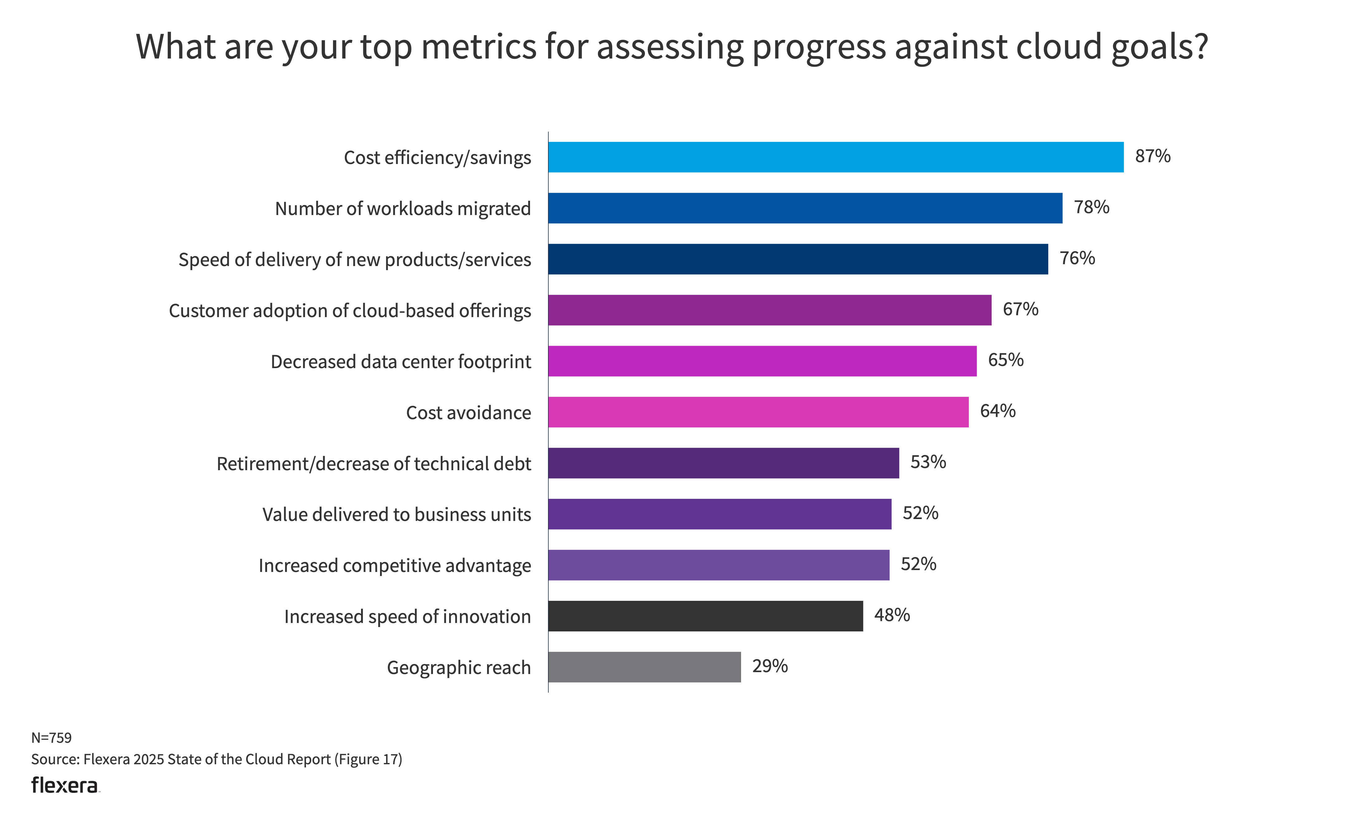 For the sixth year in a row, cost efficiency/savings is the number one metric for assessing progress against cloud goals, increasing from 65% to 87% year over year. The number of workloads migrated as a metric increased significantly from the past year (from 36% to 78%), and cost avoidance made a large jump as well (from 28% to 64%).