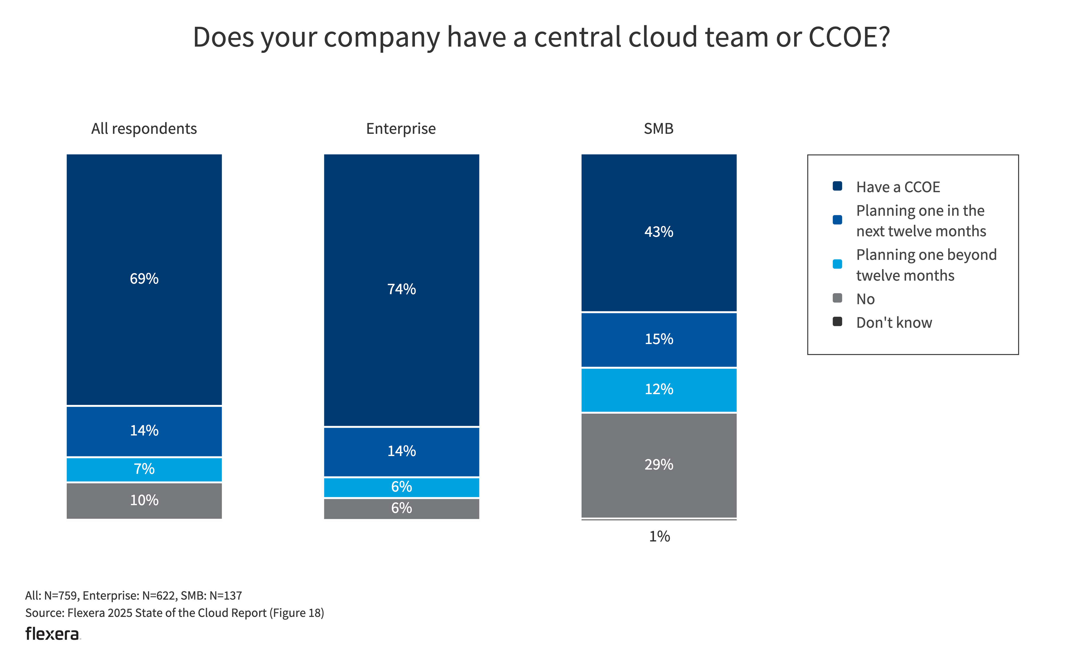 The presence of a cloud center of excellence (CCOE) increased this year by 6 percentage points. SMBs’ usage (43%) of a CCOE is significantly less than enterprises’ (74%), but it was still a 14 percentage point increase compared to last year’s findings. These numbers are expected to continue to increase as FinOps gains traction across the cloud user community.