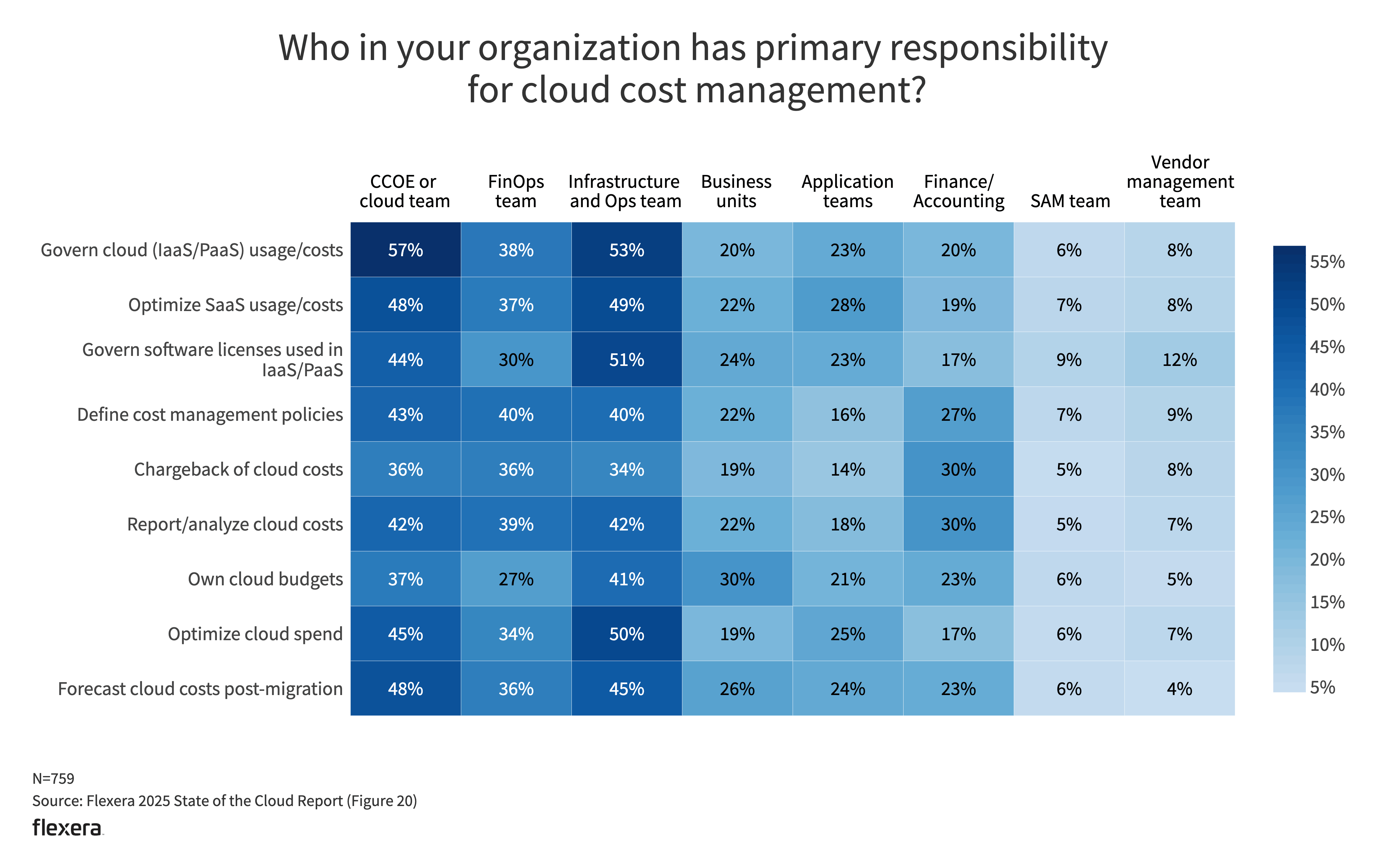 This year shows slight movement in the responsibilities around governing and optimizing cloud and SaaS costs. More of this responsibility is shifting from vendor management teams toward CCOEs and FinOps teams. However, software license management continues to be a common responsibility for CCOEs as well as infrastructure and ops teams, as opposed to software asset management (SAM) teams, who traditionally own software license management. This indicates that there’s still a disconnect among the FinOps and IT asset management (ITAM) teams within many organizations. The importance of considering software in the cloud costs aligns with the FinOps Foundation’s expanding use cases and suggests that driving value and cost benefits requires a more holistic review of spend beyond just public cloud services.