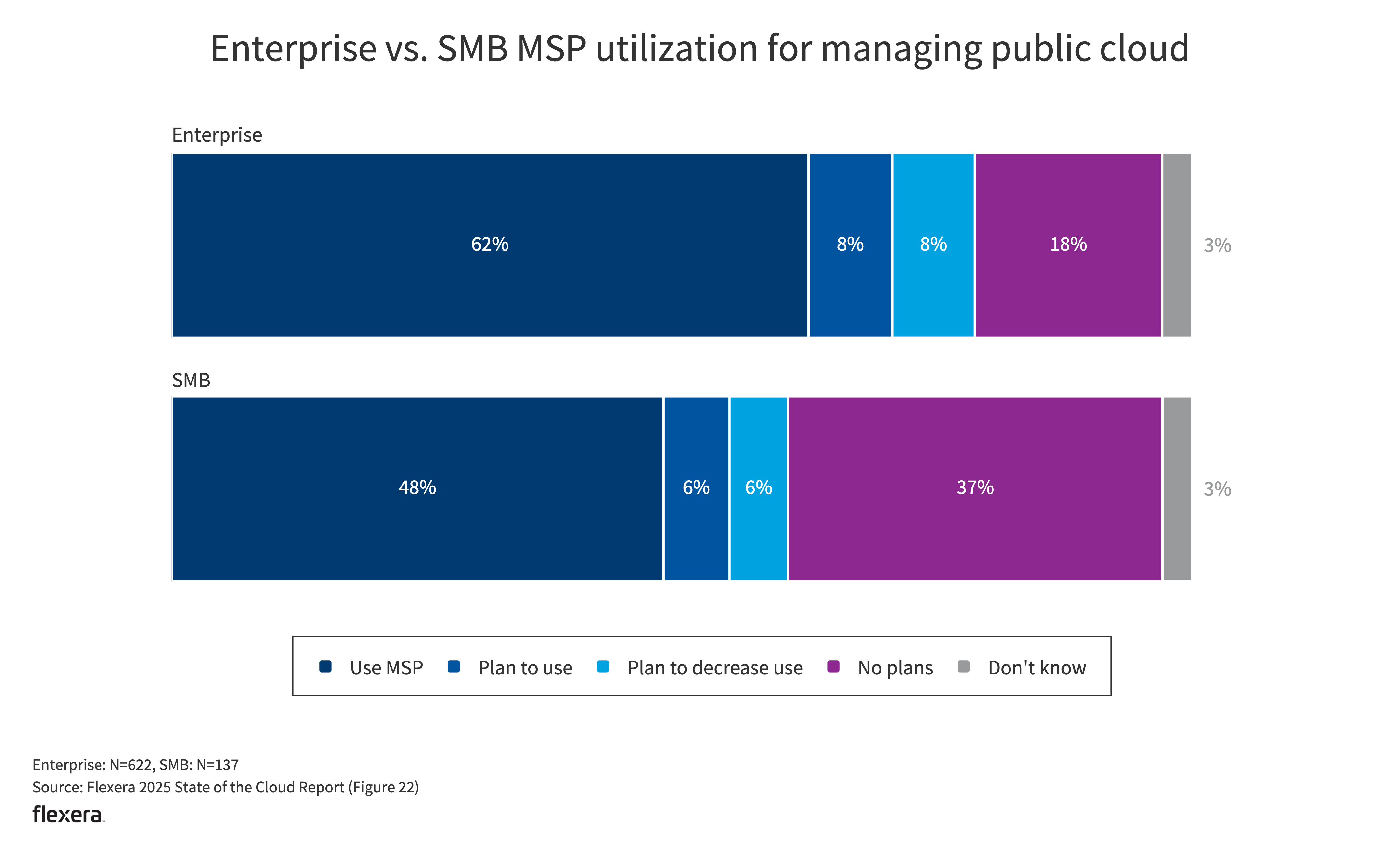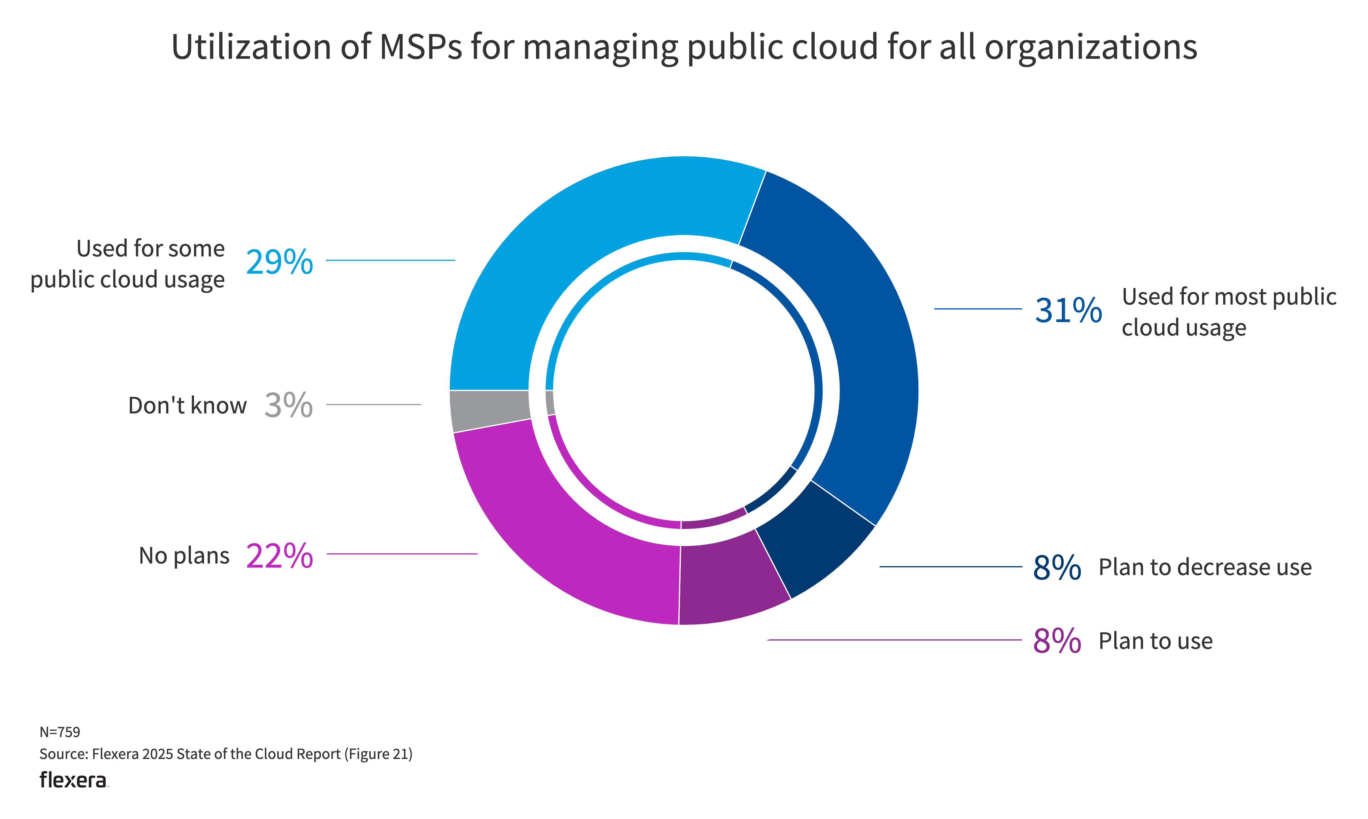 Managed services provider (MSP) usage has increased year over year. In fact, 60% of all organizations use MSPs in some capacity for managing public cloud.