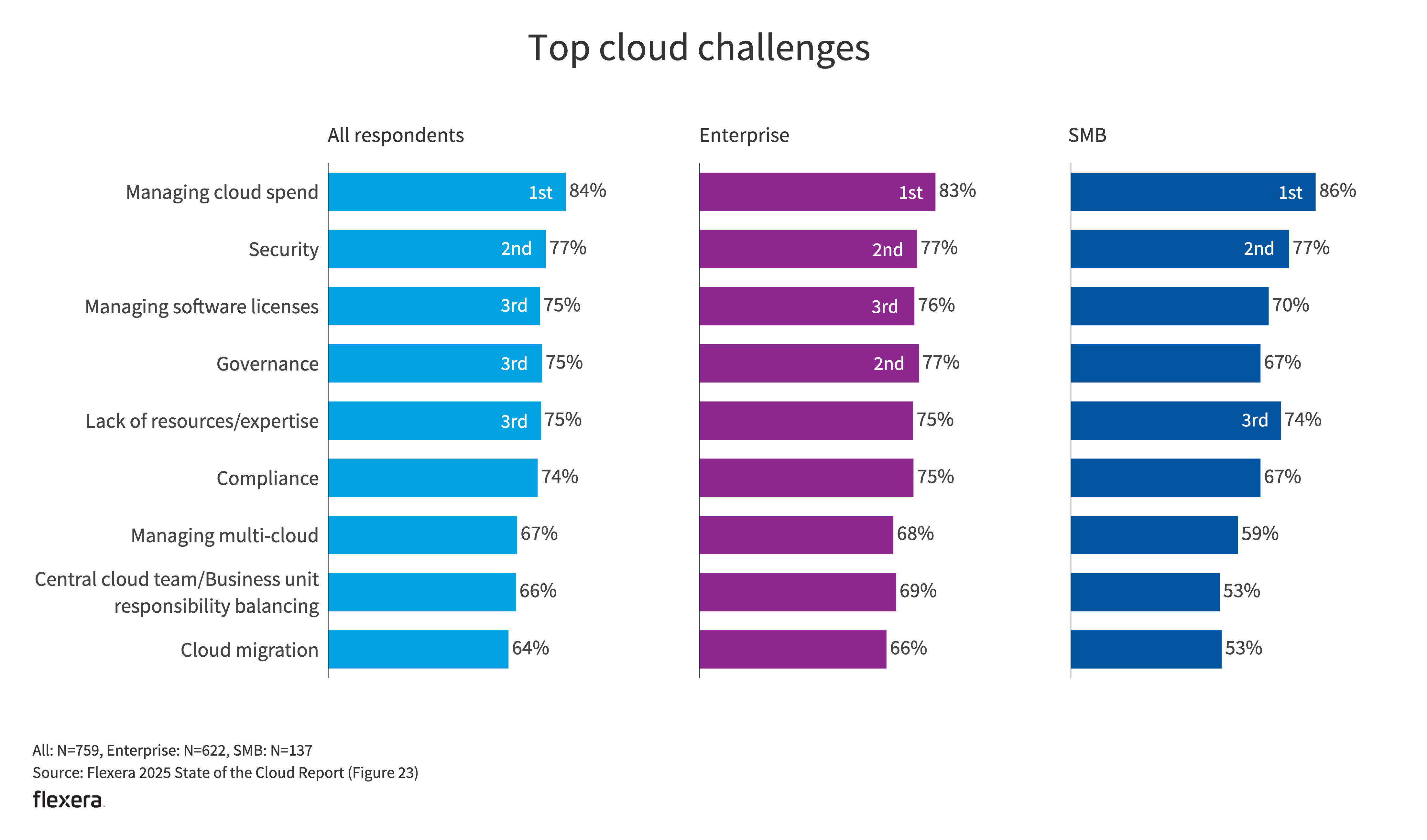 For the first decade of the report, security held the top spot for cloud challenges, but for the third year in a row, managing cloud spend (84%) is maintaining its number one spot for all respondents. As additional workloads, and the associated spend, find their way into the cloud, the need to manage and optimize this spend becomes paramount. Security always is—and always should be—a top concern in the digital age. Seventy-five percent said top challenges for all organizations include governance, managing software licenses and a lack of resources/expertise.
