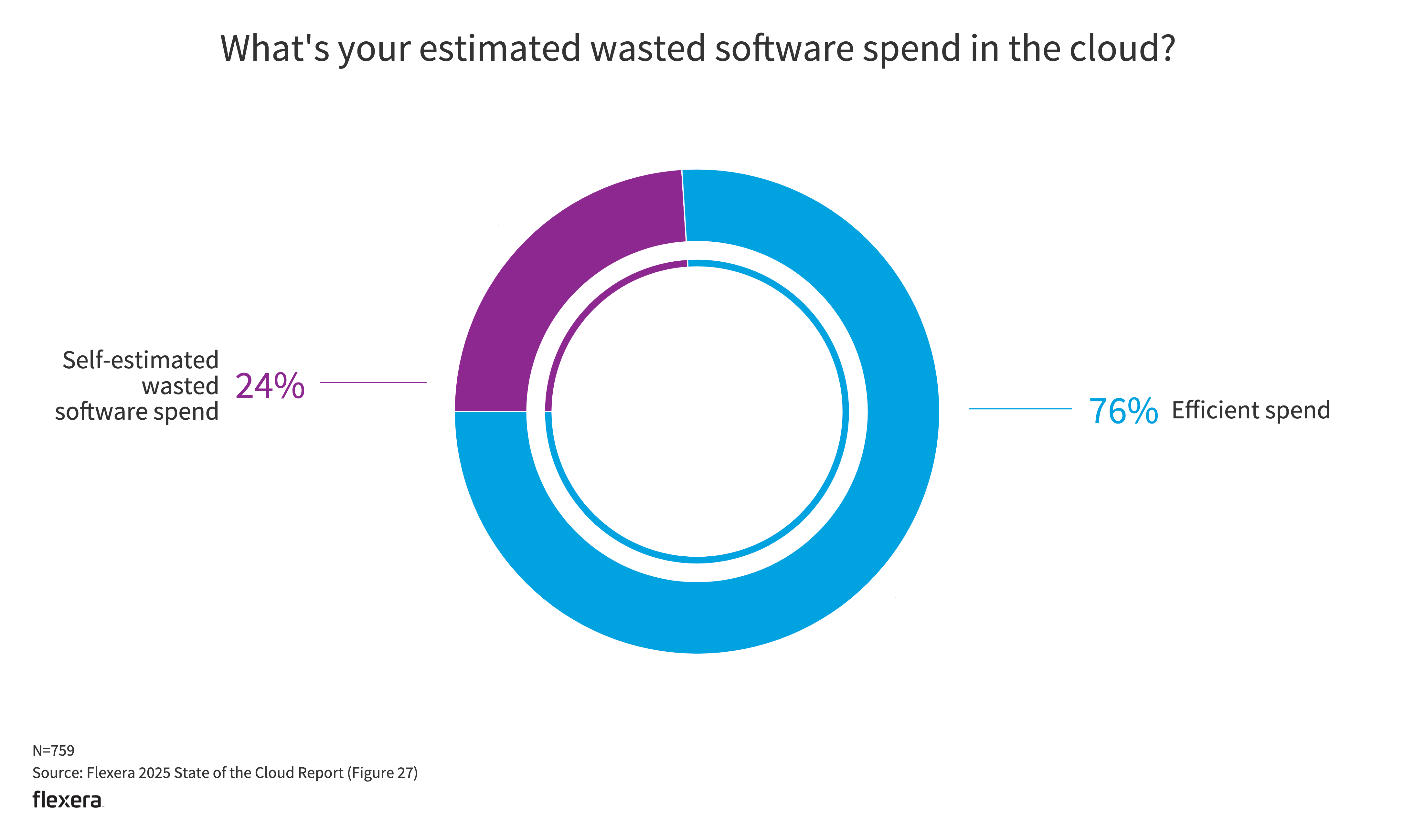 However, it’s worth mentioning that estimated wasted cloud spend is trending downward. Since reaching a high of 32% four years ago, estimated wasted cloud spend on IaaS and PaaS has decreased, reaching a low of 27% this year. It’s another indication that the implementation of FinOps practices is financially benefiting many organizations. There isn’t much change in wasted software spend this year, but software licenses can greatly impact the total cost of an application running in the cloud. Respondents reported that wasted software spend in public cloud was 24%.