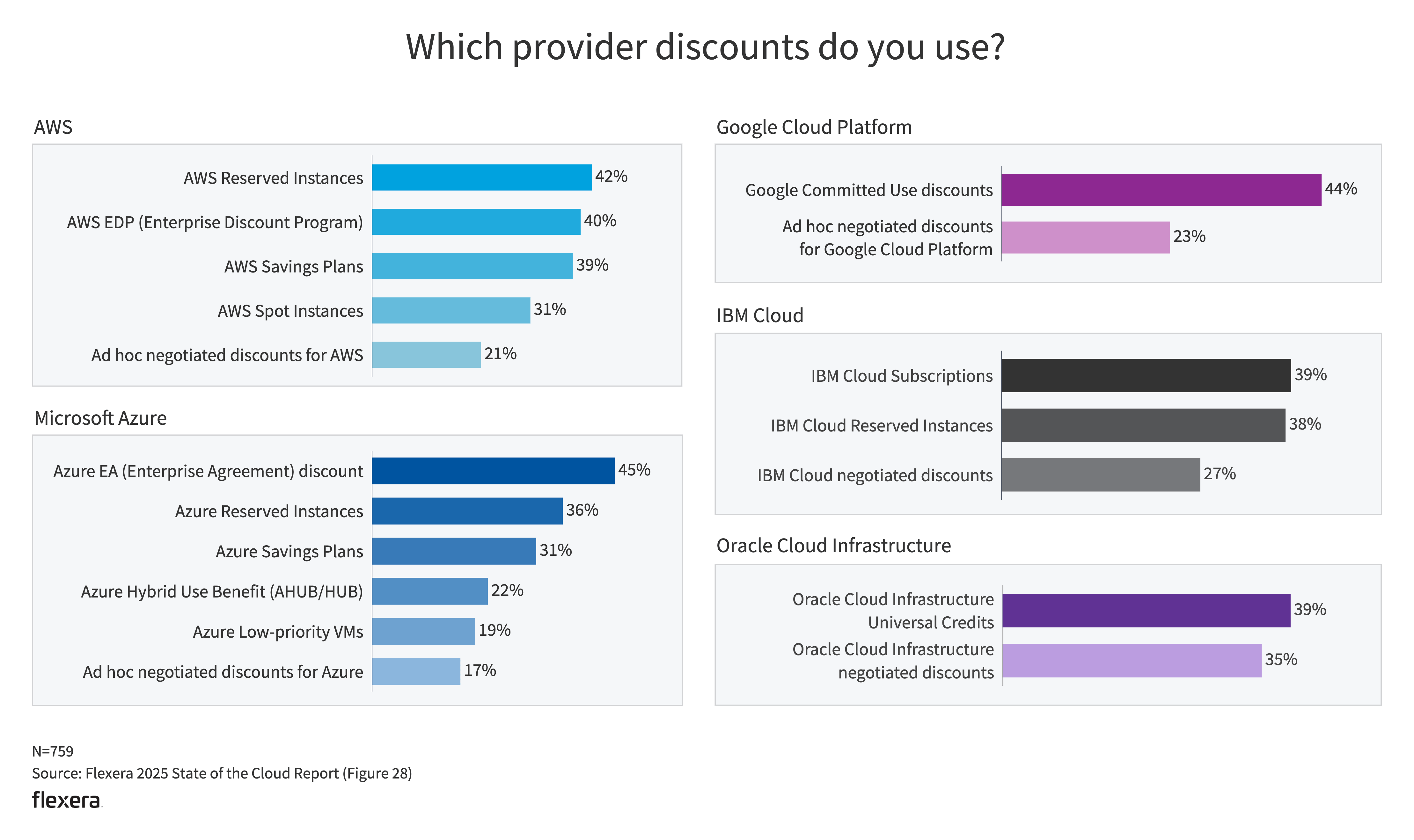 Provider discounts are one way organizations can rein in costs. In particular, reserved instances and savings plans can help organizations achieve significant discounts, but they’re still utilized by less than half of the respondents. Bespoke negotiated discounts are more common with Oracle (35%) and IBM (27%) than with other providers. This is most likely due to existing contractual relationships with these providers for other services that are leveraged to obtain cloud consumption discounts.