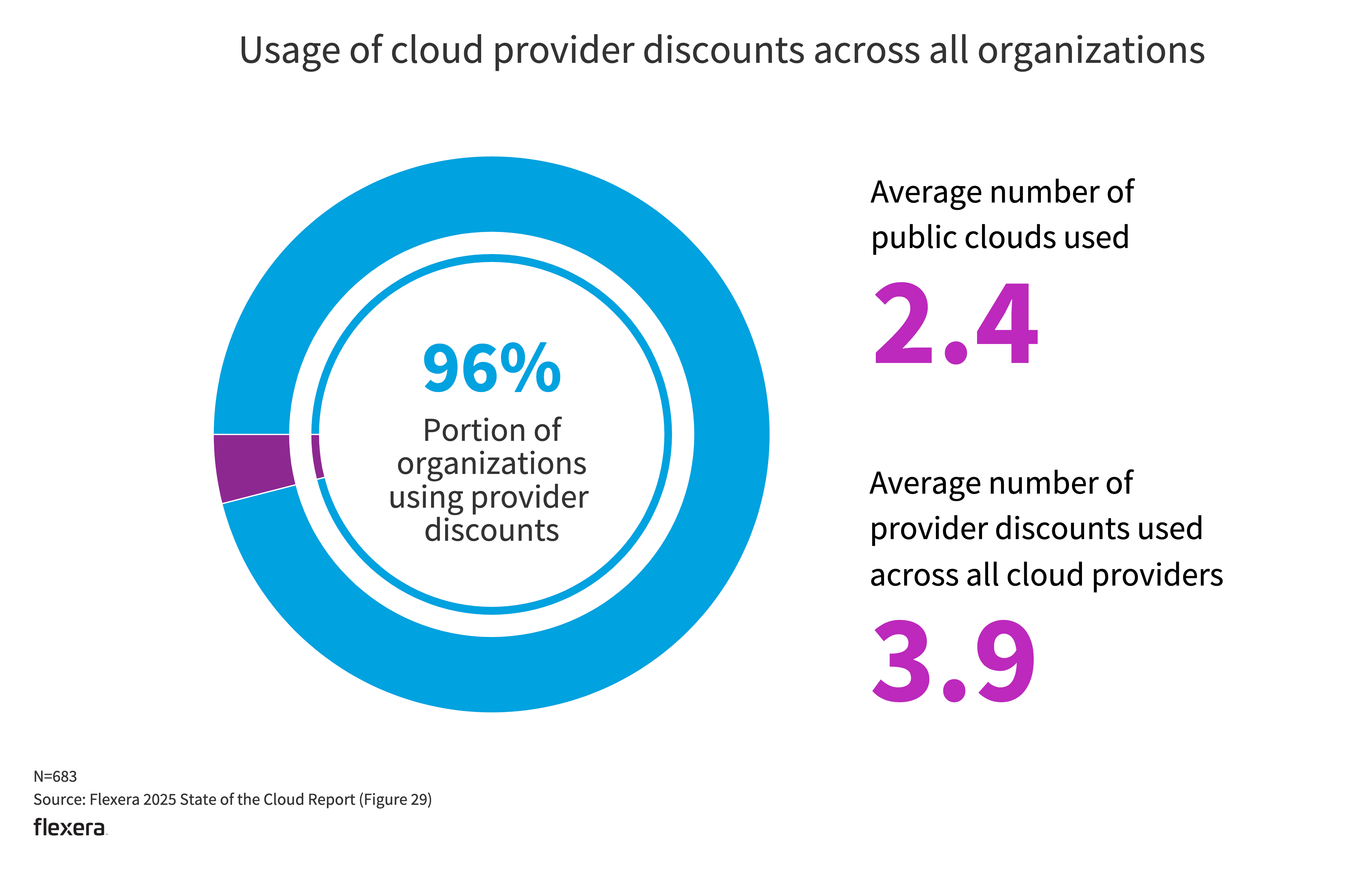 Interestingly, almost all respondents (96%) are using at least one of the cloud provider discount options. The average number of public clouds used is 2.4, and the average number of discount options used across all cloud providers is 3.9. This is good to see, but there’s still room for additional discounts to be used for most organizations.