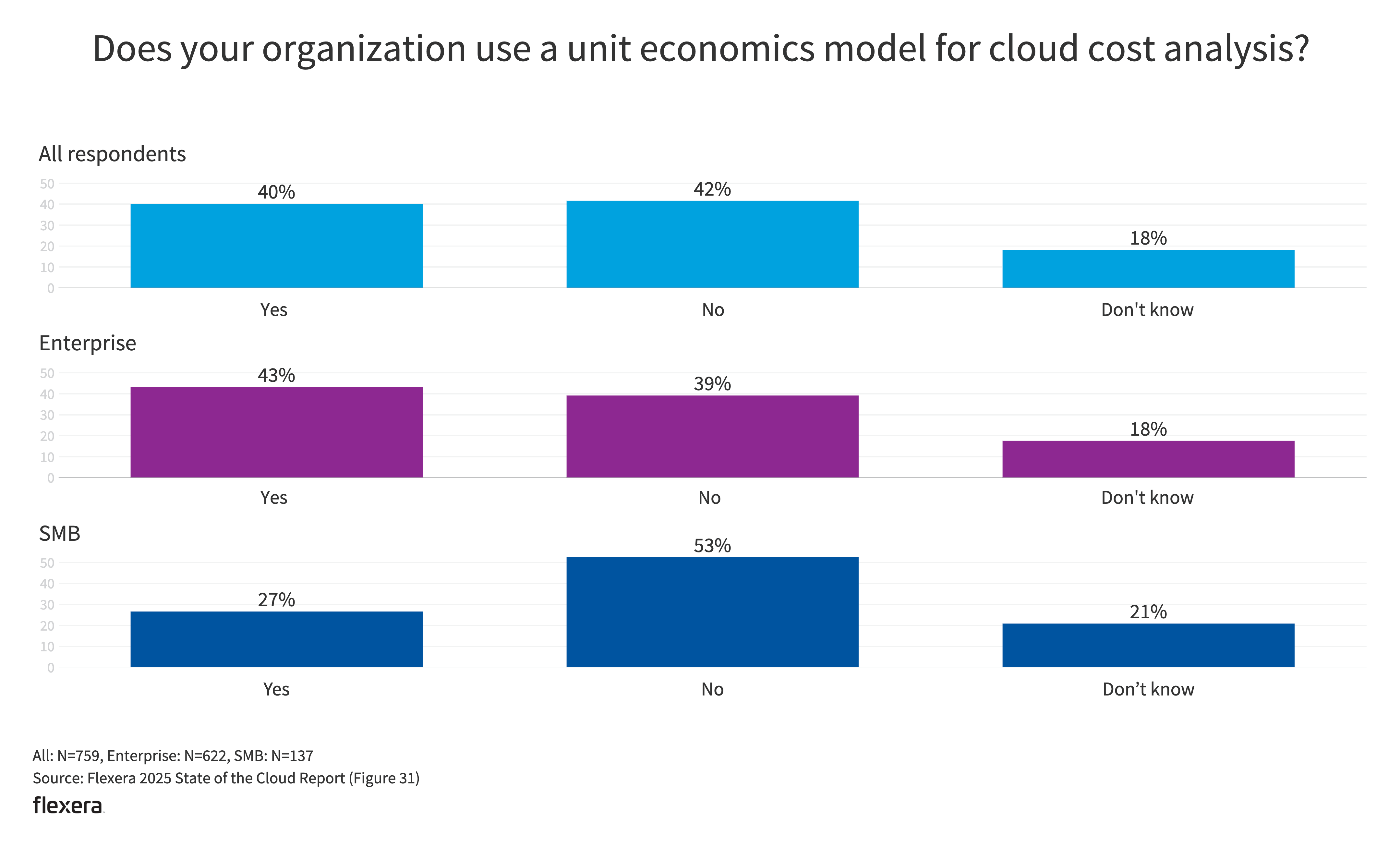 Enterprises are much more likely than SMBs to use a unit economics model (43% for enterprise, 27% for SMB). This emphasizes the idea that enterprises are typically more mature with regard to their FinOps practices, and they may be further down the path to finding and using a unit metric to measure the return on their cloud investment.