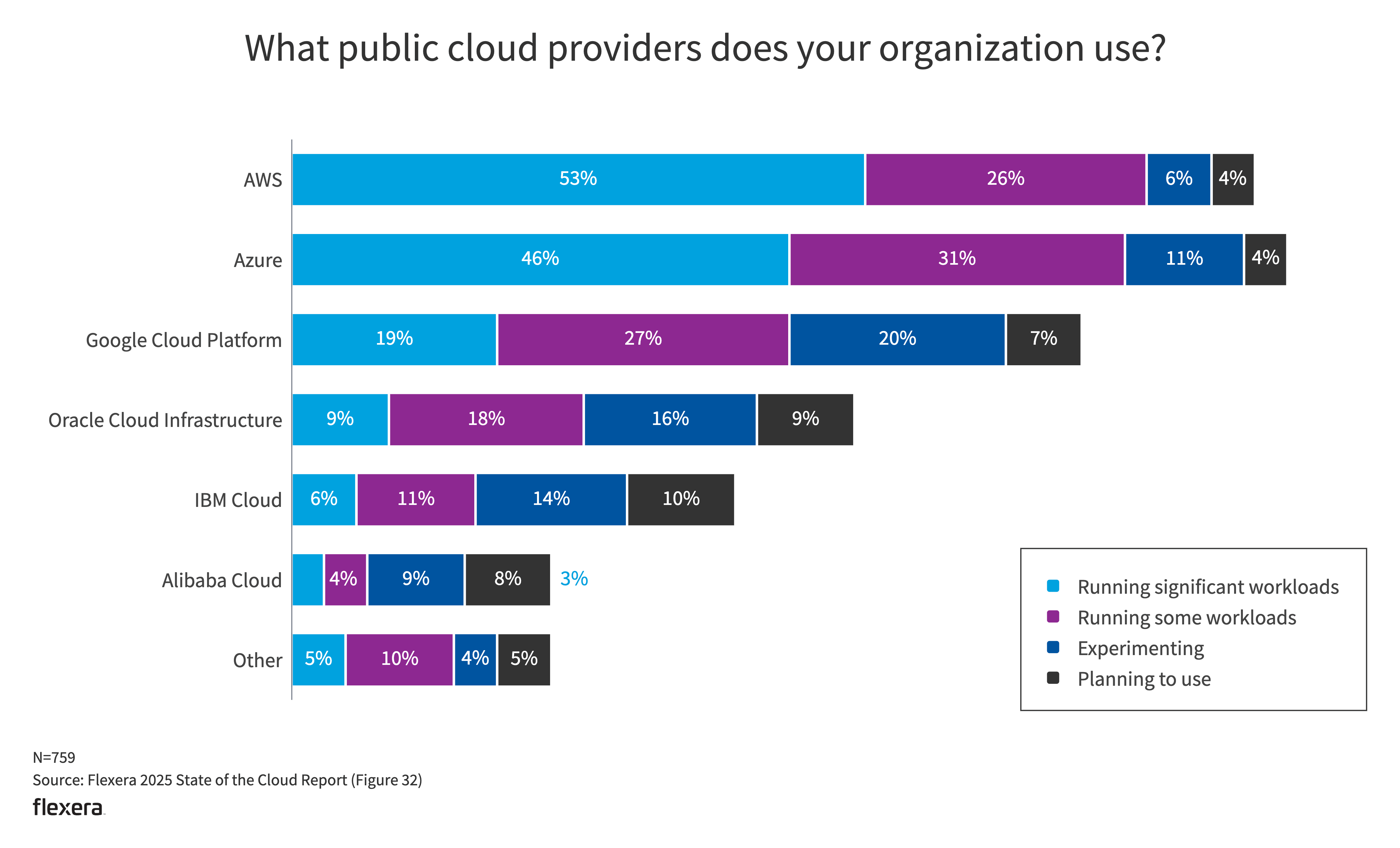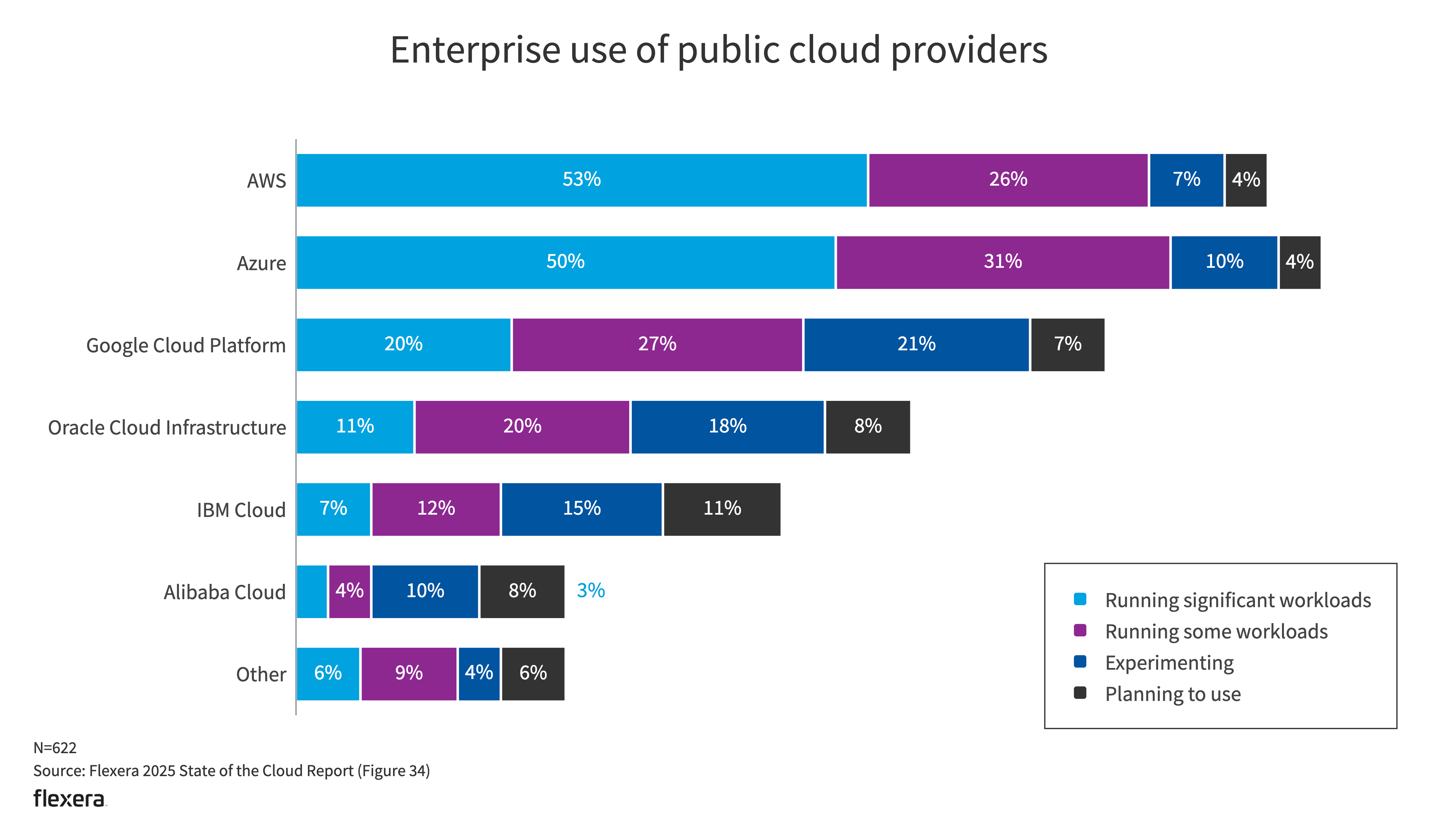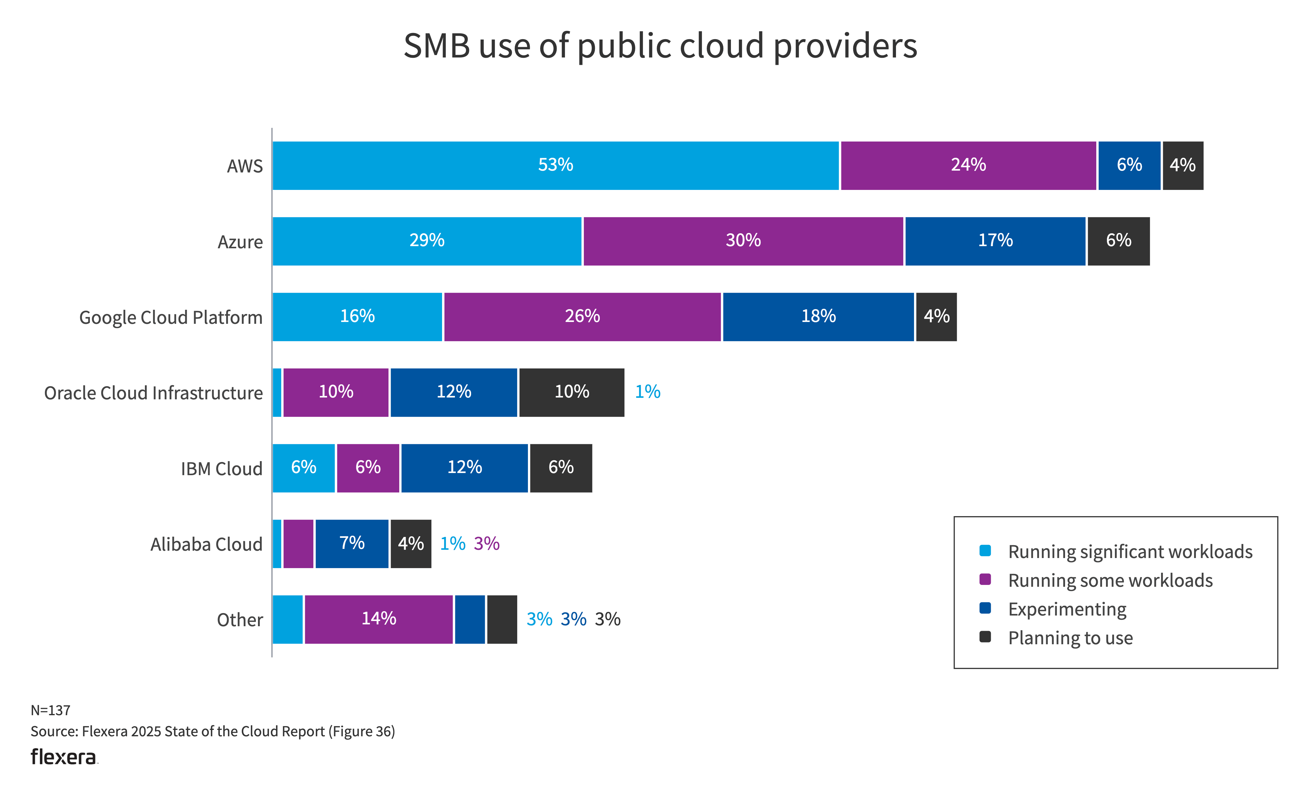 With cloud use growing, AWS and Azure continue to run neck and neck among surveyed enterprises, but AWS maintains a lead among SMBs. In fact, 53% of SMBs are using AWS compared to 29% using Azure. Google Cloud Platform continues to hold the third spot this year, with nearly half (46%) of all organizations running some or significant workloads on it. The provider also continues to hold the top spot among organizations experimenting with public cloud.