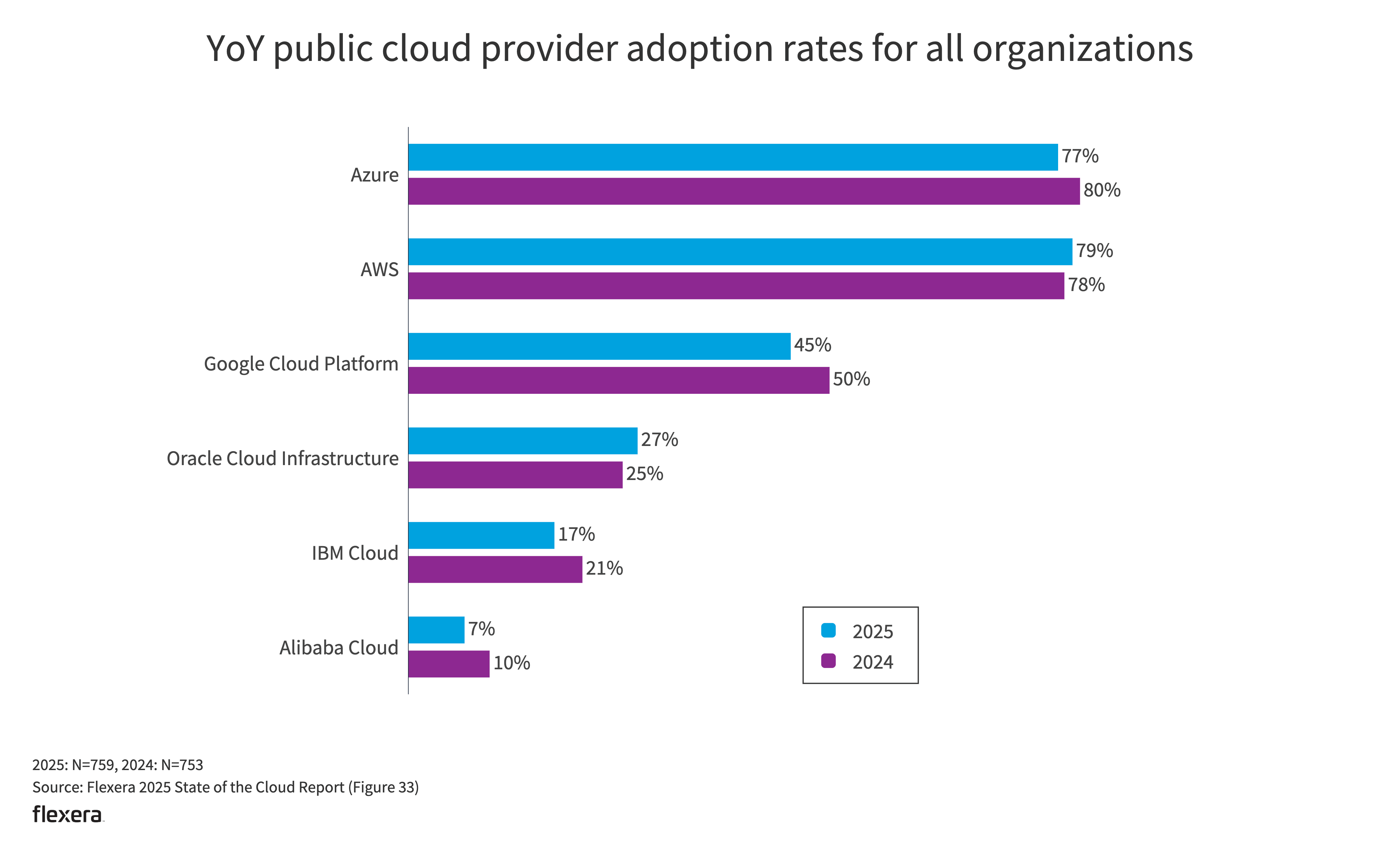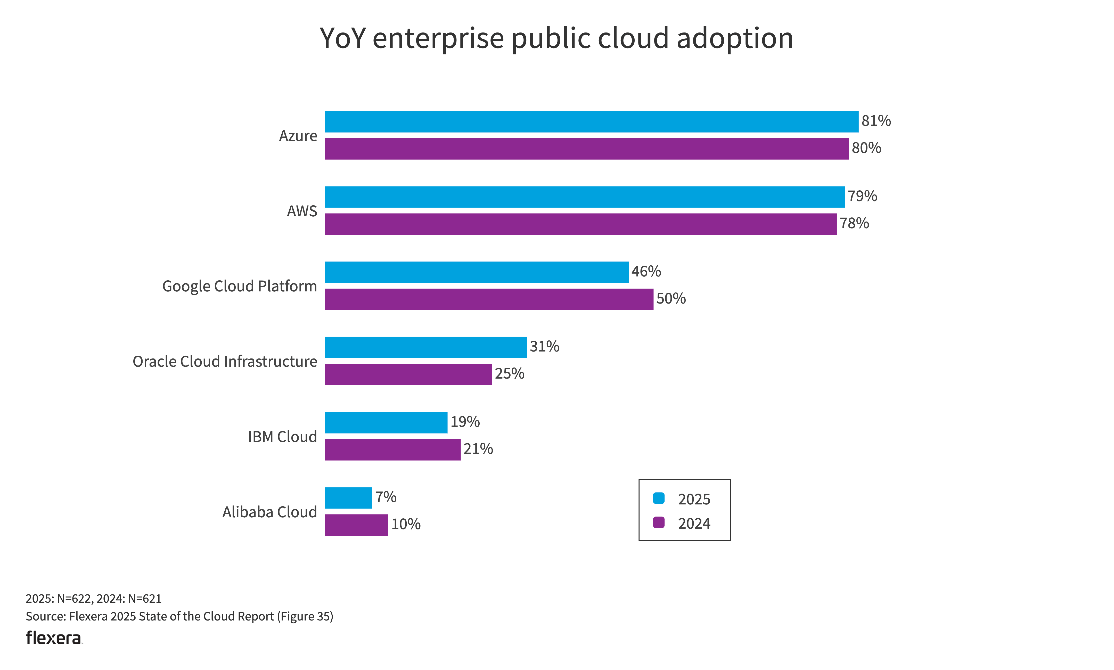 Year over year, there was very little change among the leaders. This again supports the ongoing theme that many organizations seem to have found their steady state regarding the clouds they’re using.