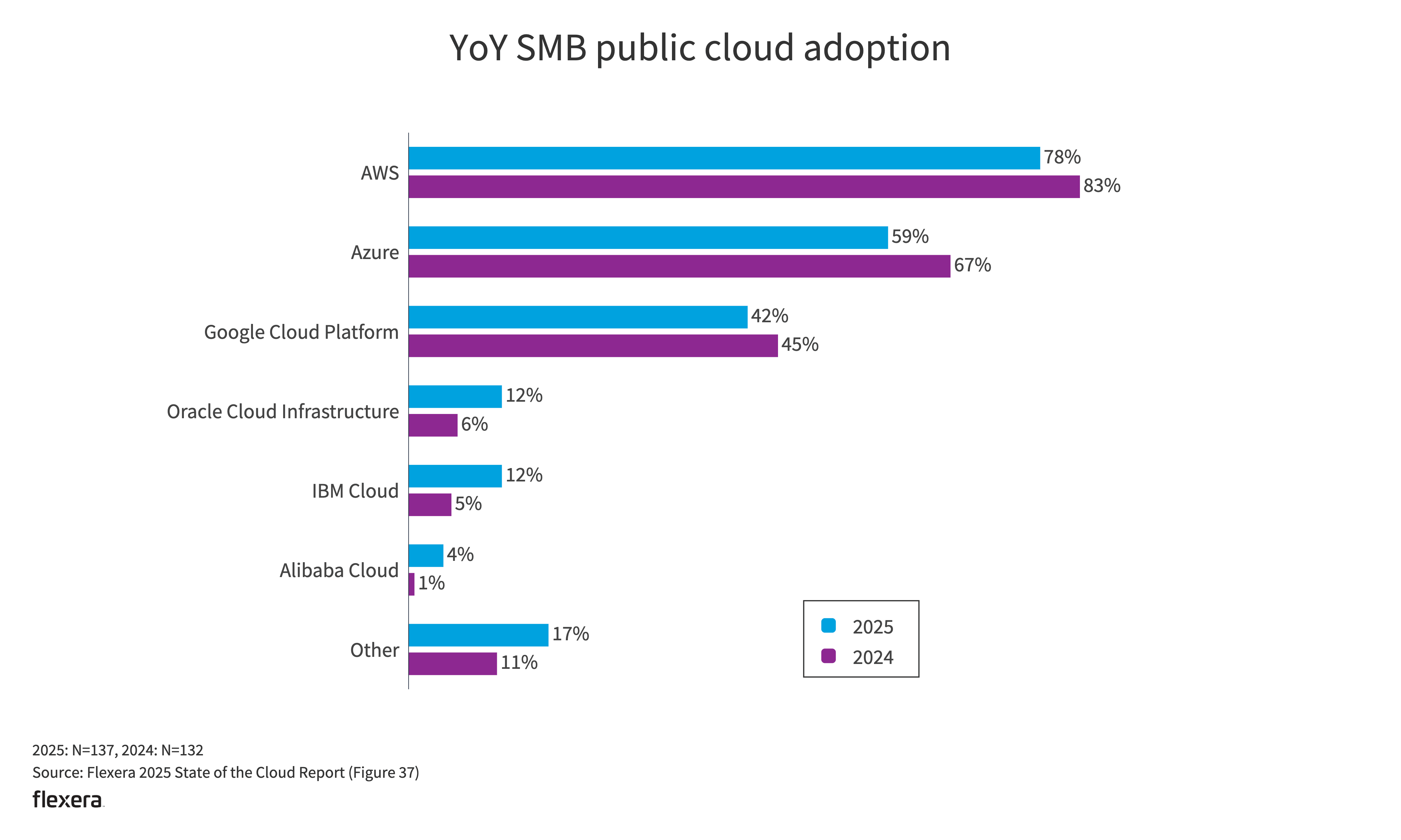 Diving into the year-over-year analysis, it’s noteworthy that this is the first year we’ve seen a decrease in adoption for both AWS and Azure for SMBs. Google Cloud Platform also dropped slightly, but interestingly all others saw increased usage by SMBs.