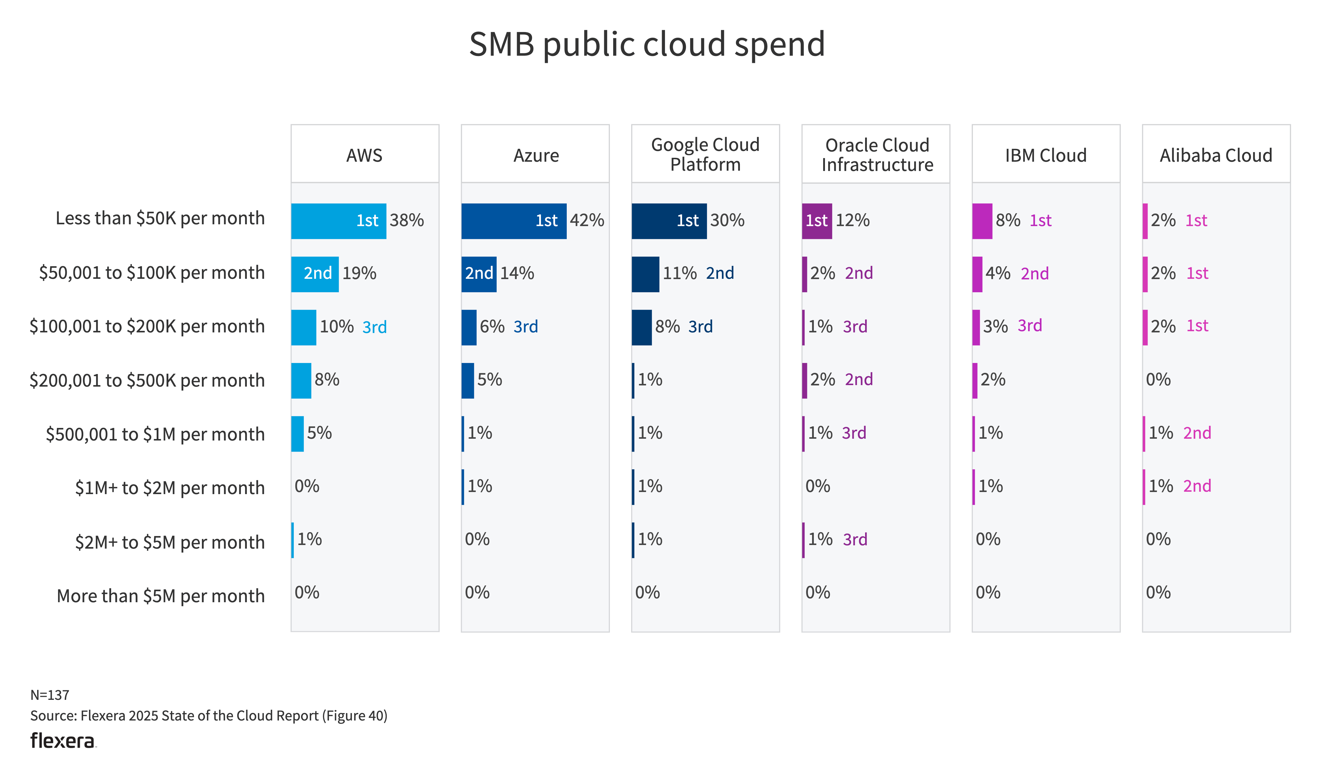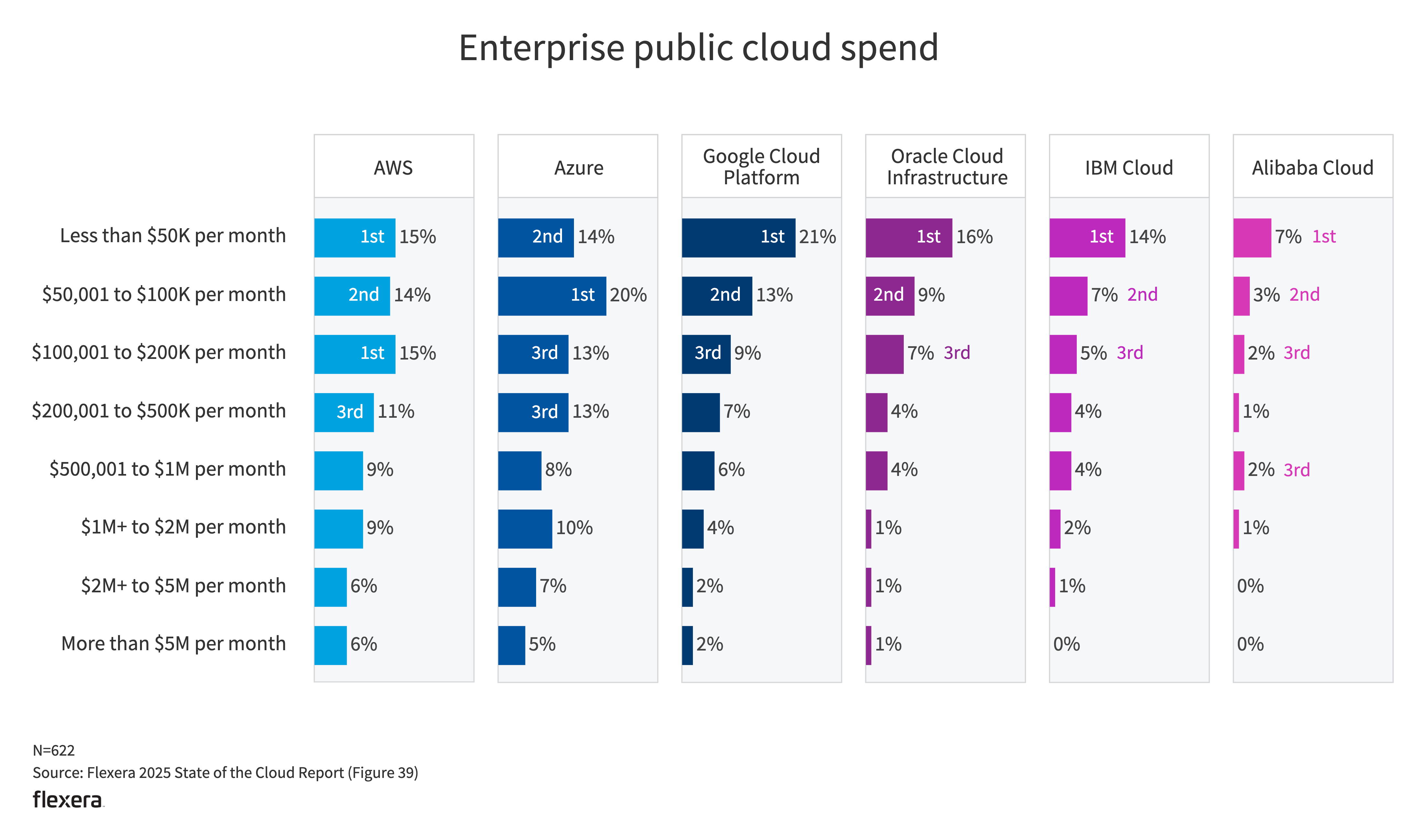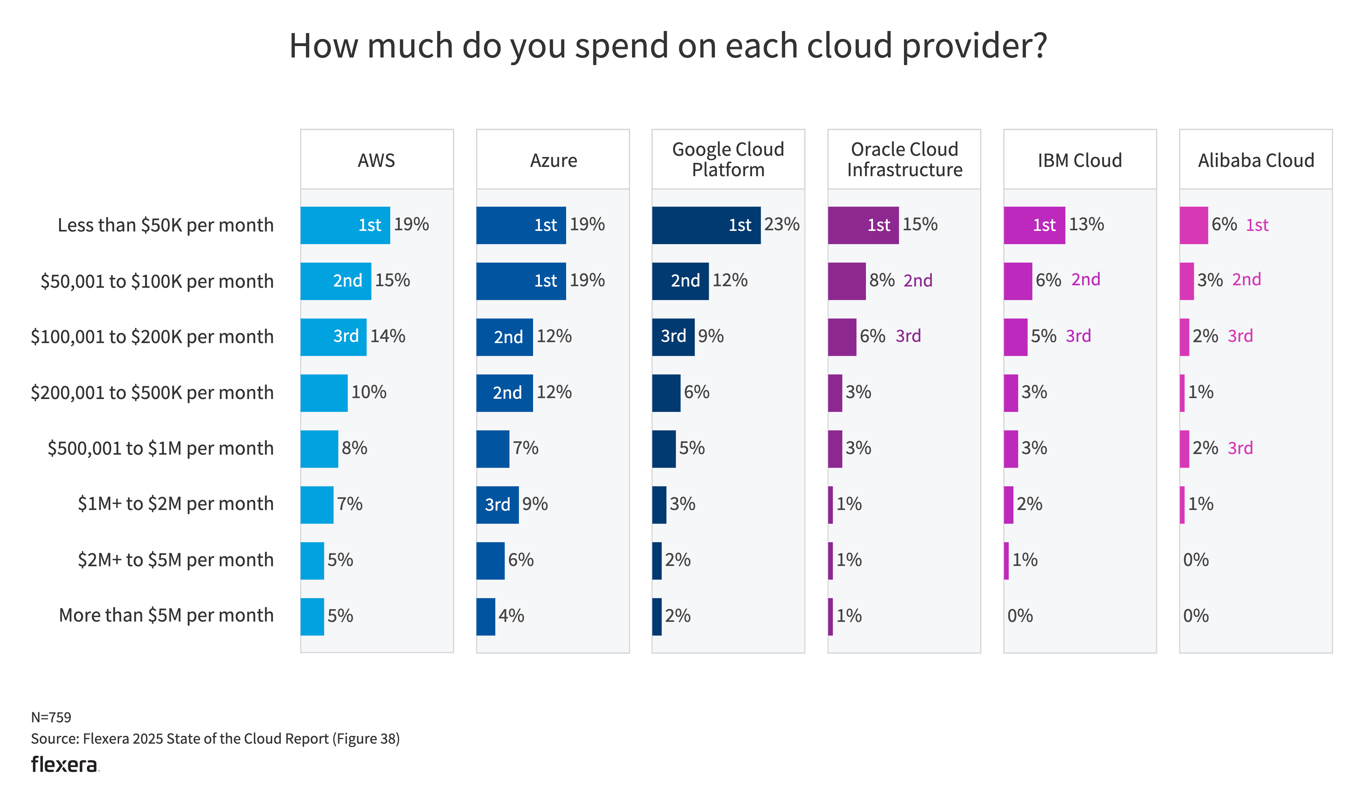 For those spending less than $50,000 monthly, Google Cloud Platform leads