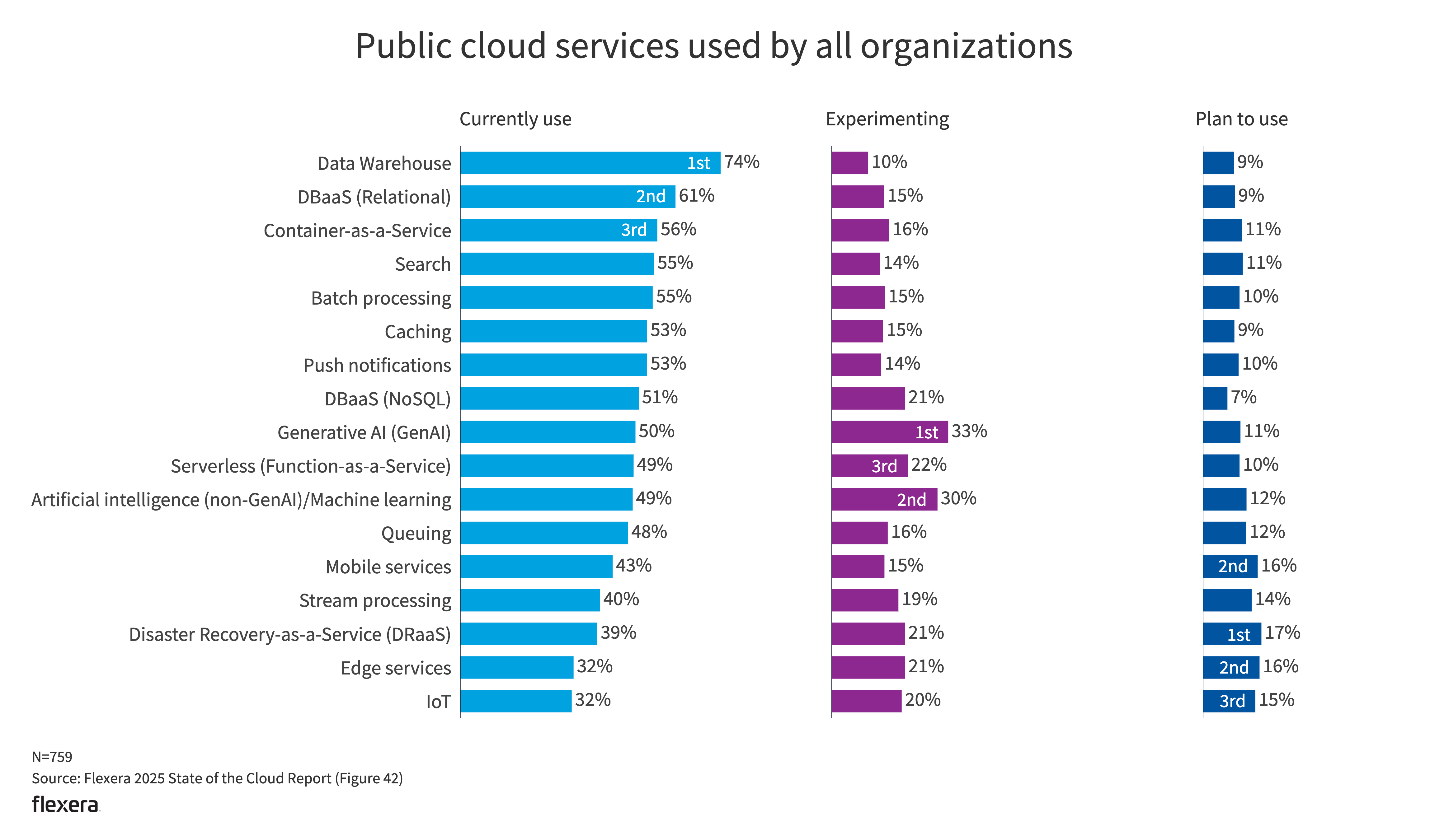 This is the first year generative AI (GenAI) was included as an option for public cloud services used by all organizations, and it’s currently being used by 50% of respondents, which is the largest value ever recorded for a new service added to the list.