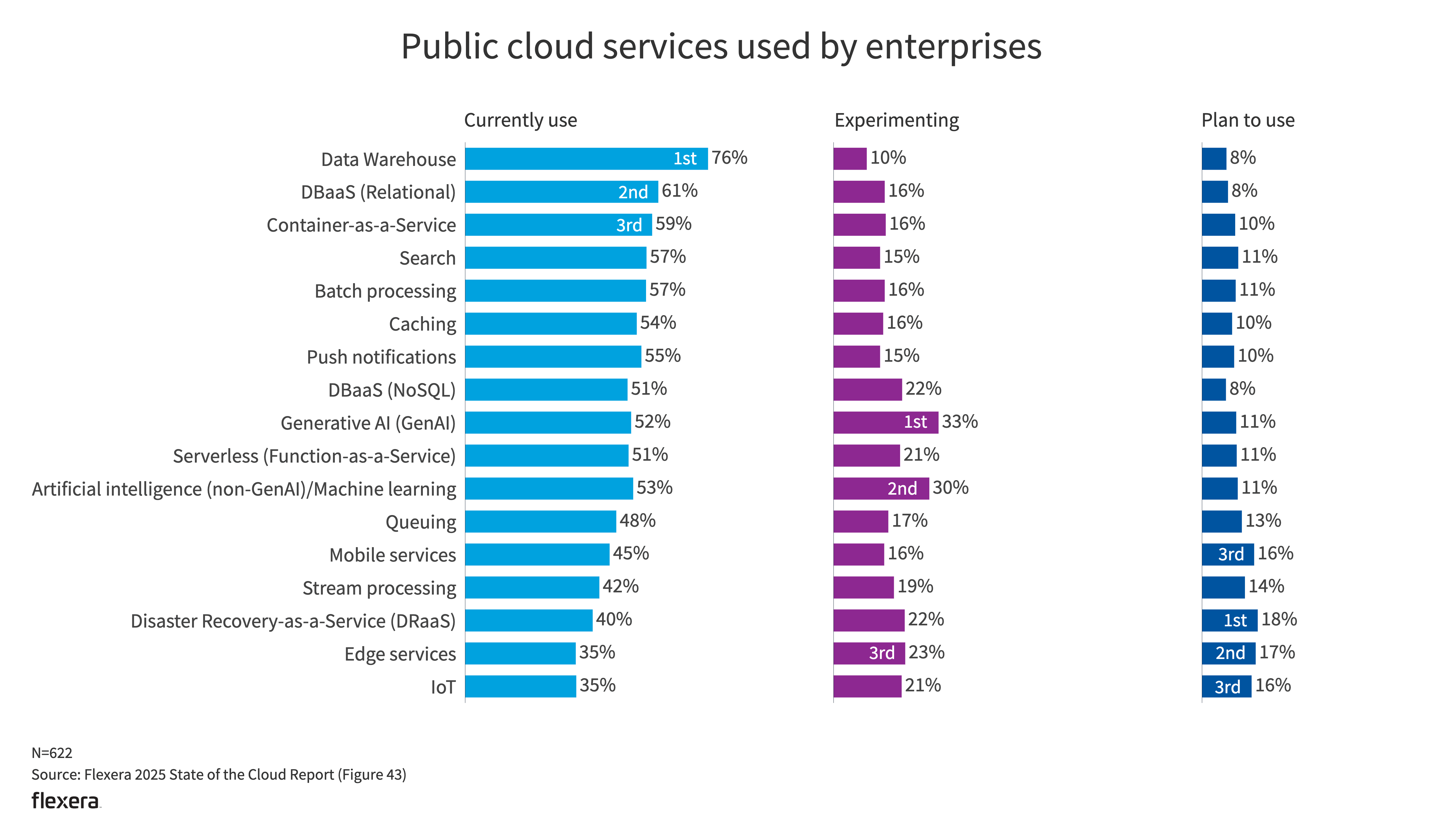 Enterprise usage of PaaS offerings tracks consistently with all respondents. As usual, data warehouse topped the list of services used by enterprises at 76%, which is up from 67% last year, and respondents are experimenting most with GenAI and AI/ML compared to other services.