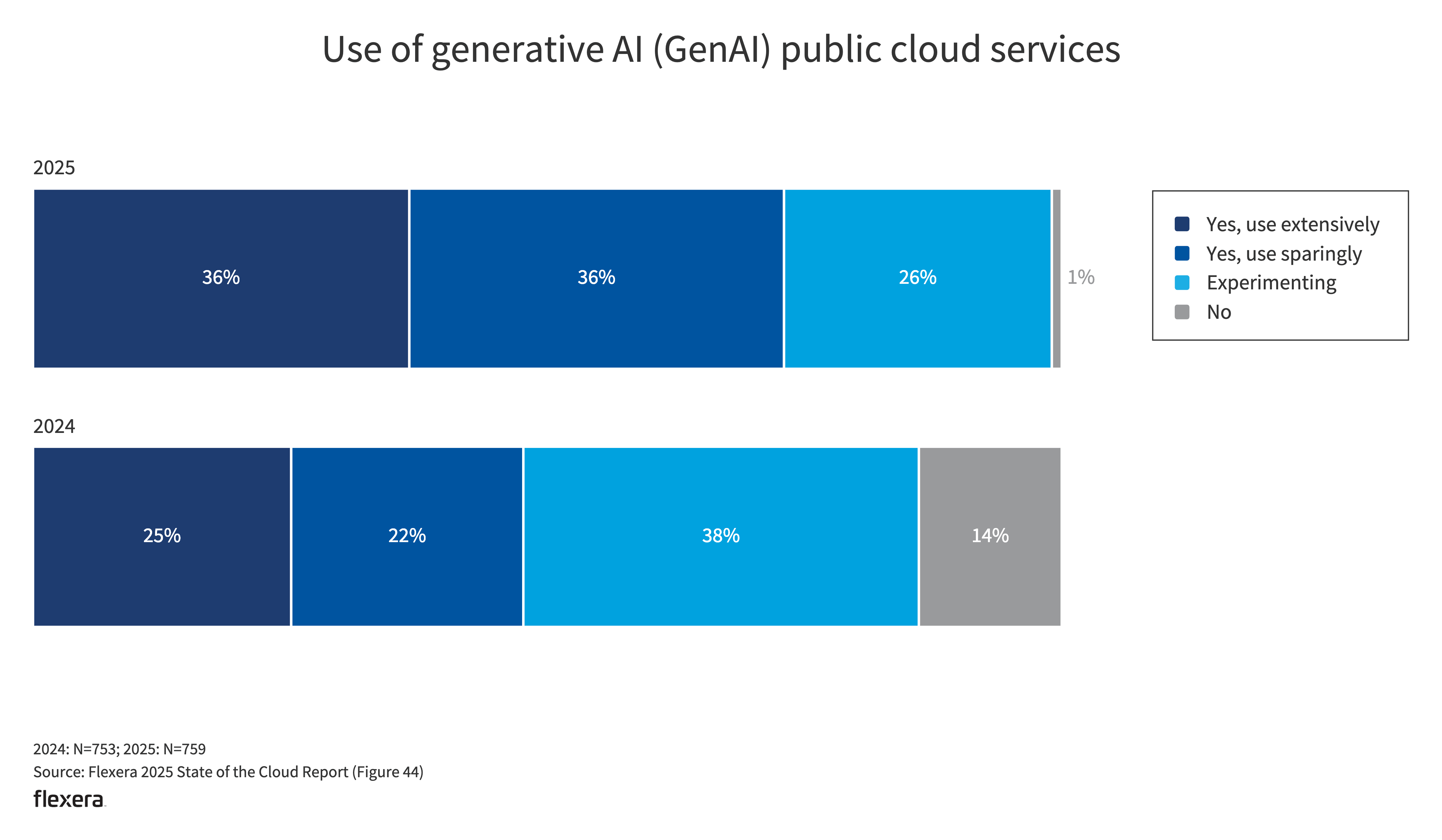 Usage of GenAI public cloud services increased significantly from 47% using it last year (either sparingly or extensively) to 72% this year. Additionally, the respondents who said they don’t use GenAI dropped from 14% last year to just 1% this year.