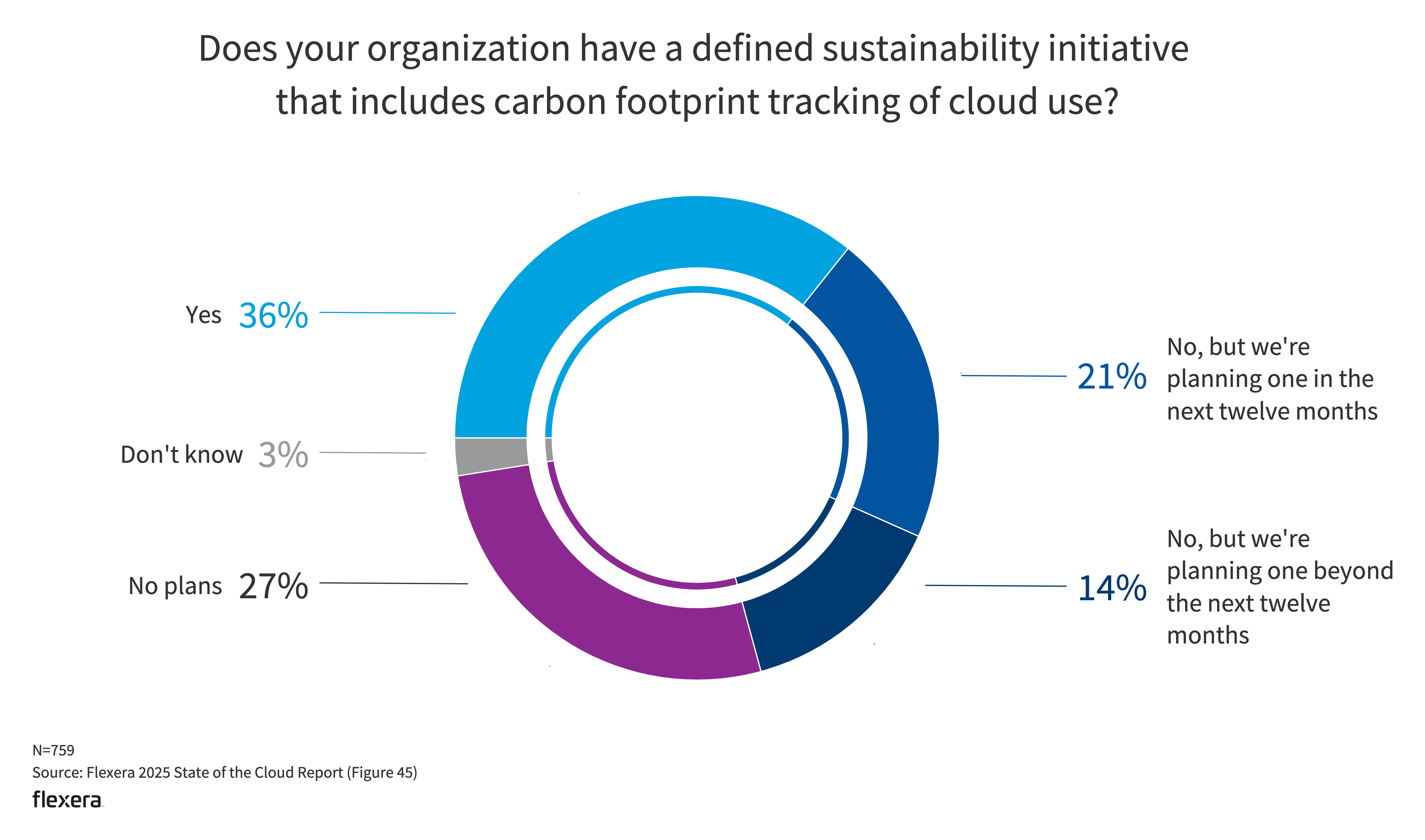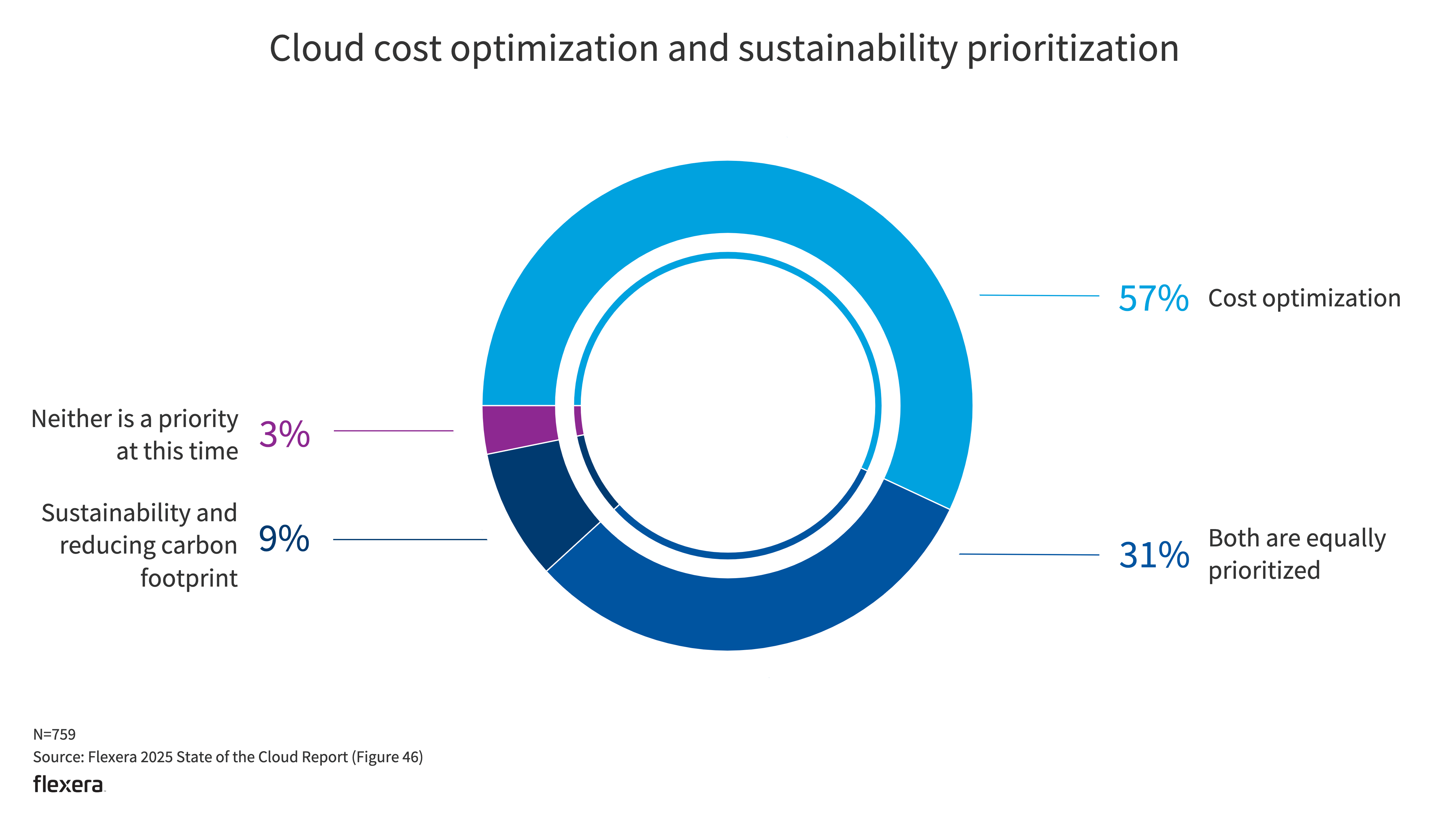 Over half (57%) of respondents indicated they either have or plan to have a defined sustainability initiative that includes carbon footprint tracking of cloud use in place within twelve months. Not surprisingly, saving money is still top of mind. Fifty-seven percent say they prioritize cost optimization over sustainability, and 31% report equal prioritization. We expect to see this number grow as sustainability requirements—both internal and mandated through government regulation—continue to take effect.