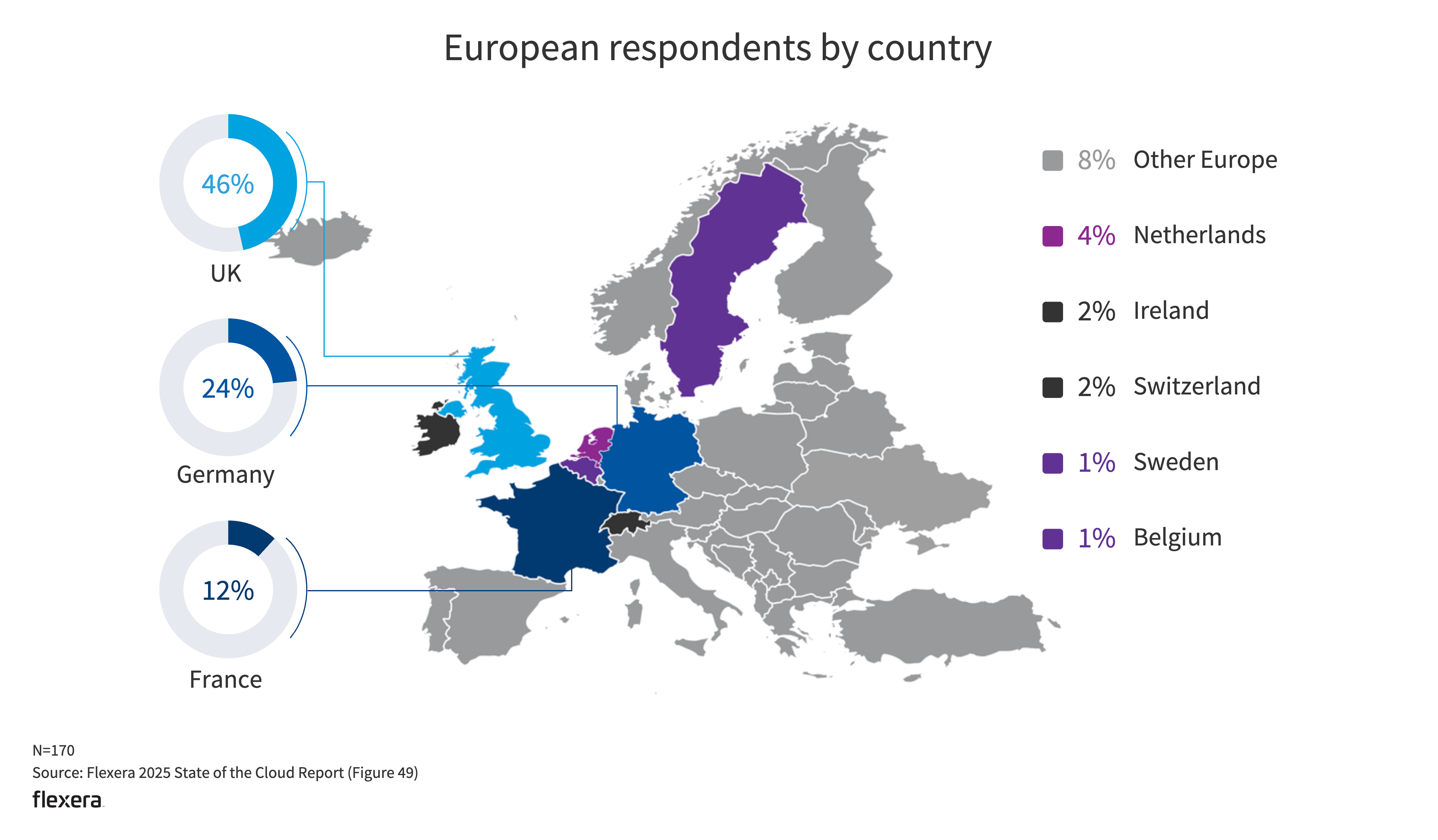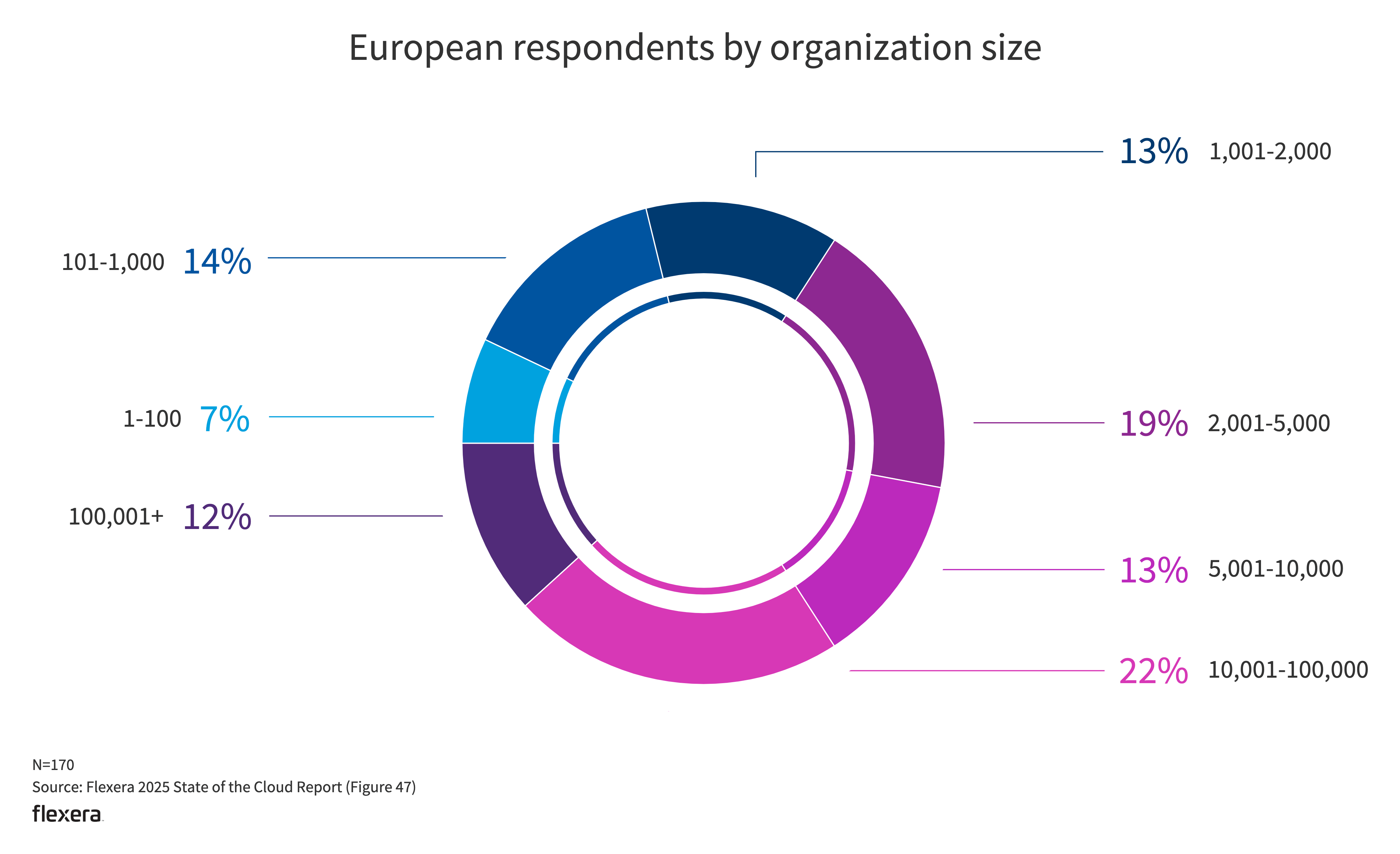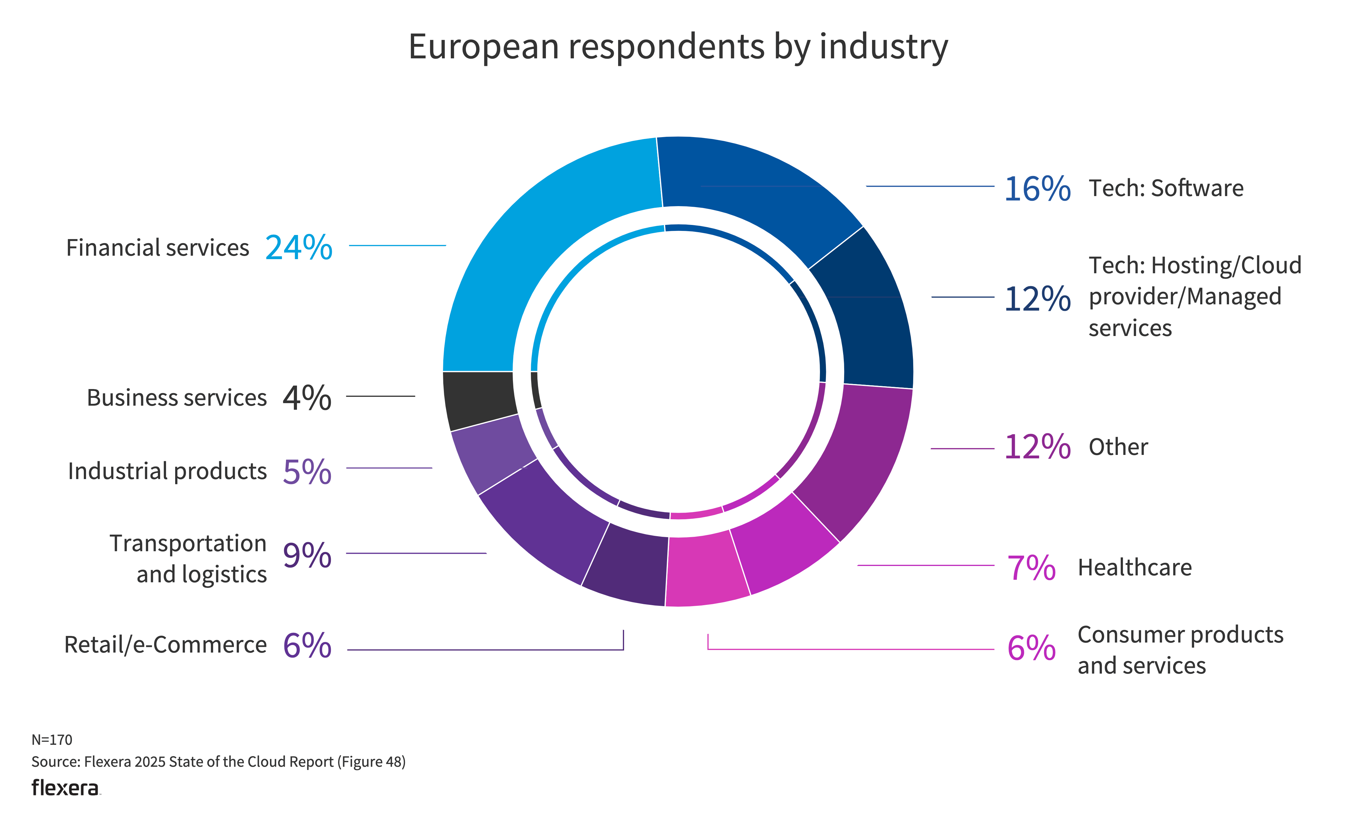 European respondents had a similar distribution compared to the global respondent pool, and the survey skews toward enterprises with more than 5,000 employees. Most European respondents are from financial services and tech: software, which is the same for global respondents.