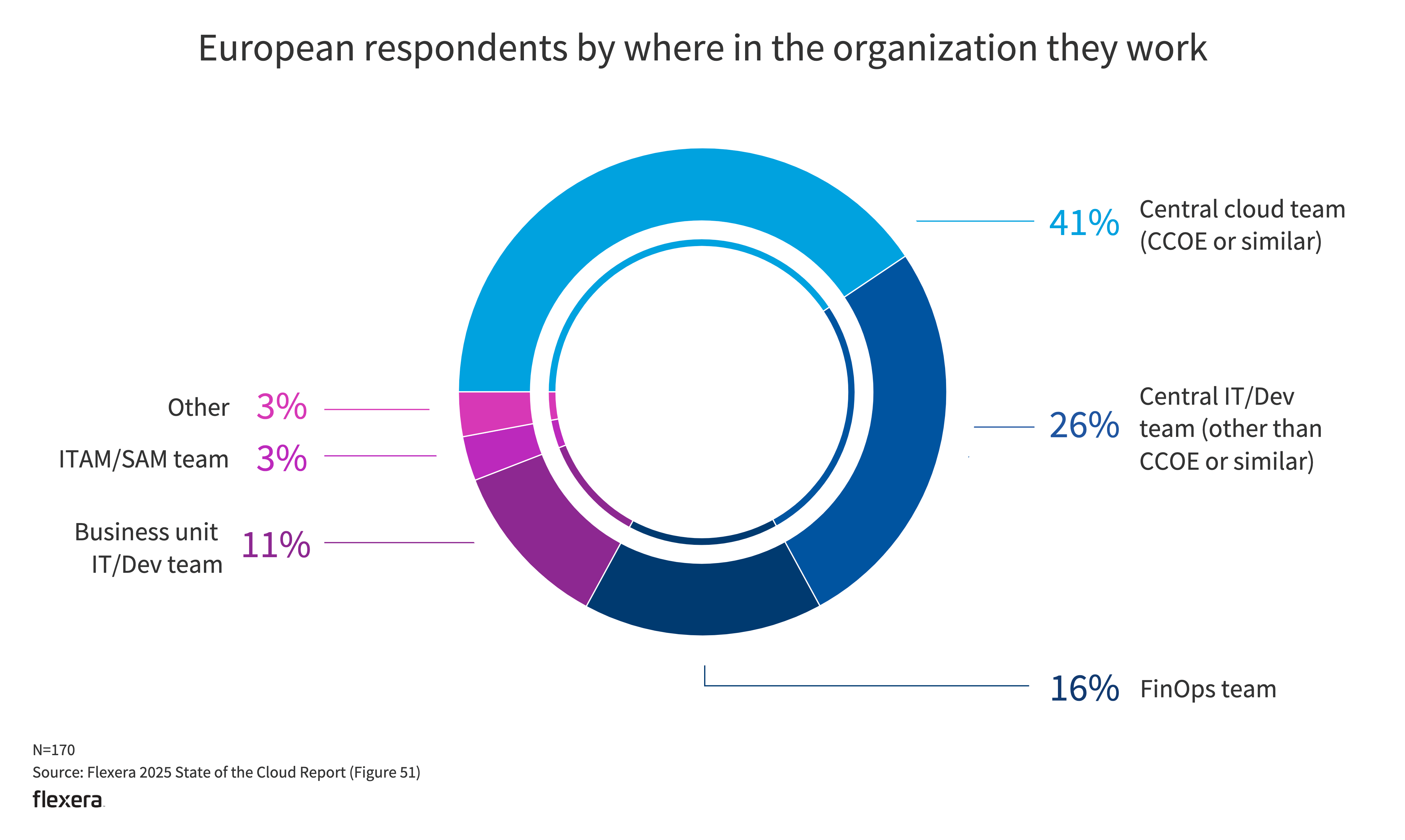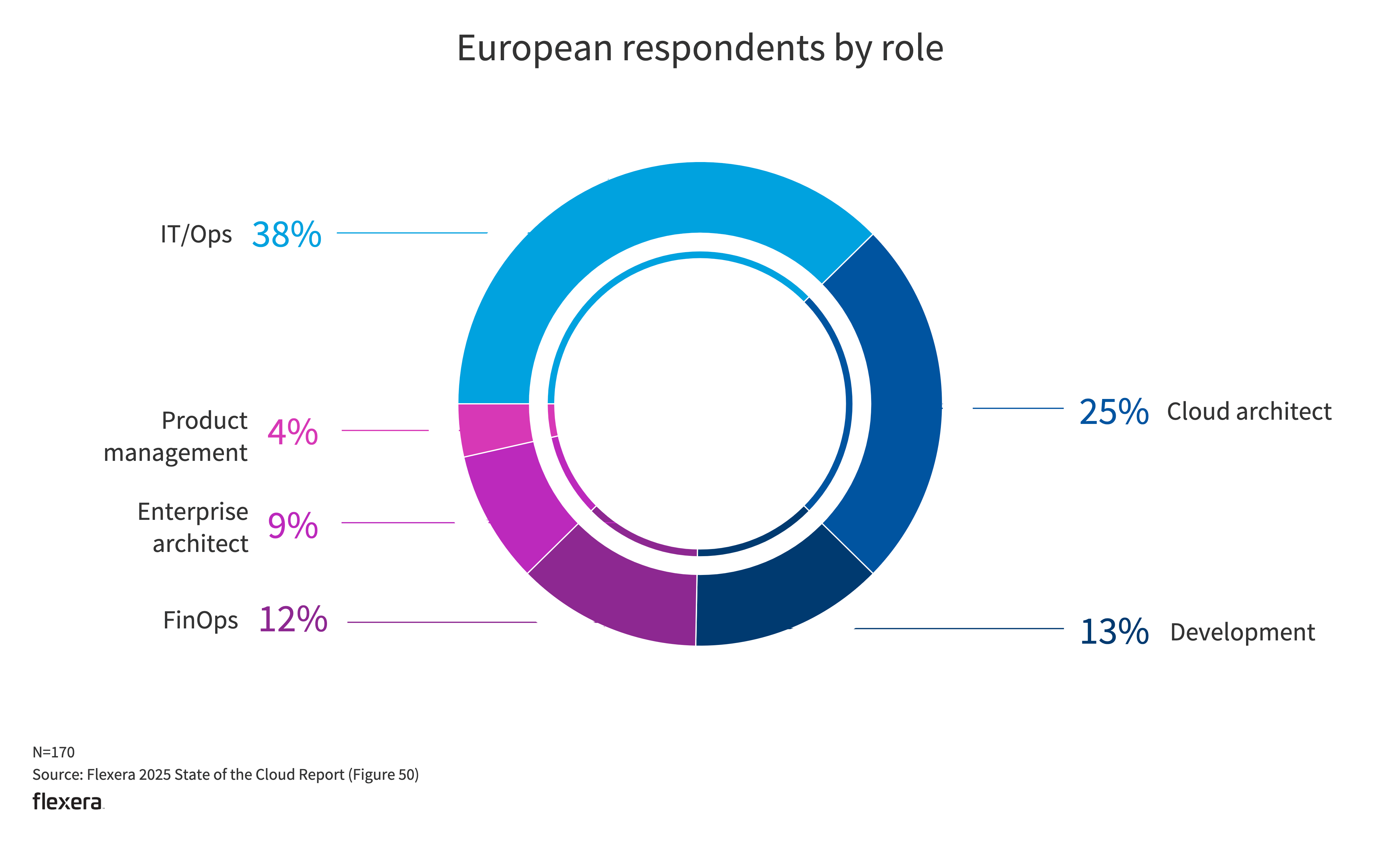 As with global results, IT/Ops (38%) represented the highest percentage of respondents. We saw the greatest increase in Europeans who work on a FinOps team (16%), up from only 3% last year.