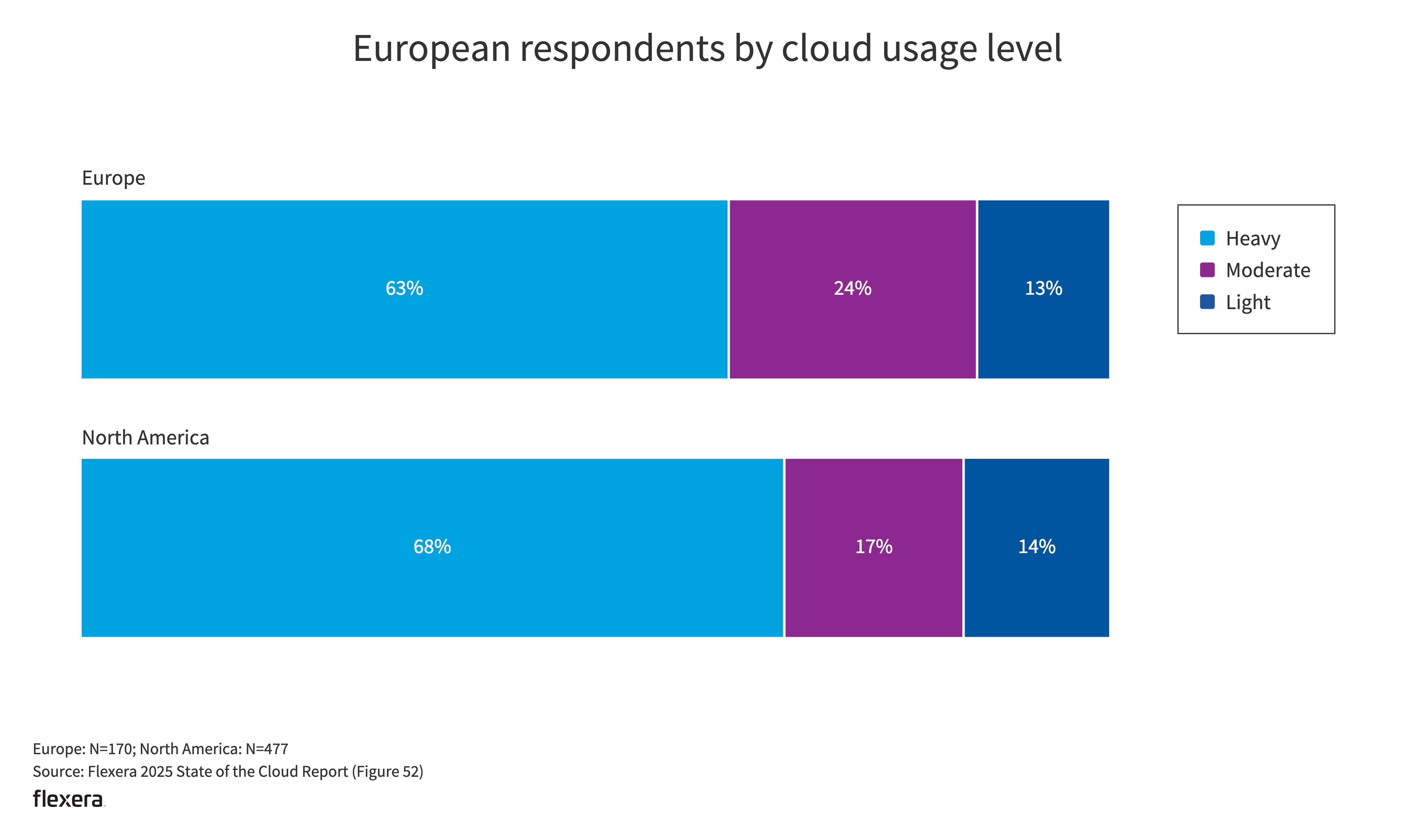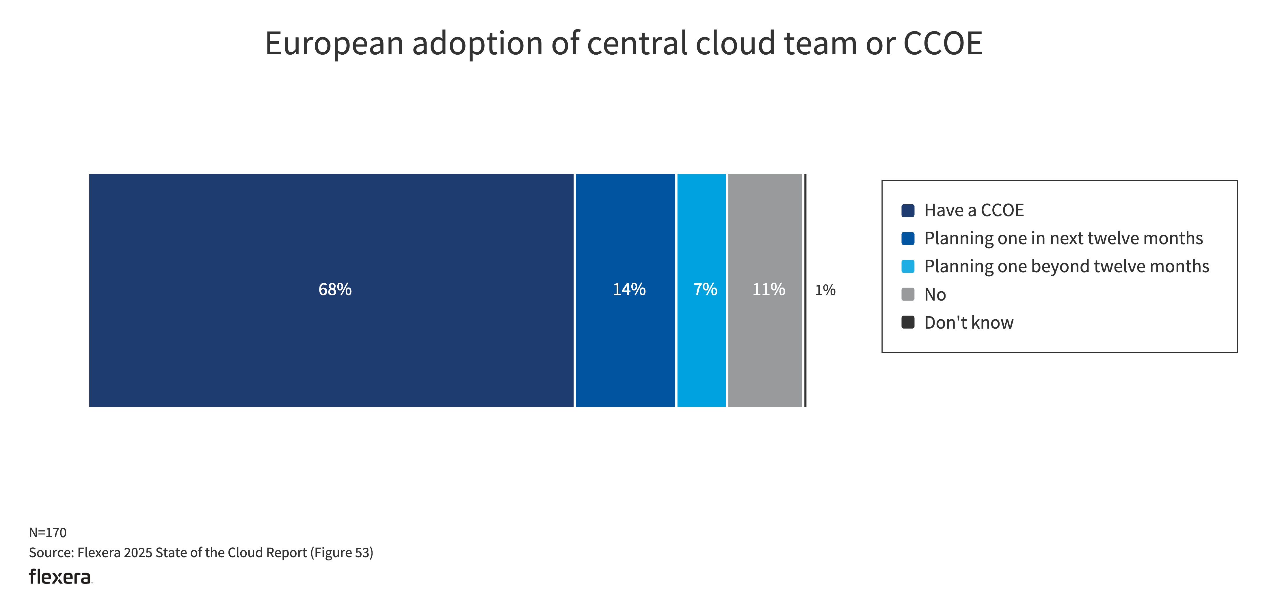 Most European respondents were heavy cloud users, although this amount decreased from last year (73% to 63% year over year), and moderate users increased to 24% from 15% year over year. Over two-thirds (68%) have a central cloud team or CCOE, and another 14% plan to have one in the next year, further supporting the trend that FinOps best practices are going to become the norm, if they aren’t already.
