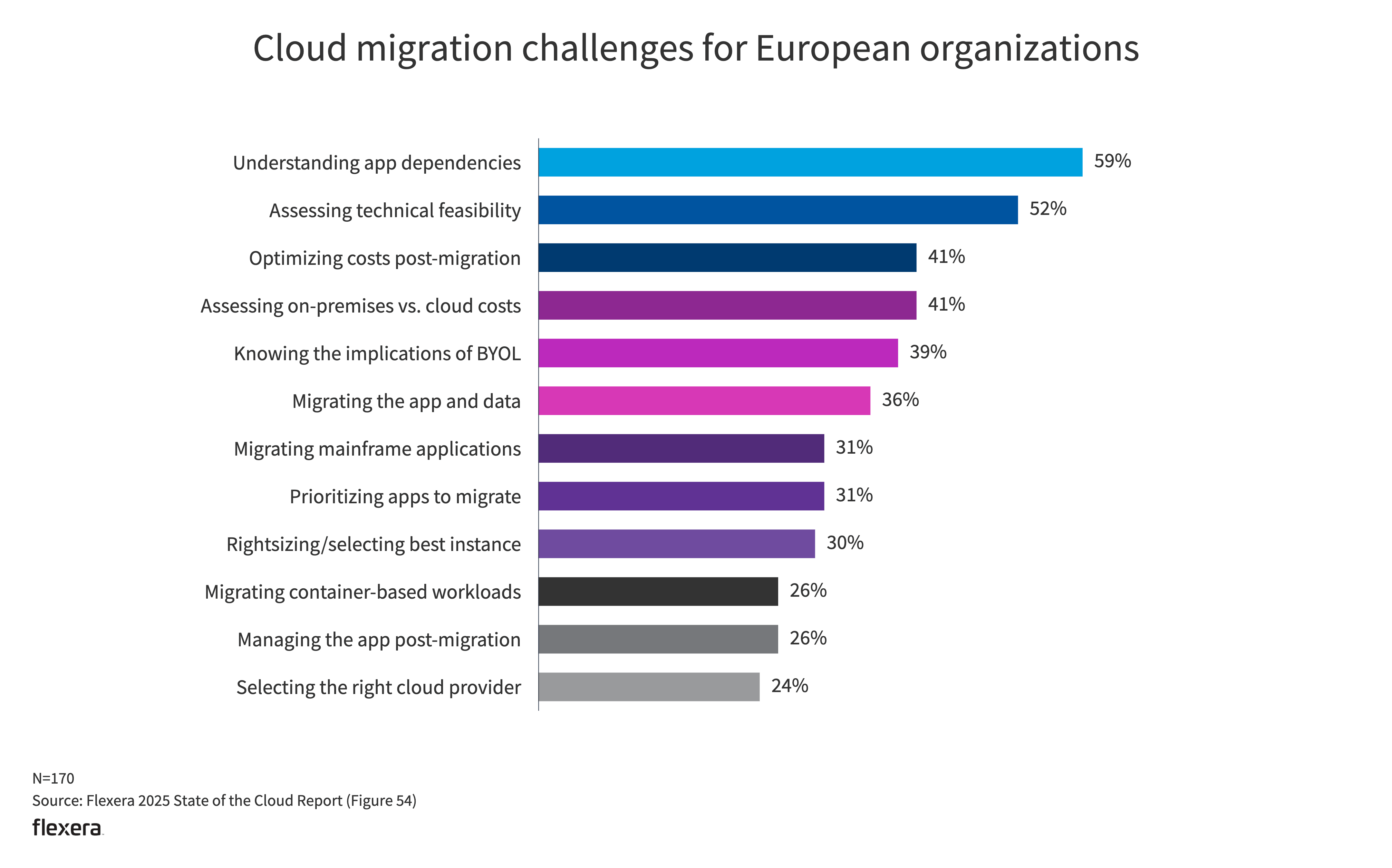 The top European cloud migration challenges are understanding app dependencies, assessing technical feasibility, optimizing costs post-migration and assessing on-premises vs. cloud costs. Each year, these same three challenges claim the top spots globally as well.