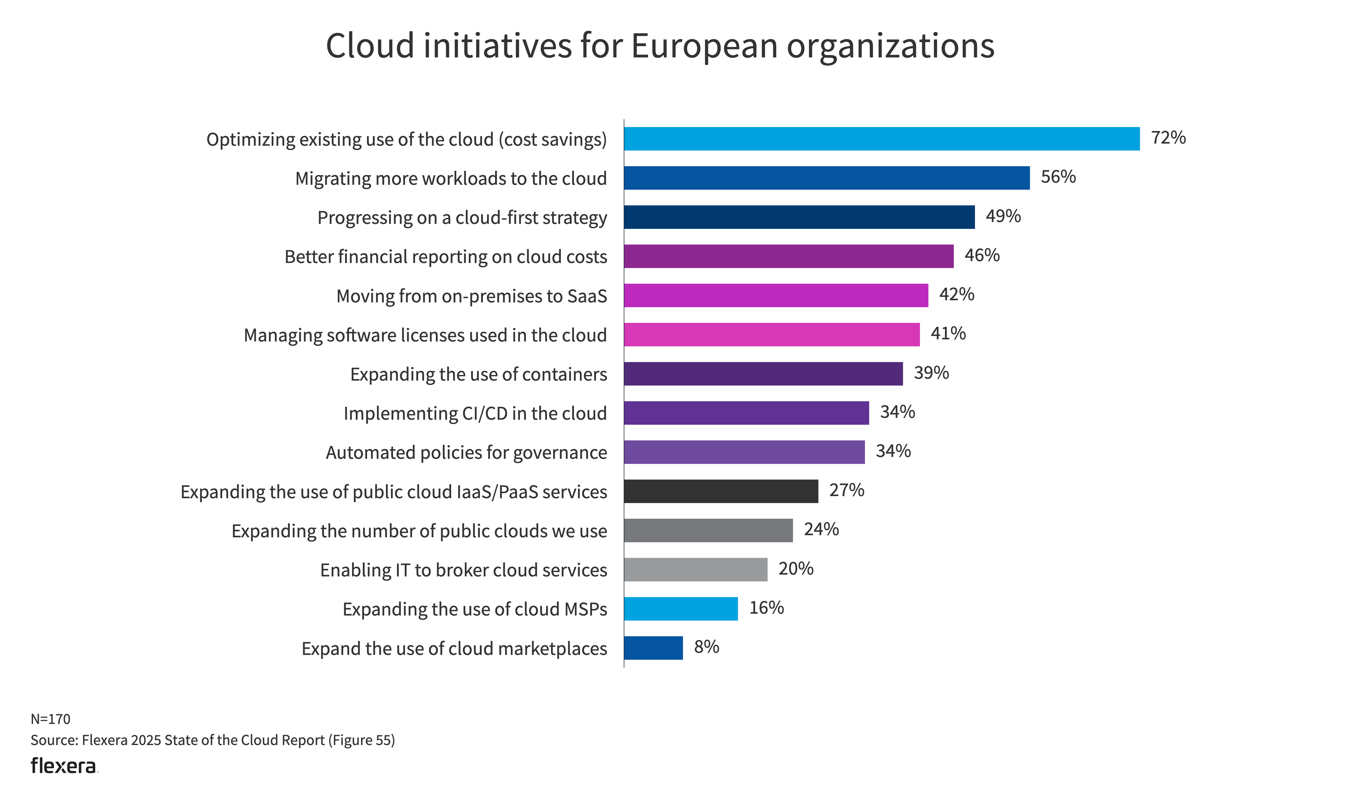 European respondents are also focused on similar cloud initiatives as their global counterparts, with an almost identical order of the top initiatives.