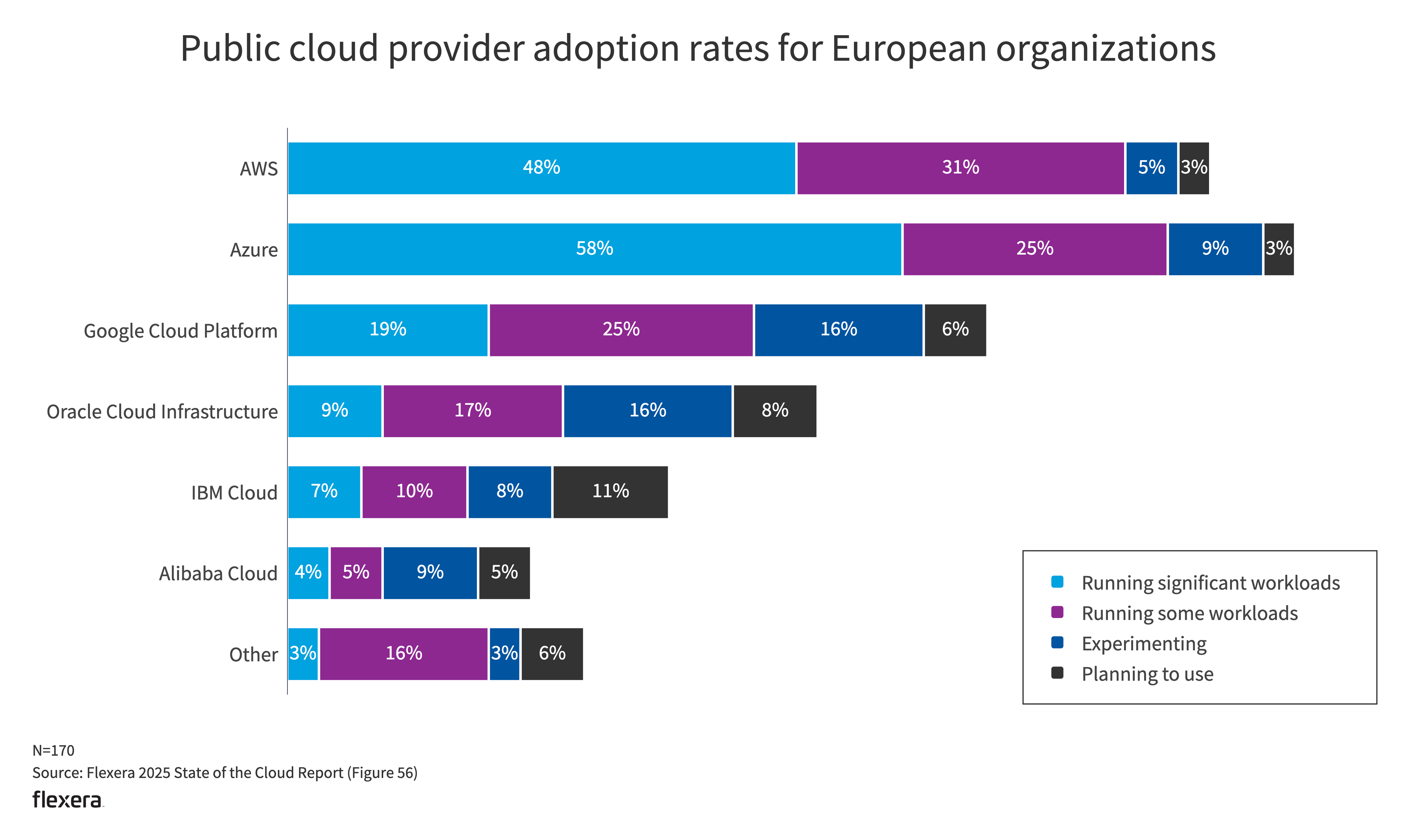 In analyzing public cloud provider adoption rates, the European results were similar to those of their global counterparts with the exception of the top two. Over half (53%) of the global respondent pool is running significant workloads in AWS, but this number falls to 48% for European respondents. Conversely, the proportion saying they run significant workloads in Azure is 12 percentage points higher for European respondents than for the global respondent pool (58% vs. 46%, respectively).