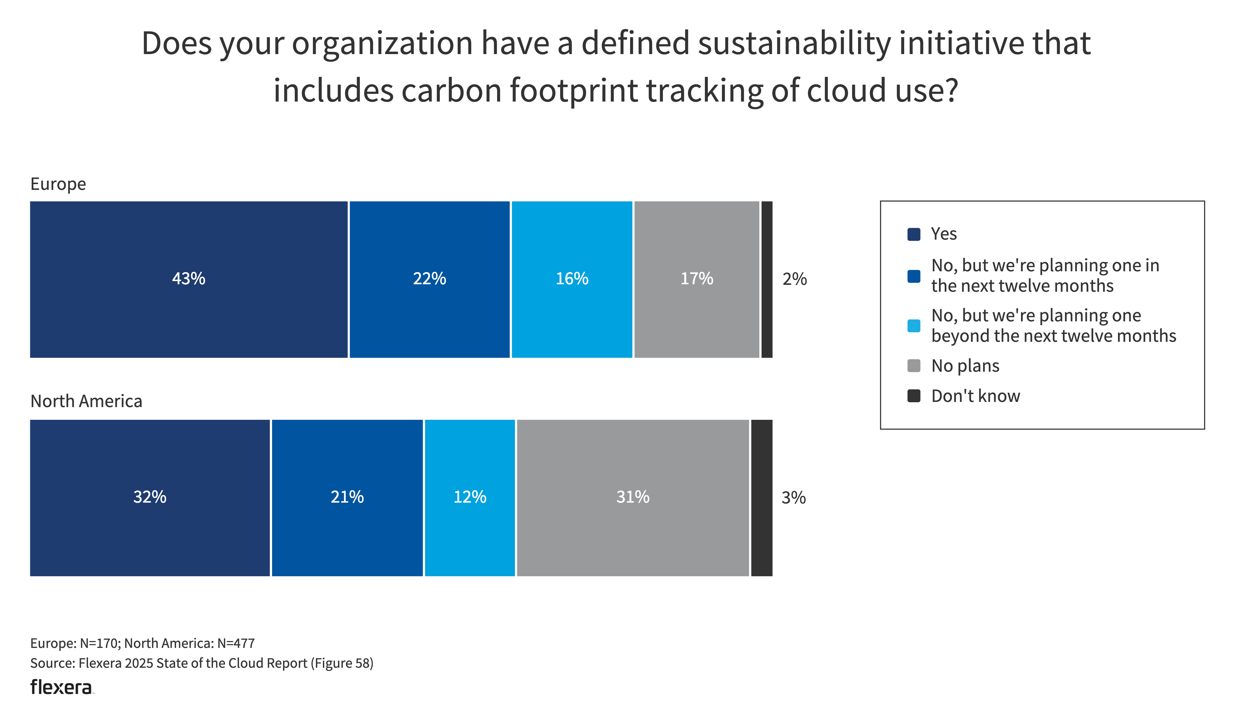 European organizations are more likely to have defined sustainability initiatives than North America (43% vs. 32%, respectively); however, this gap is closing.