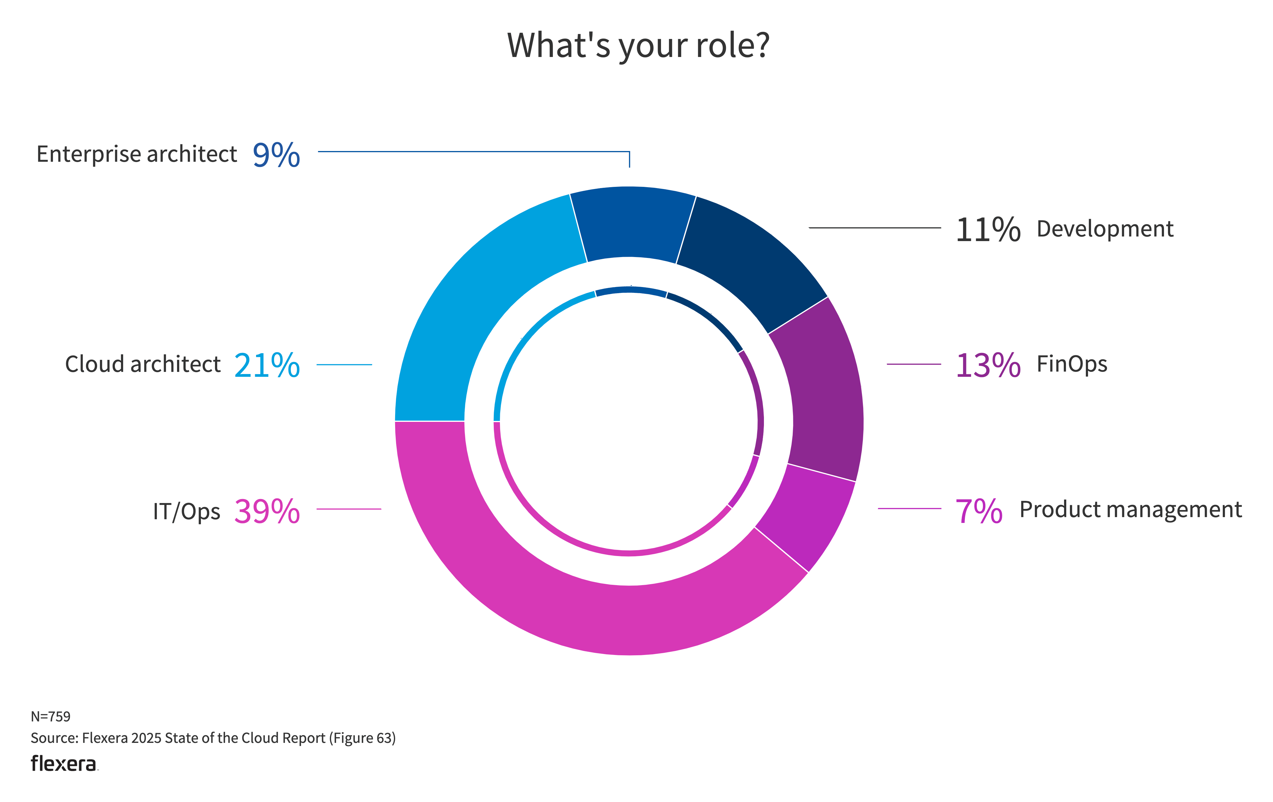 The majority are from the financial services (22%) or technology-related industries (33%). Thirty-nine percent work in IT/Ops, which is down from 43% last year. FinOps respondents increased this year from 5% to 13%, and we expect to see representation from the FinOps discipline to increase in the coming years.