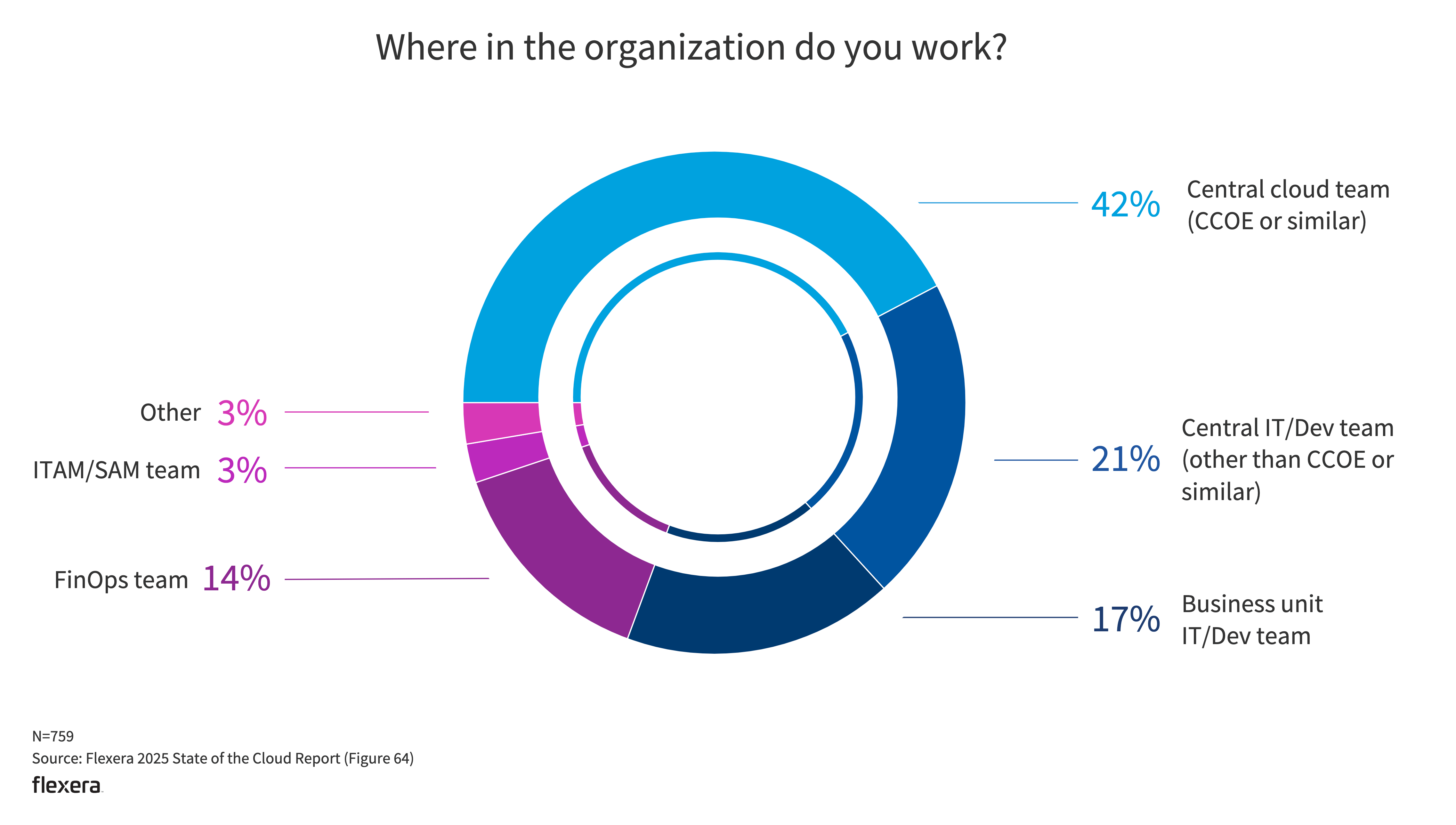 The number of respondents indicating they have a central cloud team (CCOE or similar) dropped year over year from 50% to 42%. This was also the first year we included an ITAM/SAM team option, which came in at 3%. We may expect the number of respondents working within a CCOE team to decrease and those within a FinOps team to increase as more organizations implement a FinOps team.