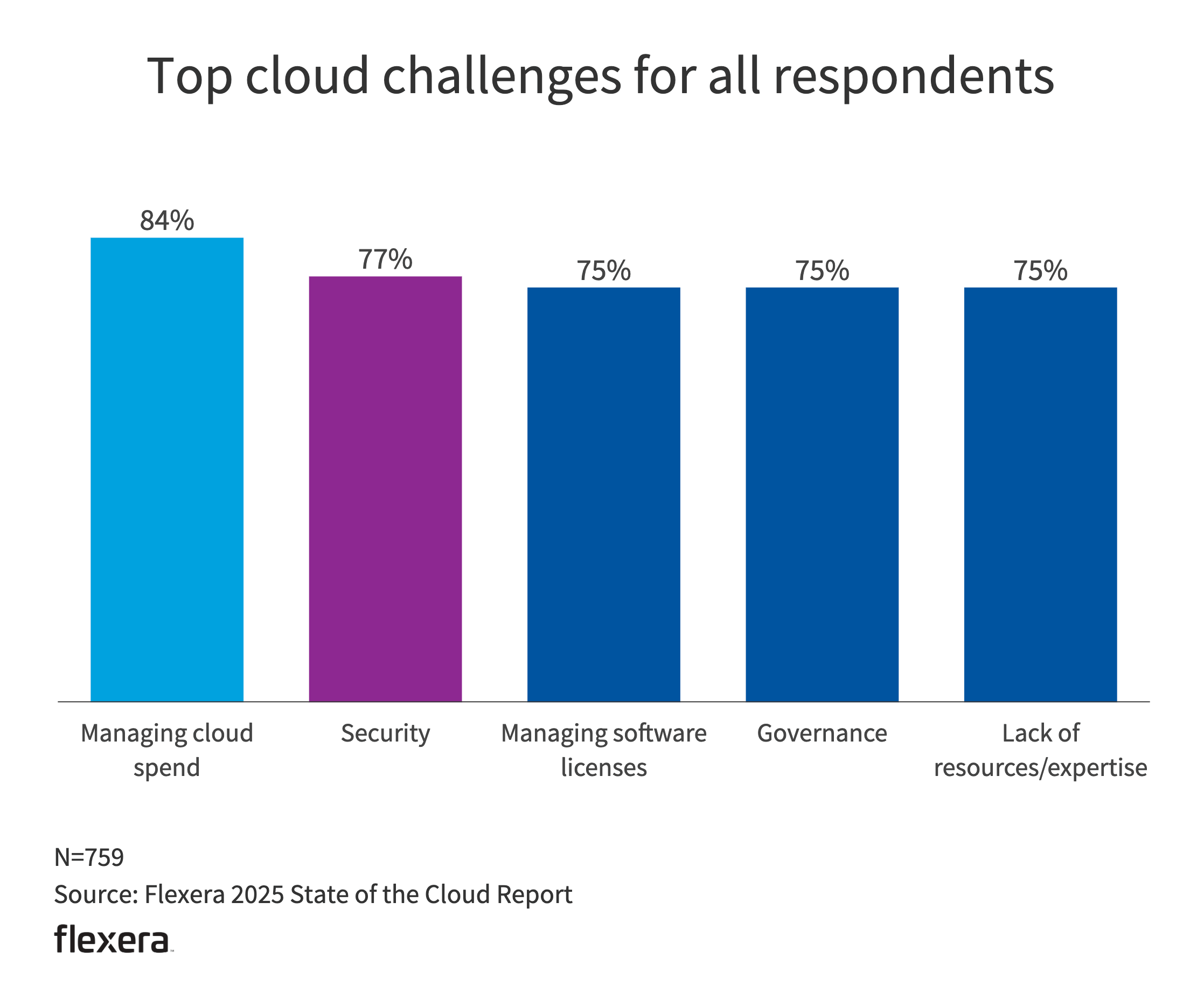 Managing cloud spend (84%) and security (77%) remain top of mind when it comes to cloud challenges.