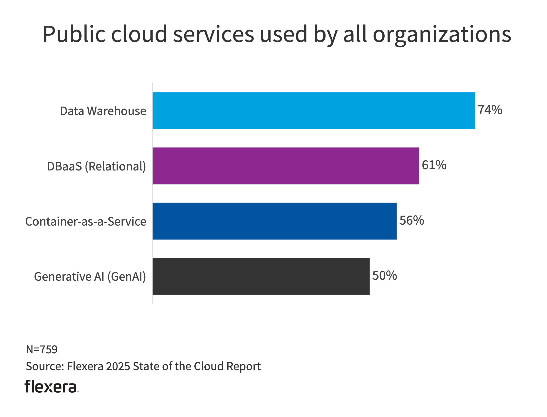This is the first year generative AI (GenAI) was included as an option for public cloud services used by all organizations, and it’s currently being used by 50% of respondents, which is the largest value ever recorded for a new service added to the list.