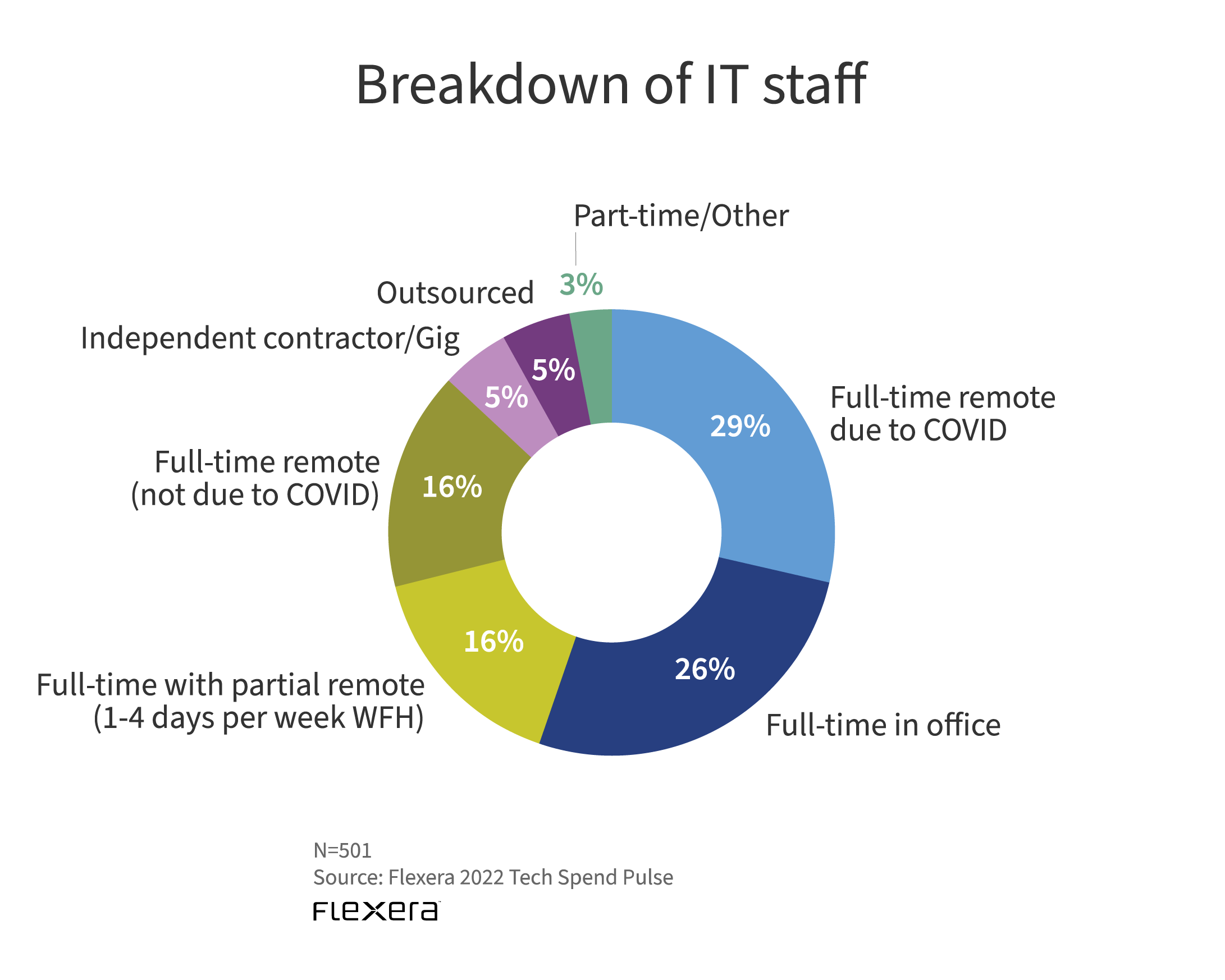 COVID-19 accelerated a push to a remote workforce. But as the world slowly starts to reopen, more IT workers are either returning to the office or working remotely less often. In last year’s survey, 45% of IT staff worked remotely full-time. This year that number has dropped to 29%.