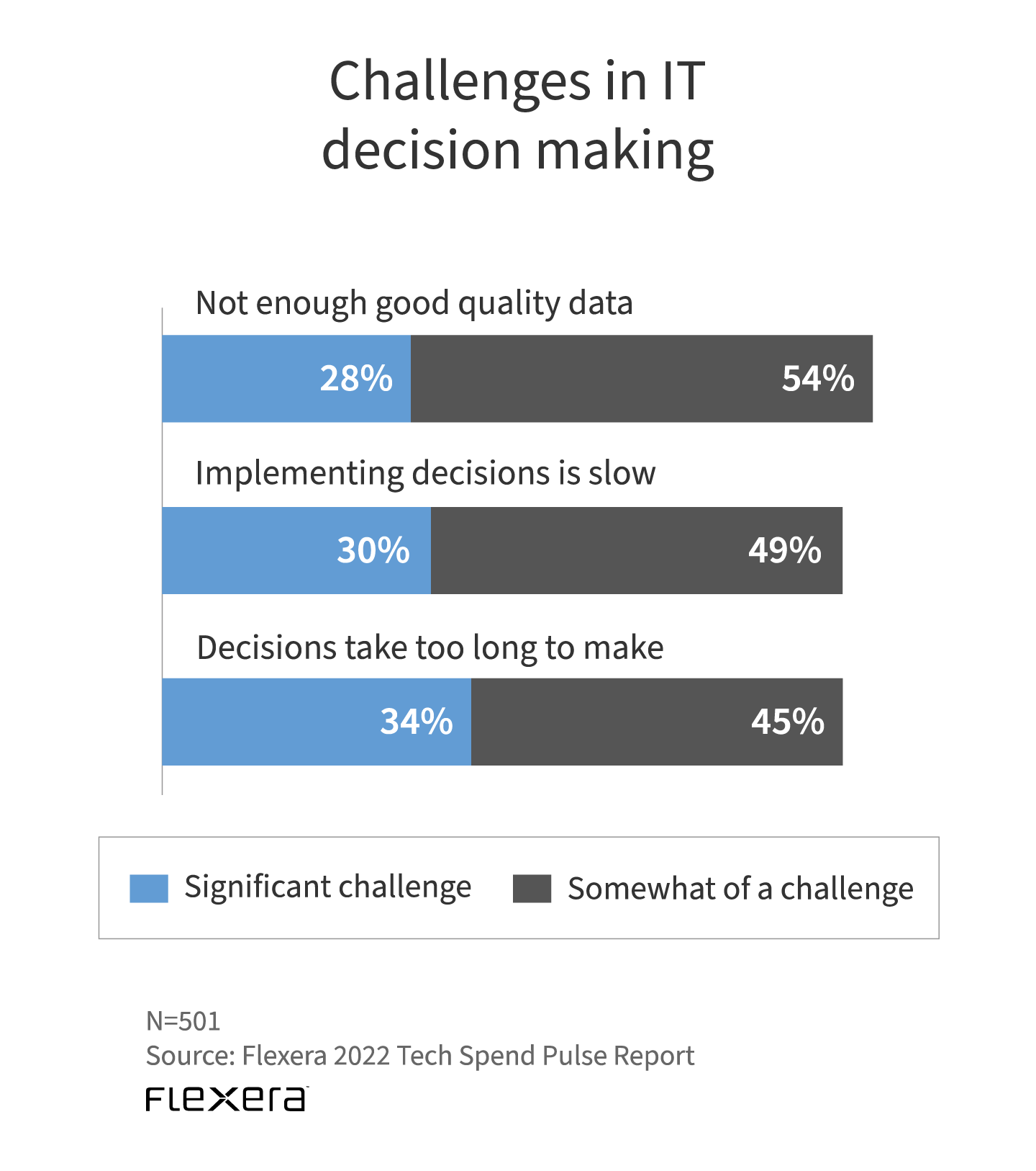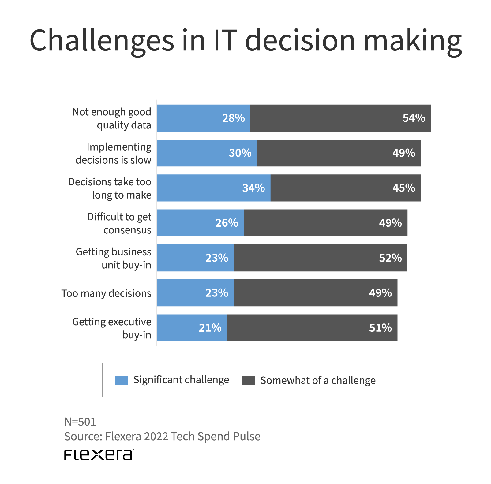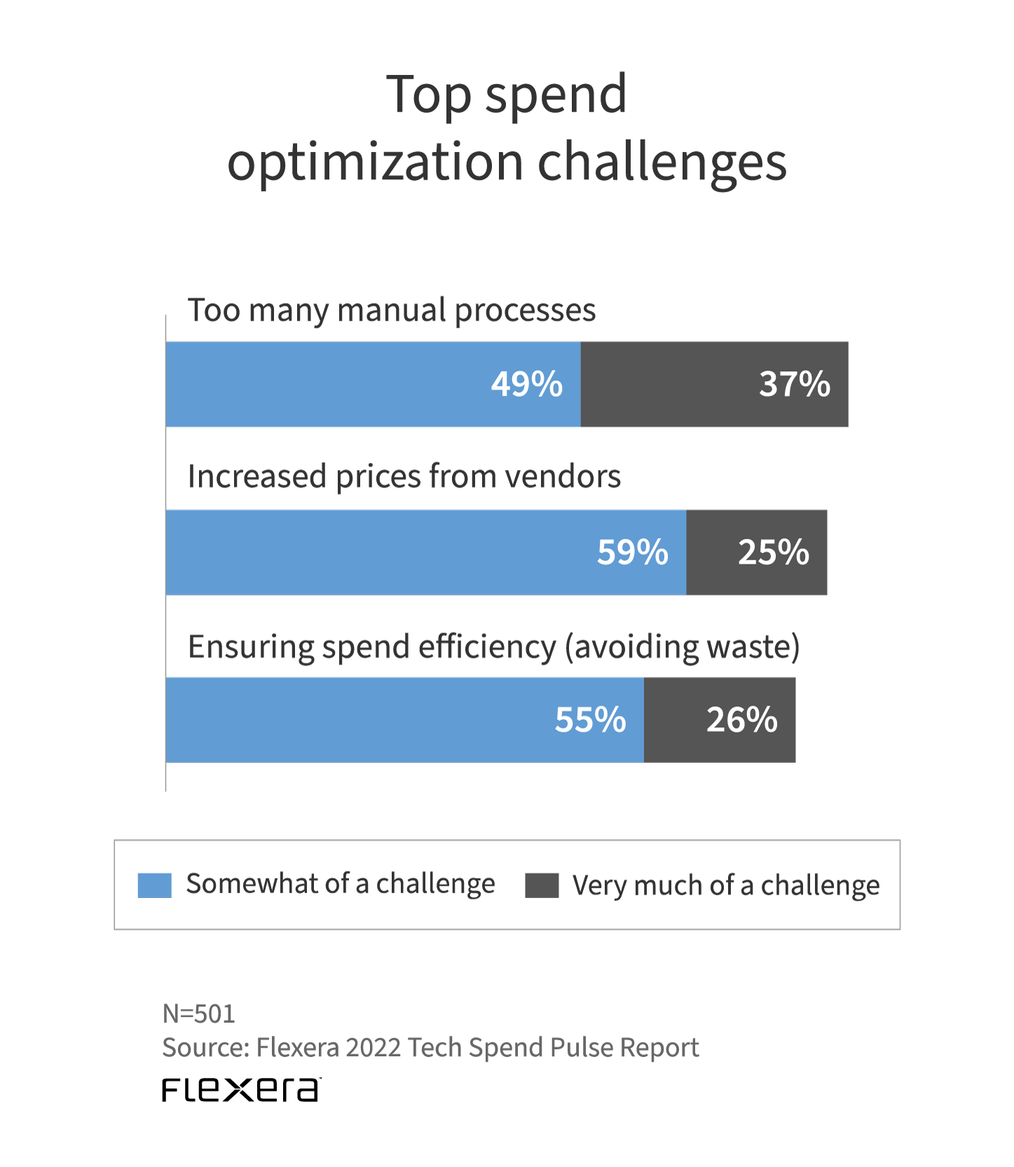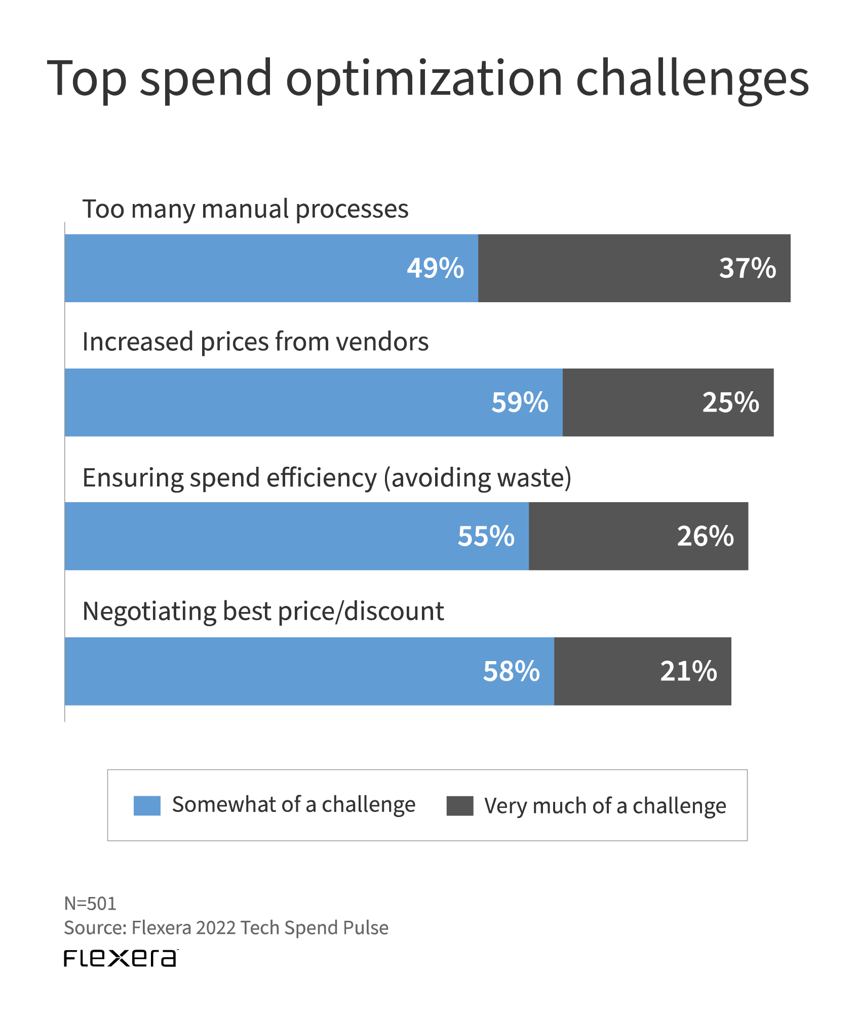 IT organizations often face challenges managing and optimizing the cost of services they deliver to the business. The top four spend-optimization challenges continue to be led by too many manual processes. But this year, negotiating best price/discount and increased prices from vendors moved into the top group, each increasing 10% or more from last year. This shows interactions with vendors will gain importance as organizations move toward the subscription-based model.