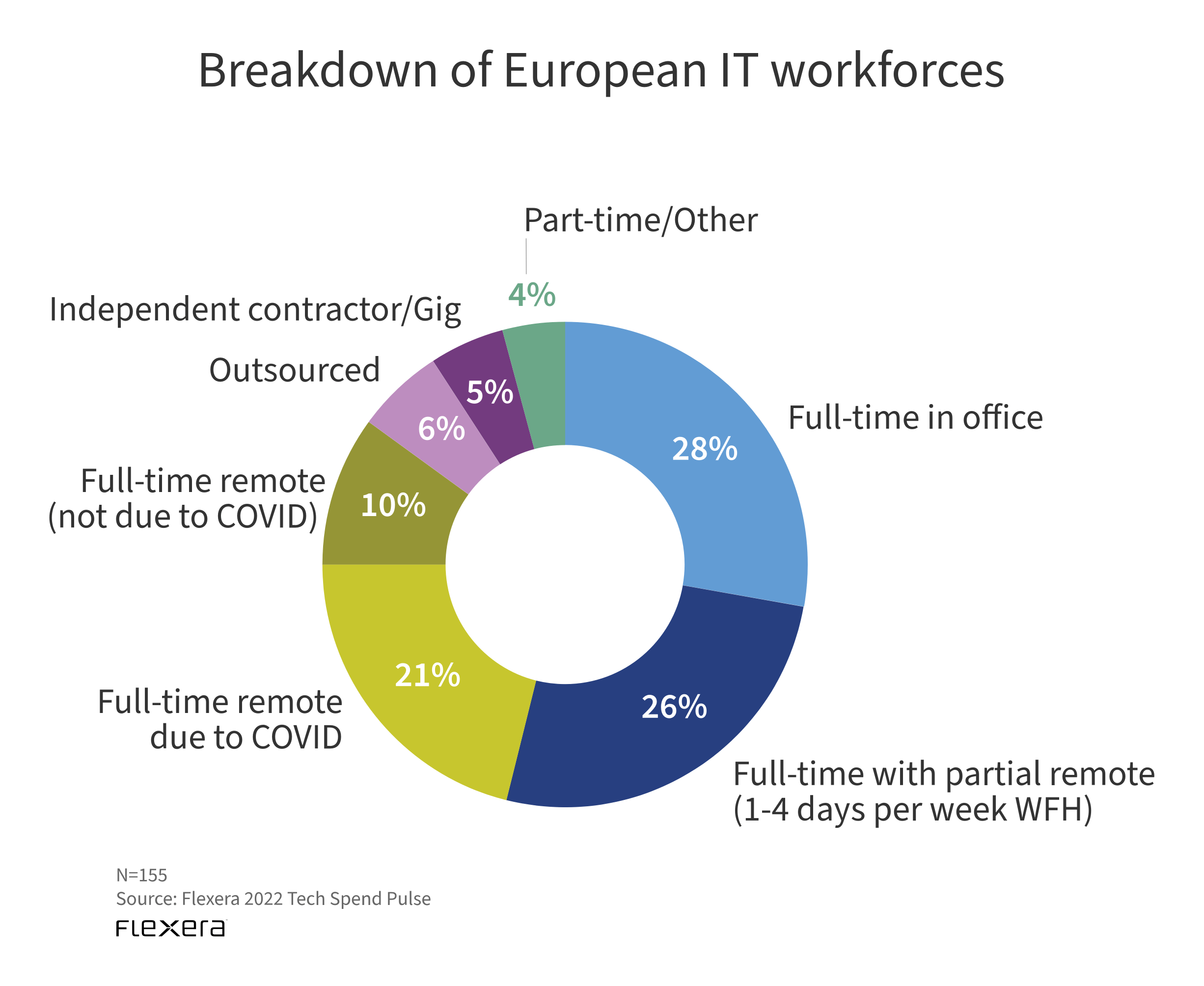 The COVID-19 pandemic altered the work environments of European IT staff much as it did global IT staff. While many of the data points shown closely relate to the global values, there’s a significant difference in full-time with partial remote (1-4 days per week work from home) with European organizations having 26% of their staff working in this model vs. just 16% globally.