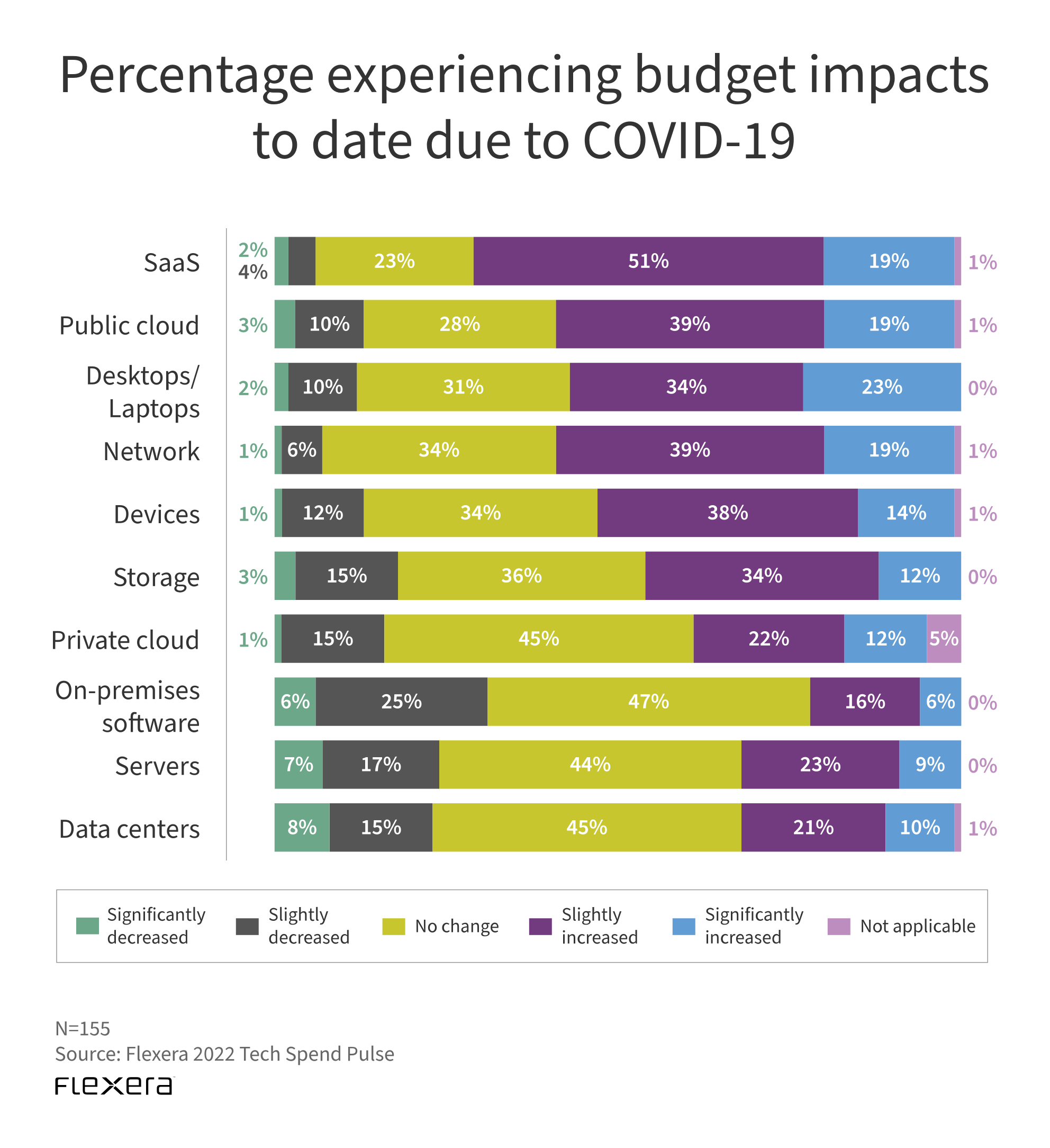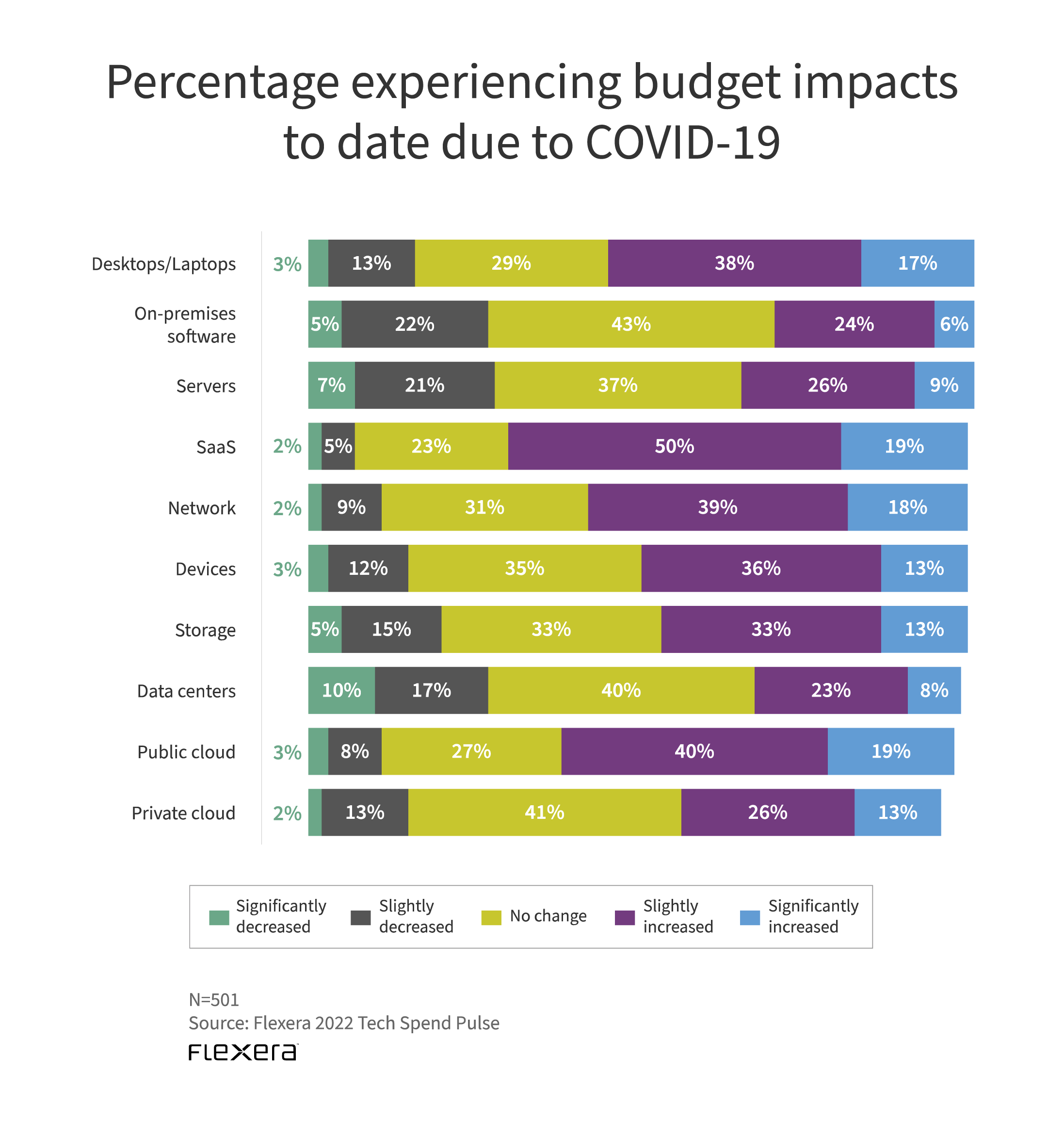 COVID-19 continues to drive up cloud spend and drive down on-premises software spend. Organizations turn to SaaS and move more apps and data to the cloud to support remote employees. These trends are continuing as budgets for items more directly related to enabling a remote work force increase, such as SaaS (69%), public cloud (59%) and desktops/laptops (55%). Conversely, spending associated with legacy office environments has decreased, such as data centers (-27%), servers (-28%) and on-premises software (-27%).