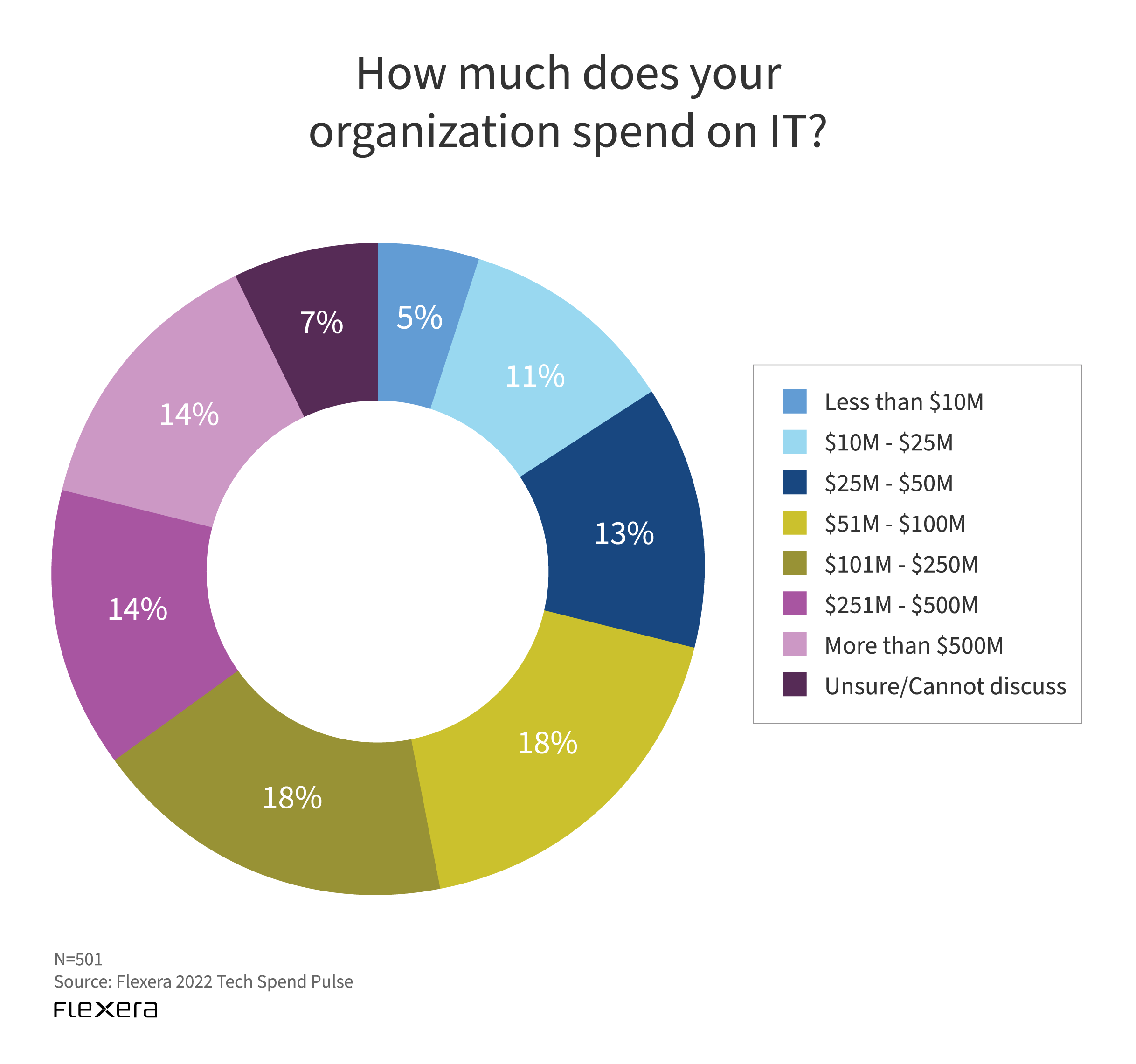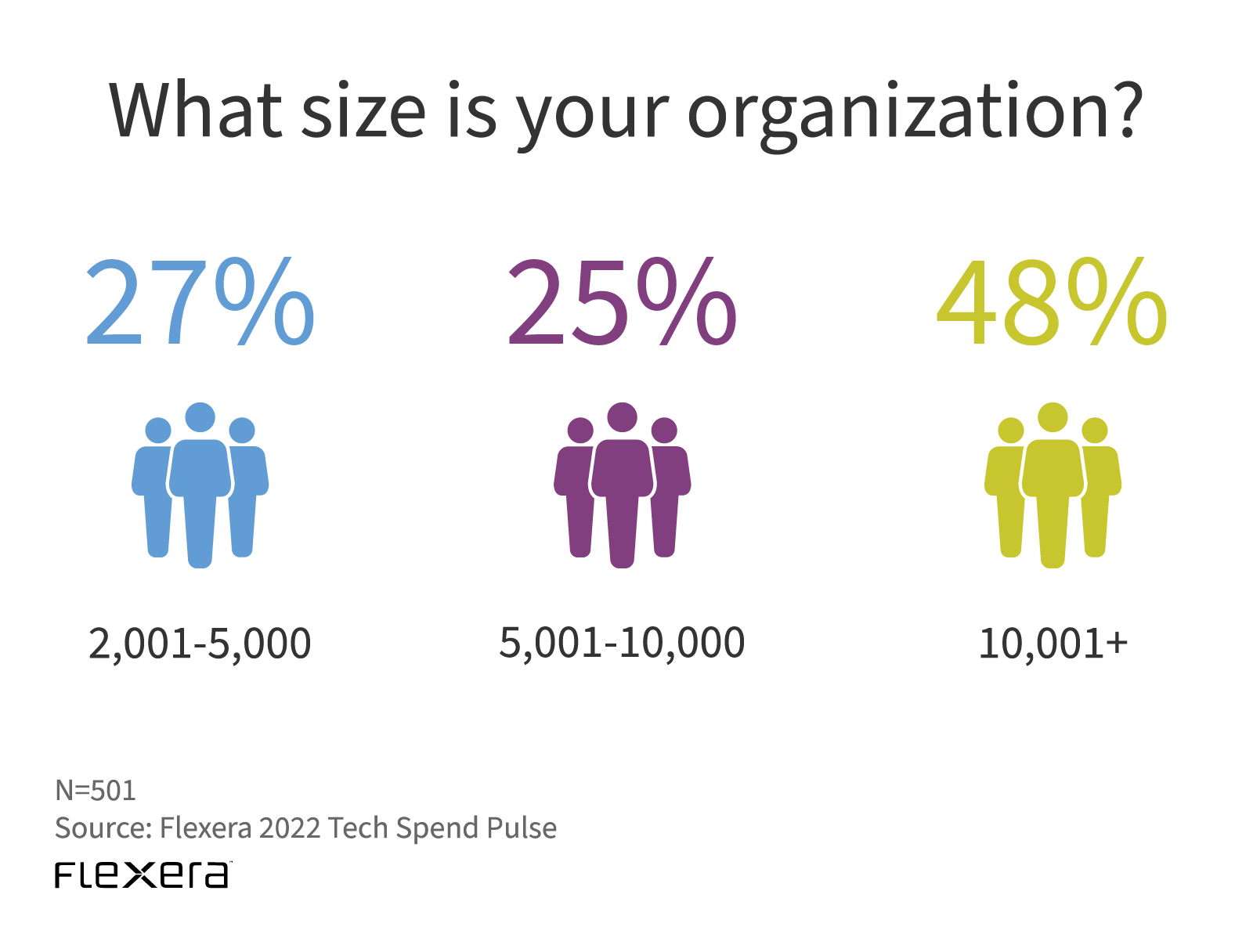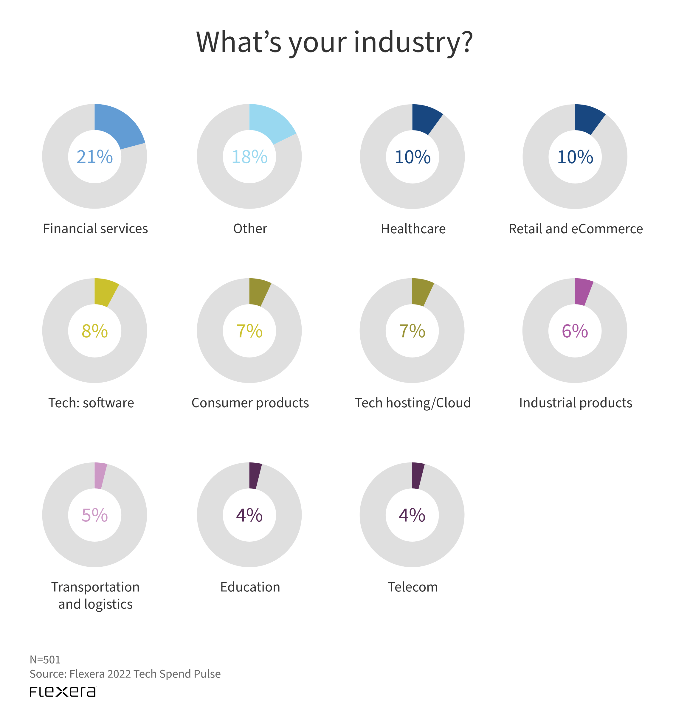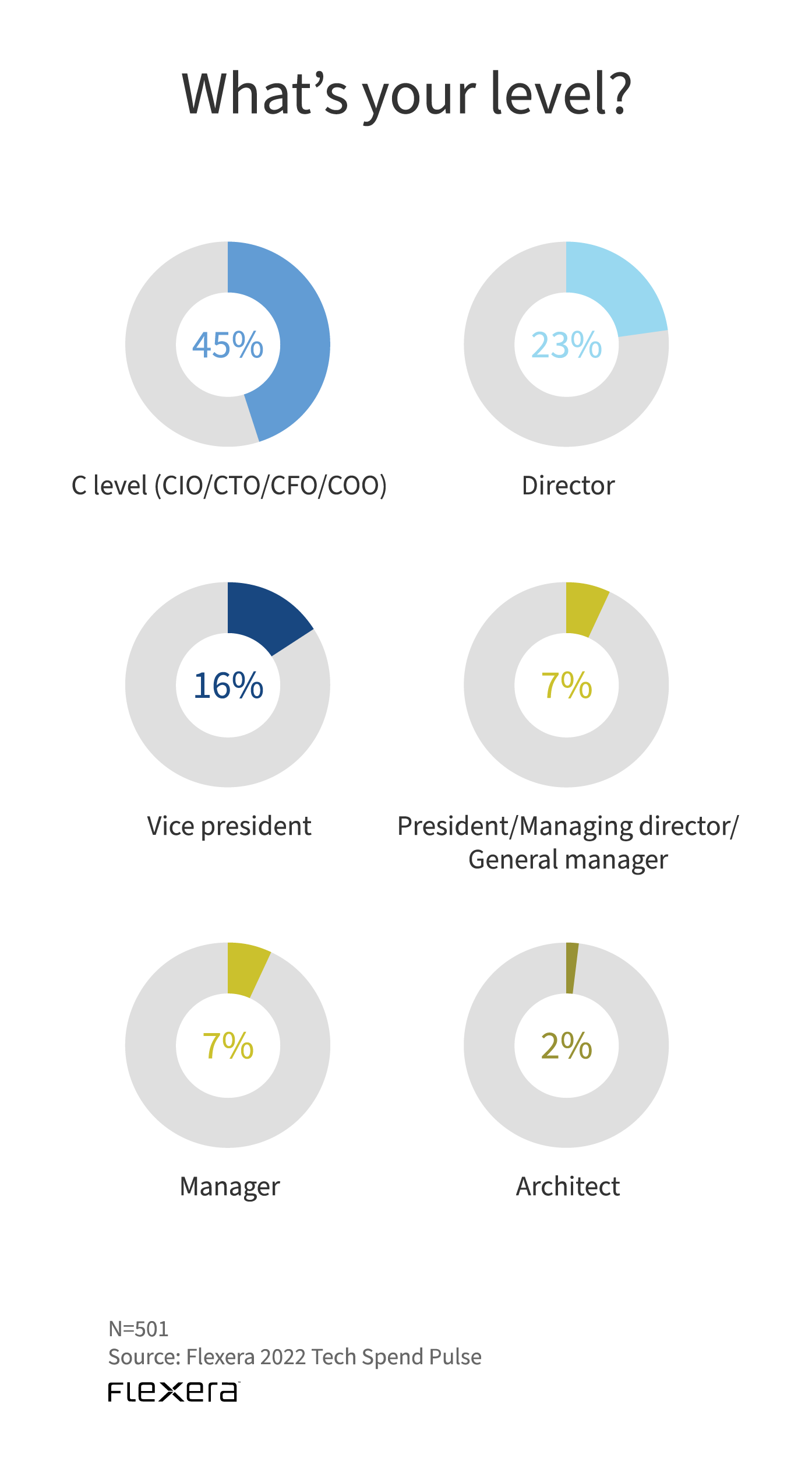 The Flexera 2022 Tech Spend Pulse survey tapped 501 global technology executives and high-level managers with significant knowledge of their organizations’ overall budgets. They represent a broad cross-section of industries.