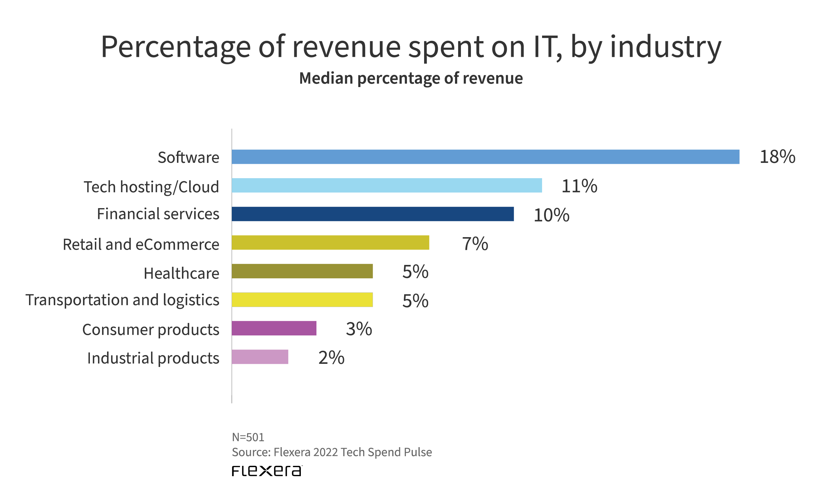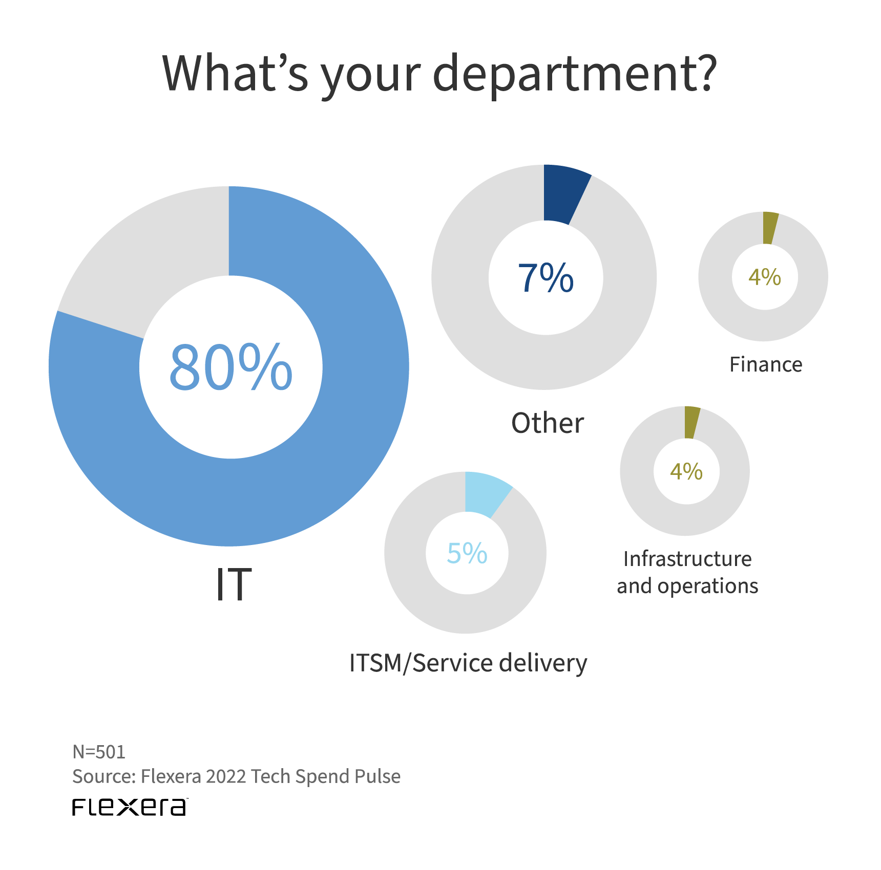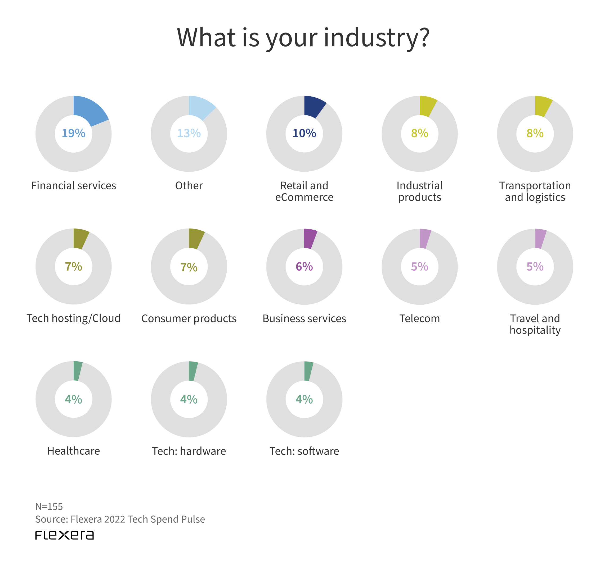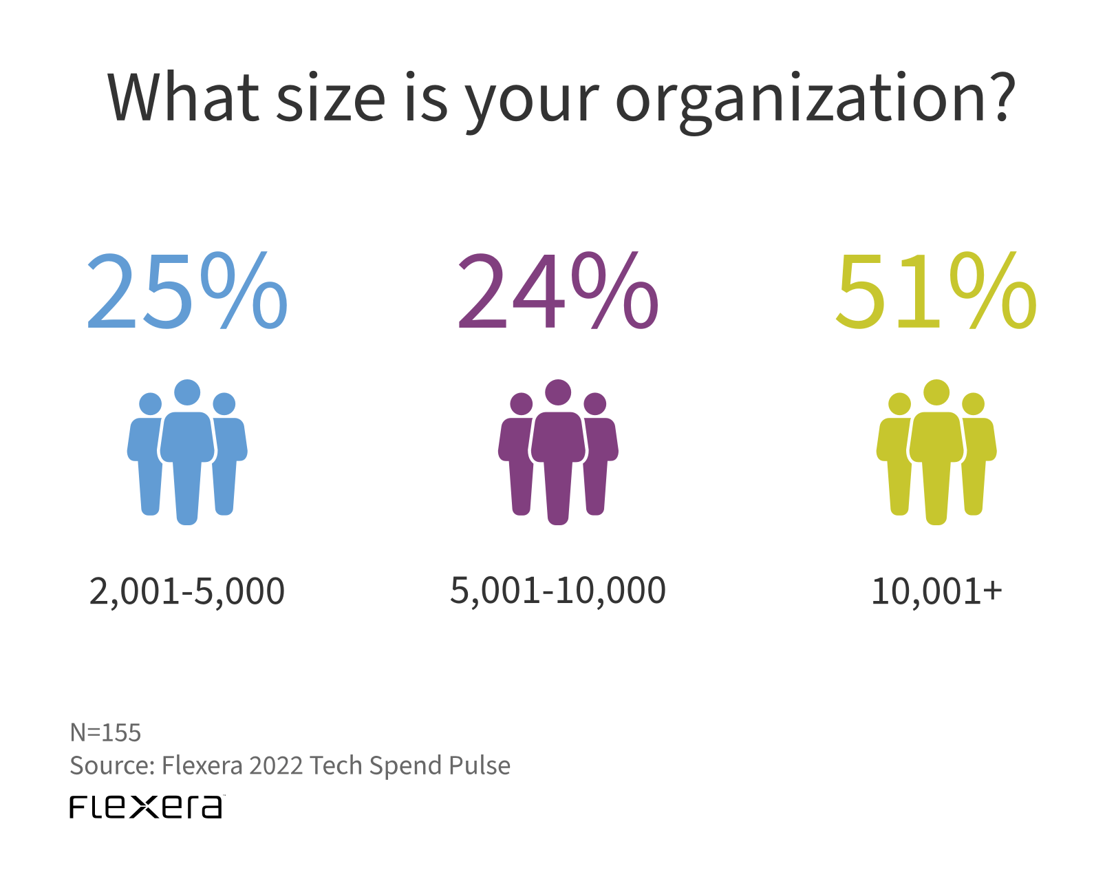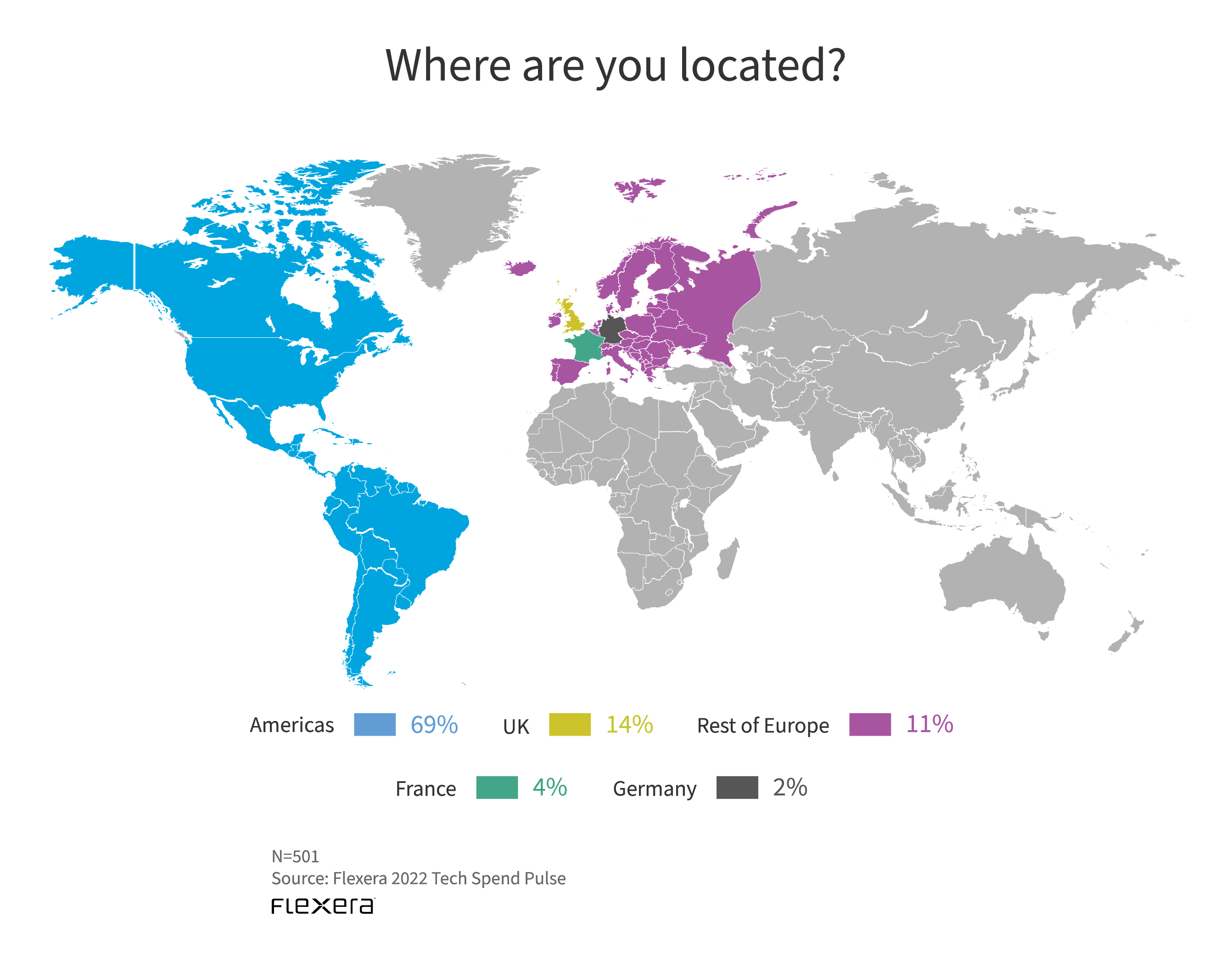 The Flexera 2022 Tech Spend Pulse survey tapped 501 global technology executives and high-level managers with significant knowledge of their organizations’ overall budgets. They represent a broad cross-section of industries.