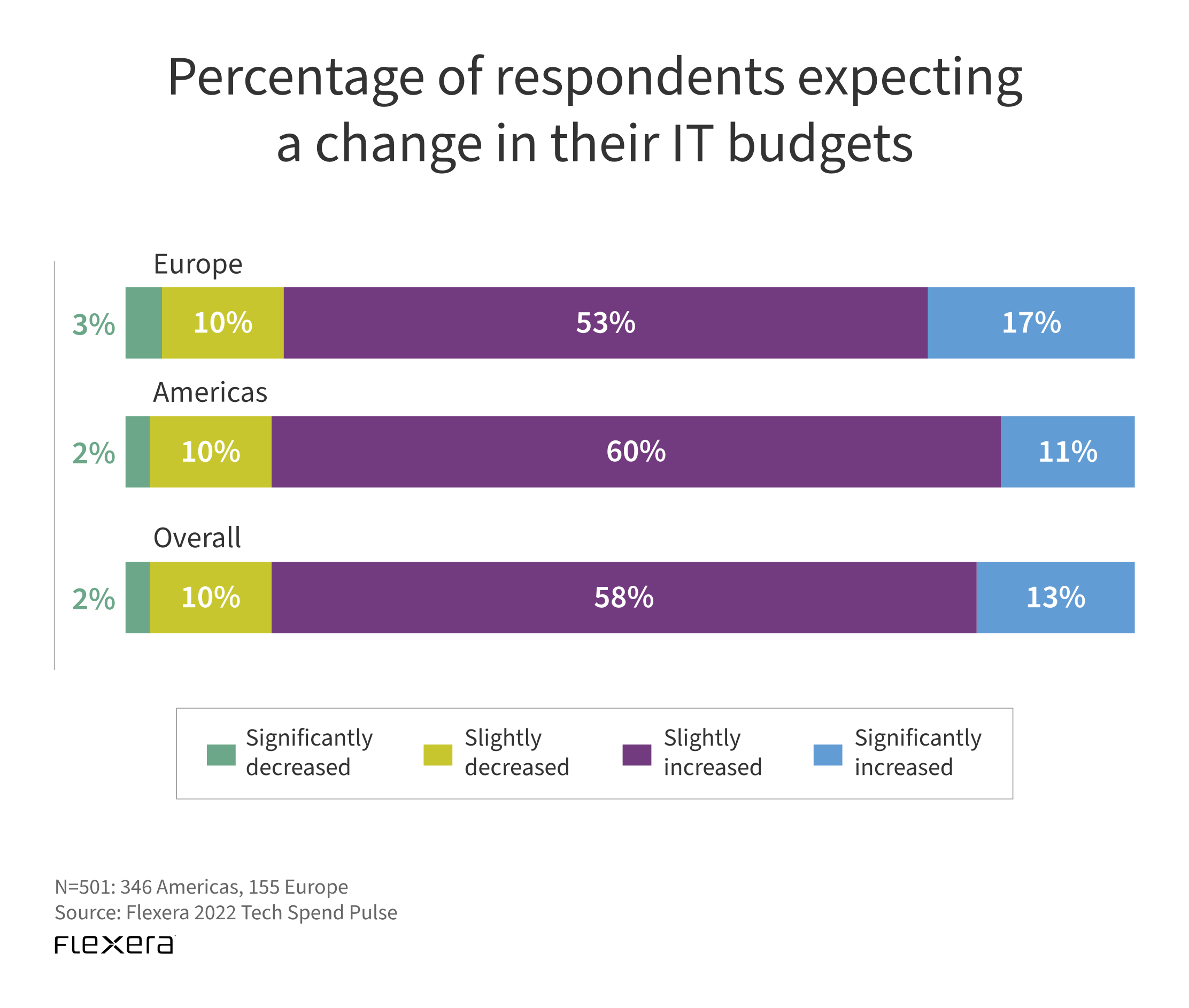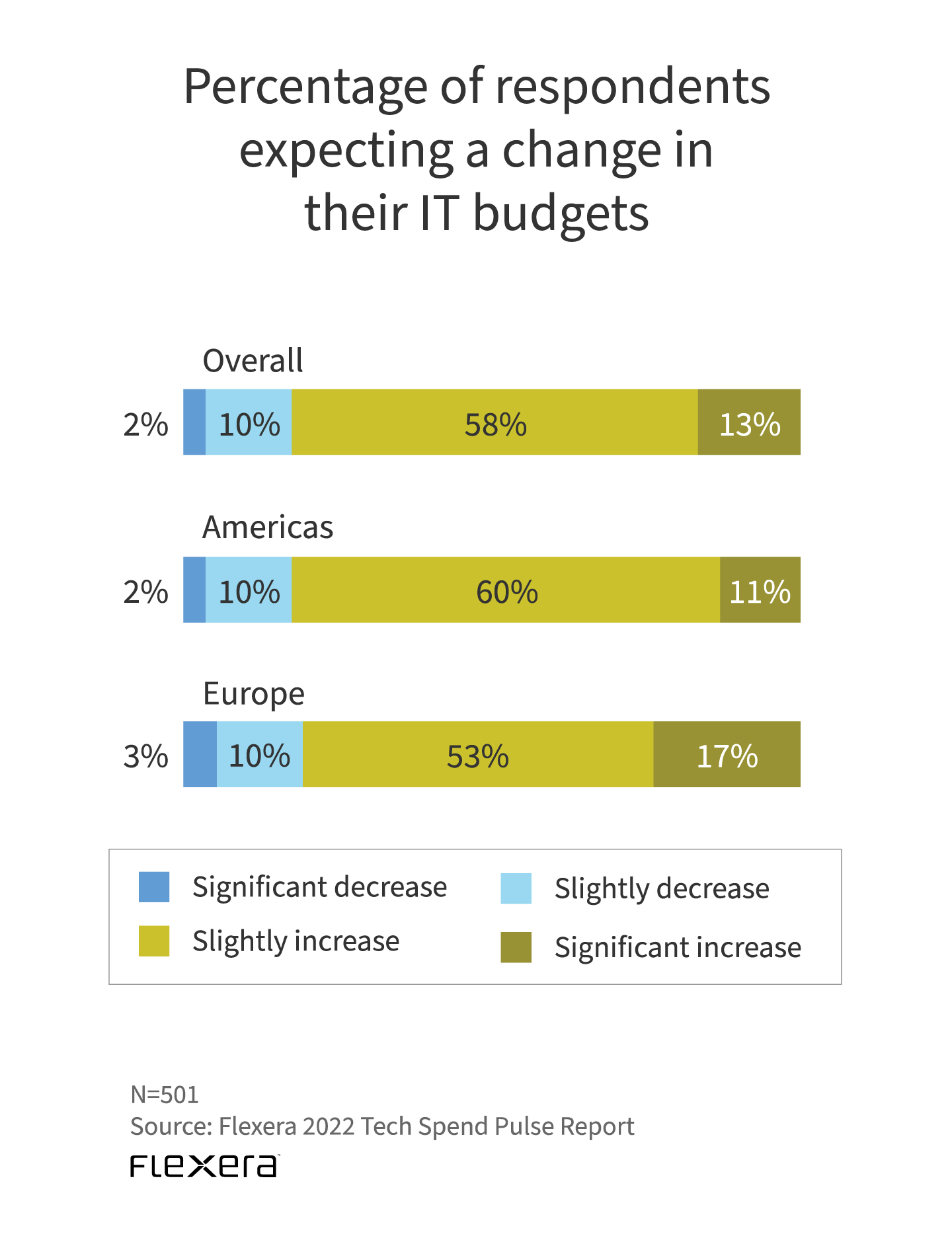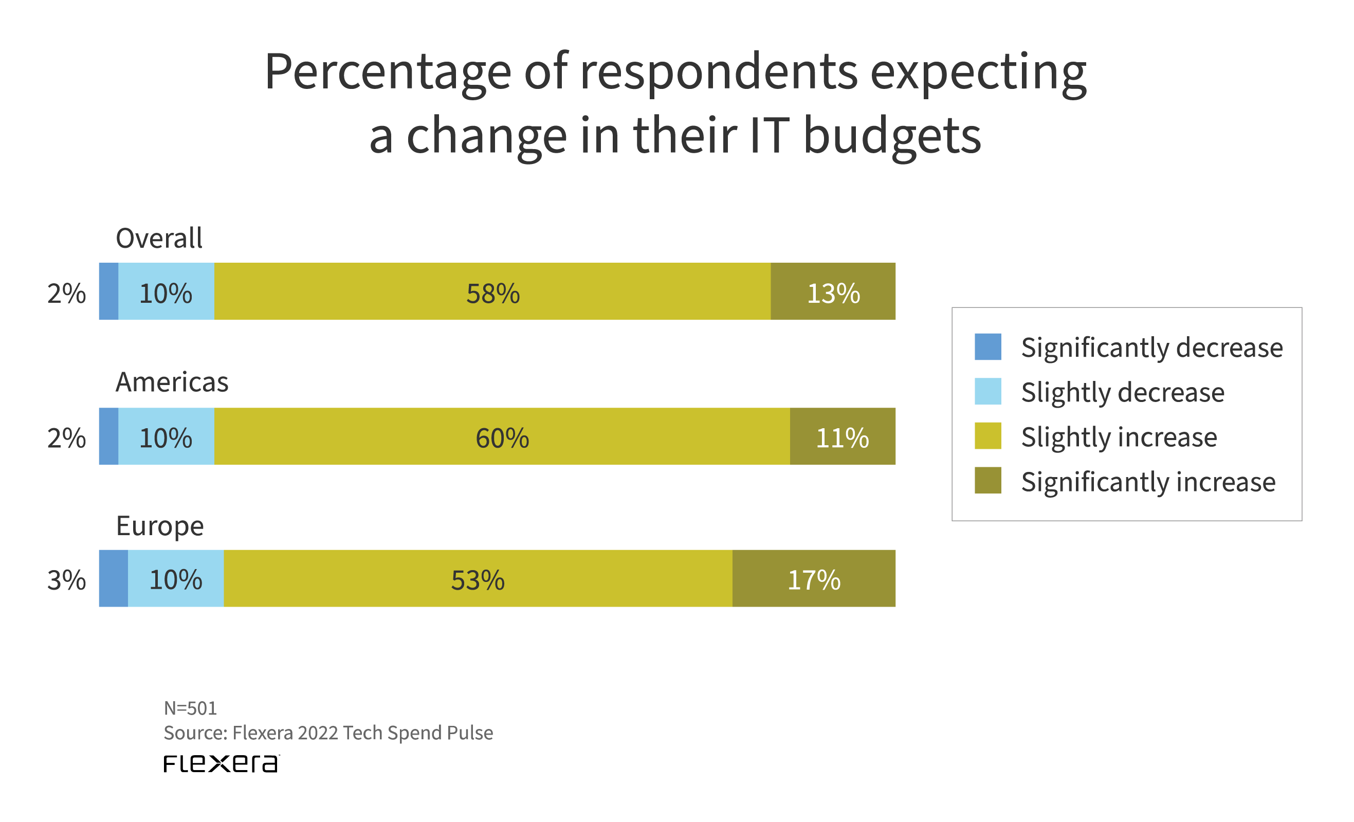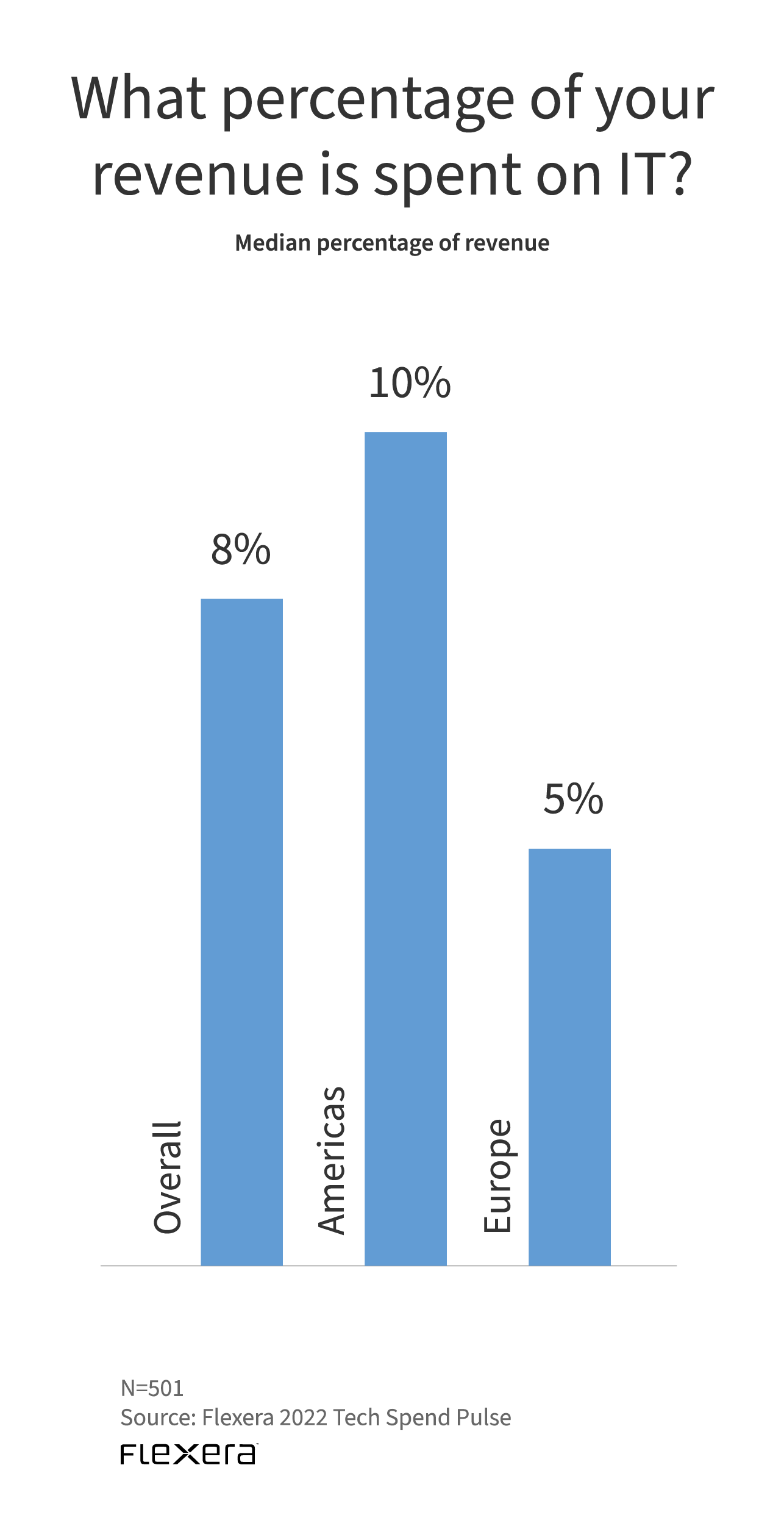 The Flexera 2022 Tech Spend Pulse survey tapped 501 global technology executives and high-level managers with significant knowledge of their organizations’ overall budgets. They represent a broad cross-section of industries.