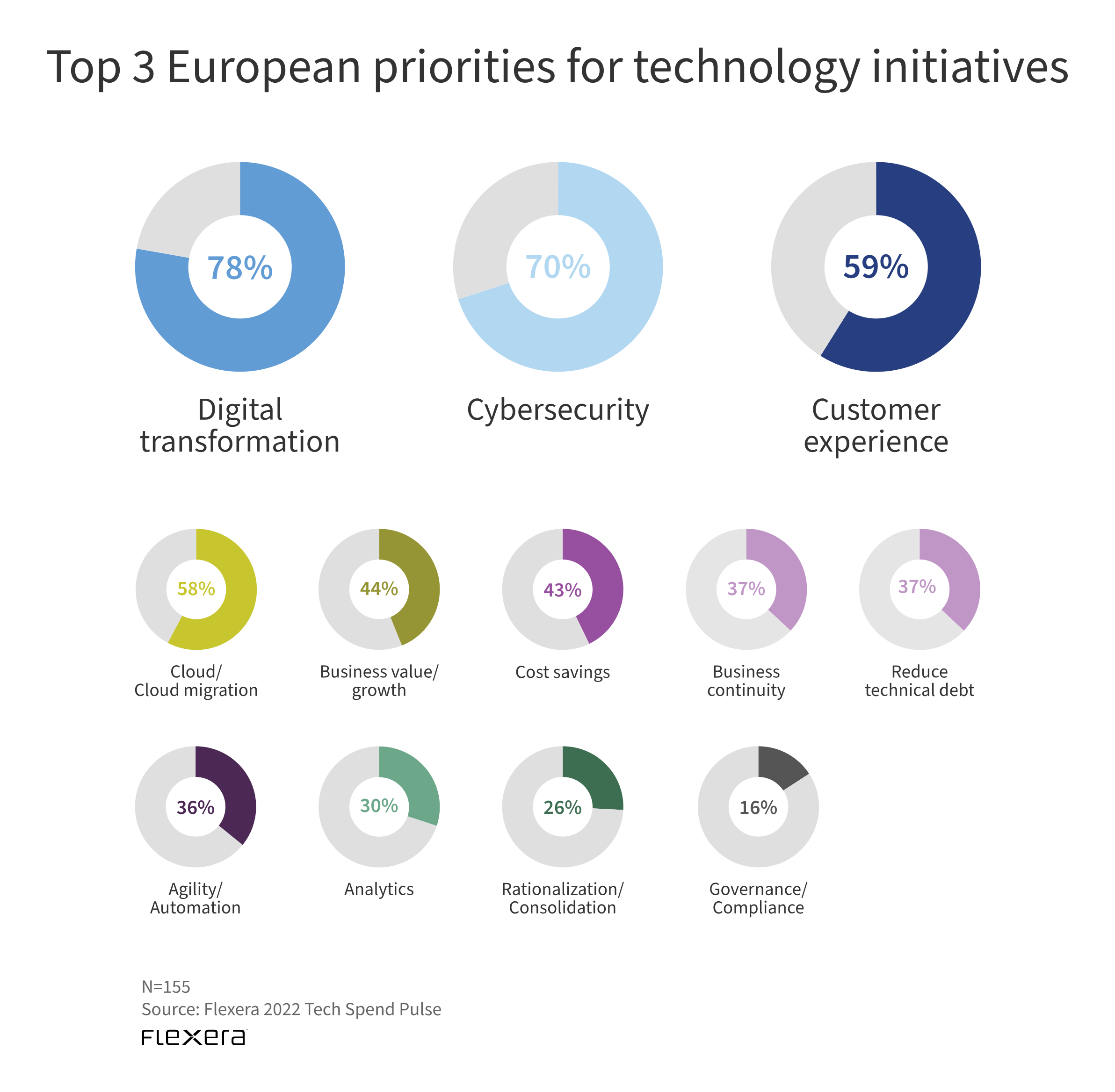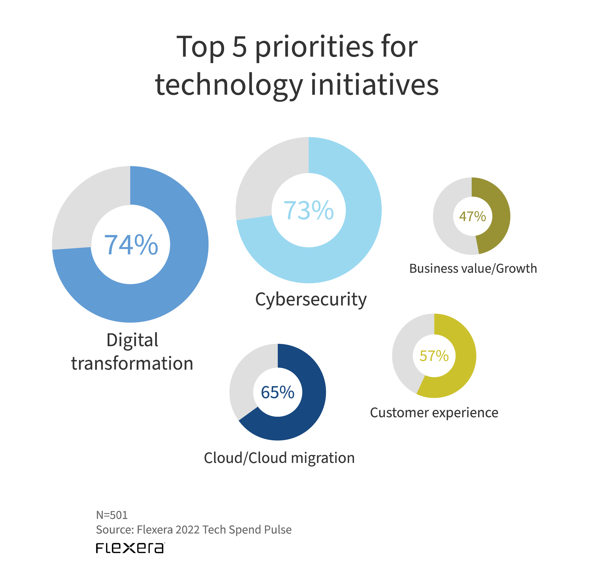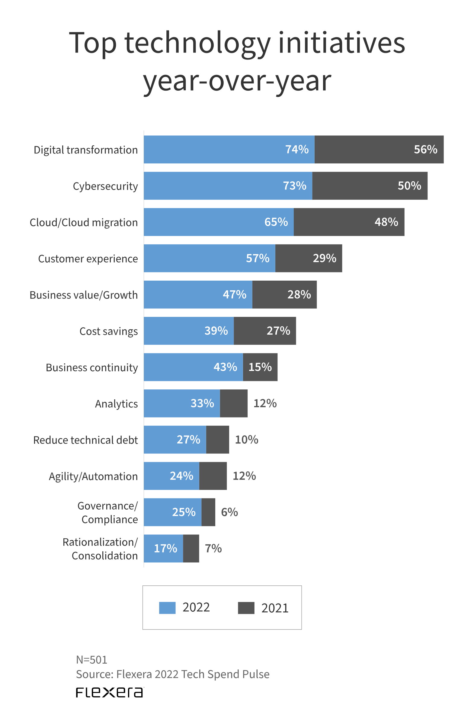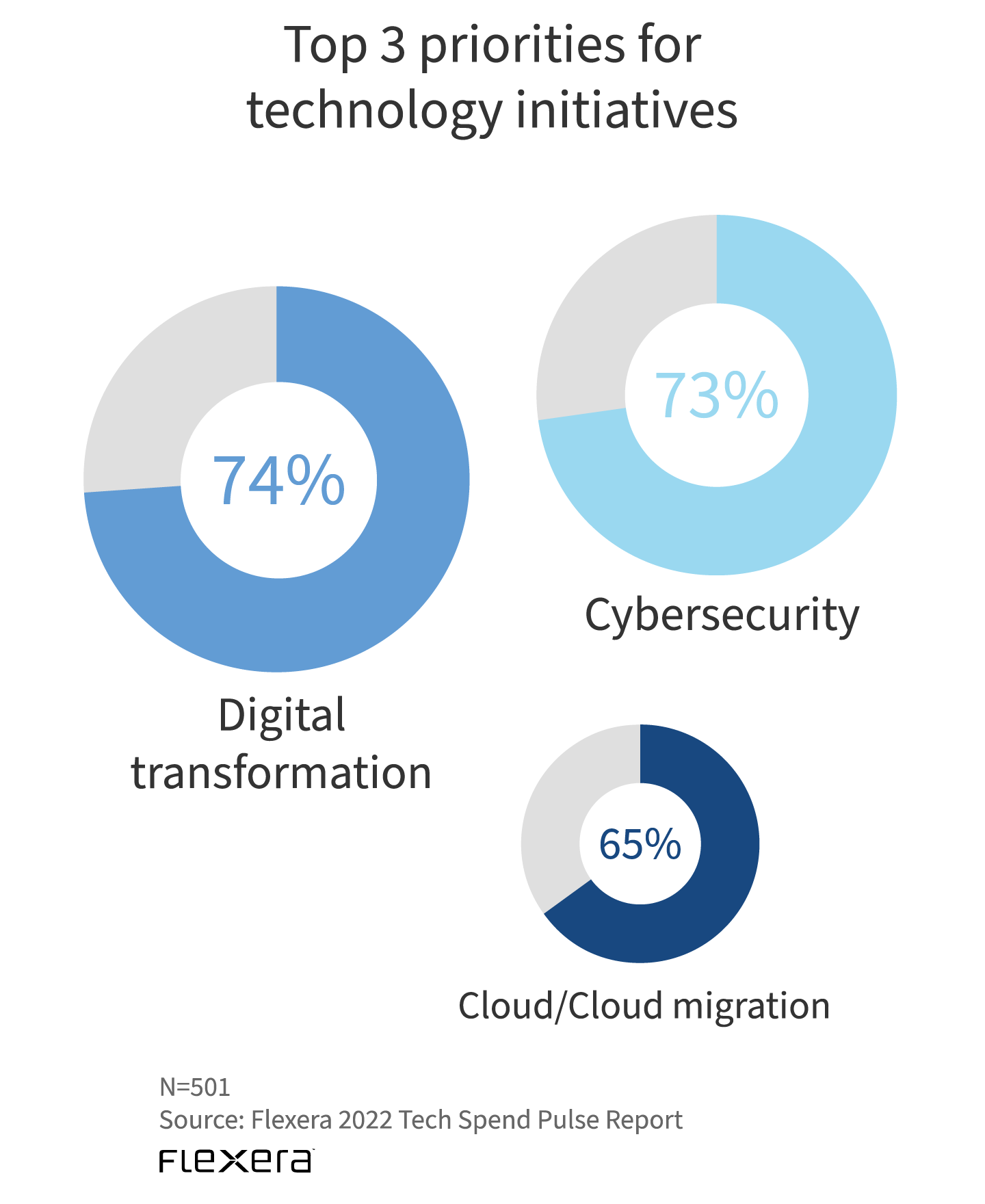 The top three priorities—digital transformation, cybersecurity and cloud/cloud migration—remain constant from the Flexera 2021 State of Tech Spend Report findings. And it’s likely these priorities will continue into 2023 as these all showed significant increases from 2021.