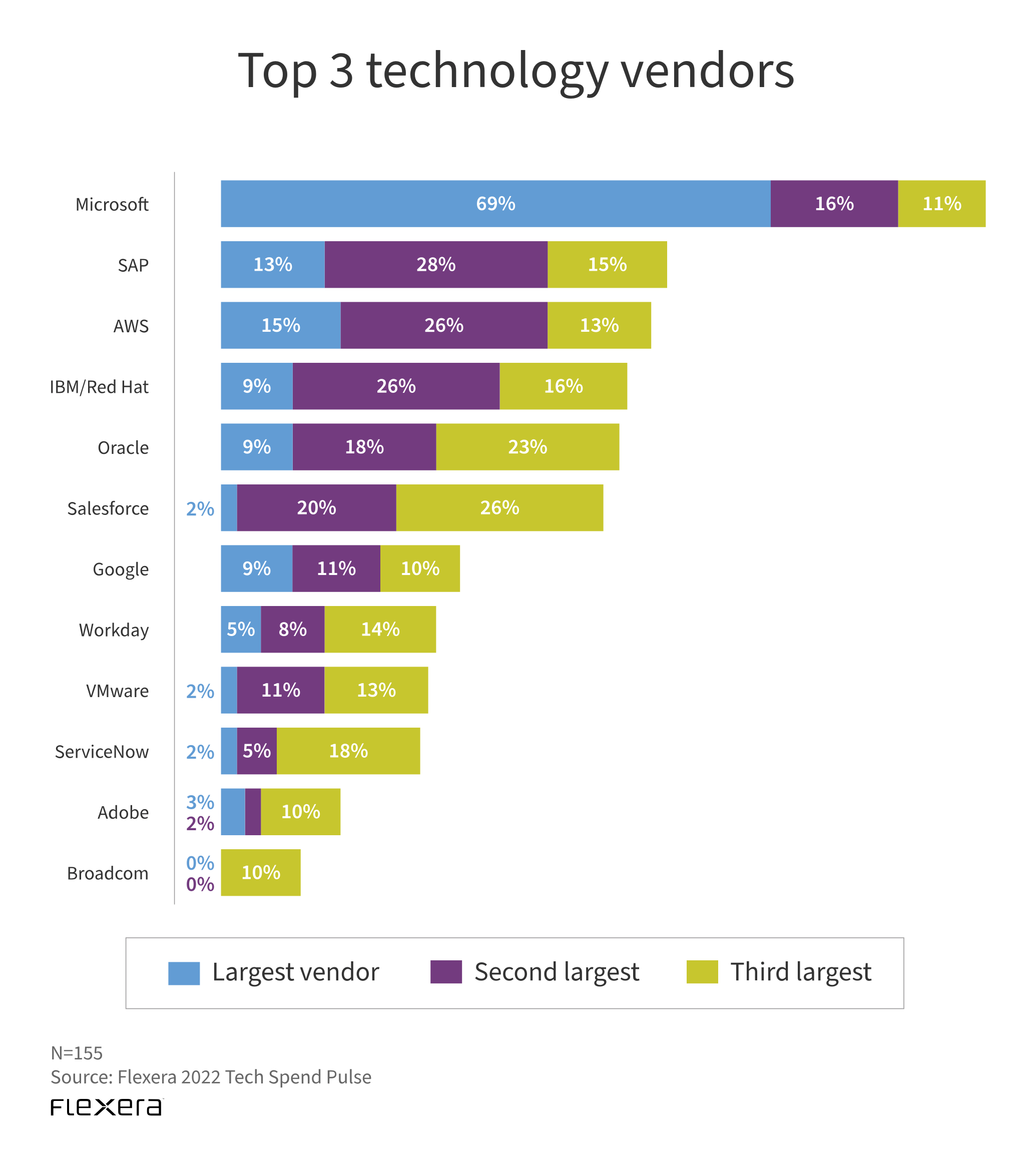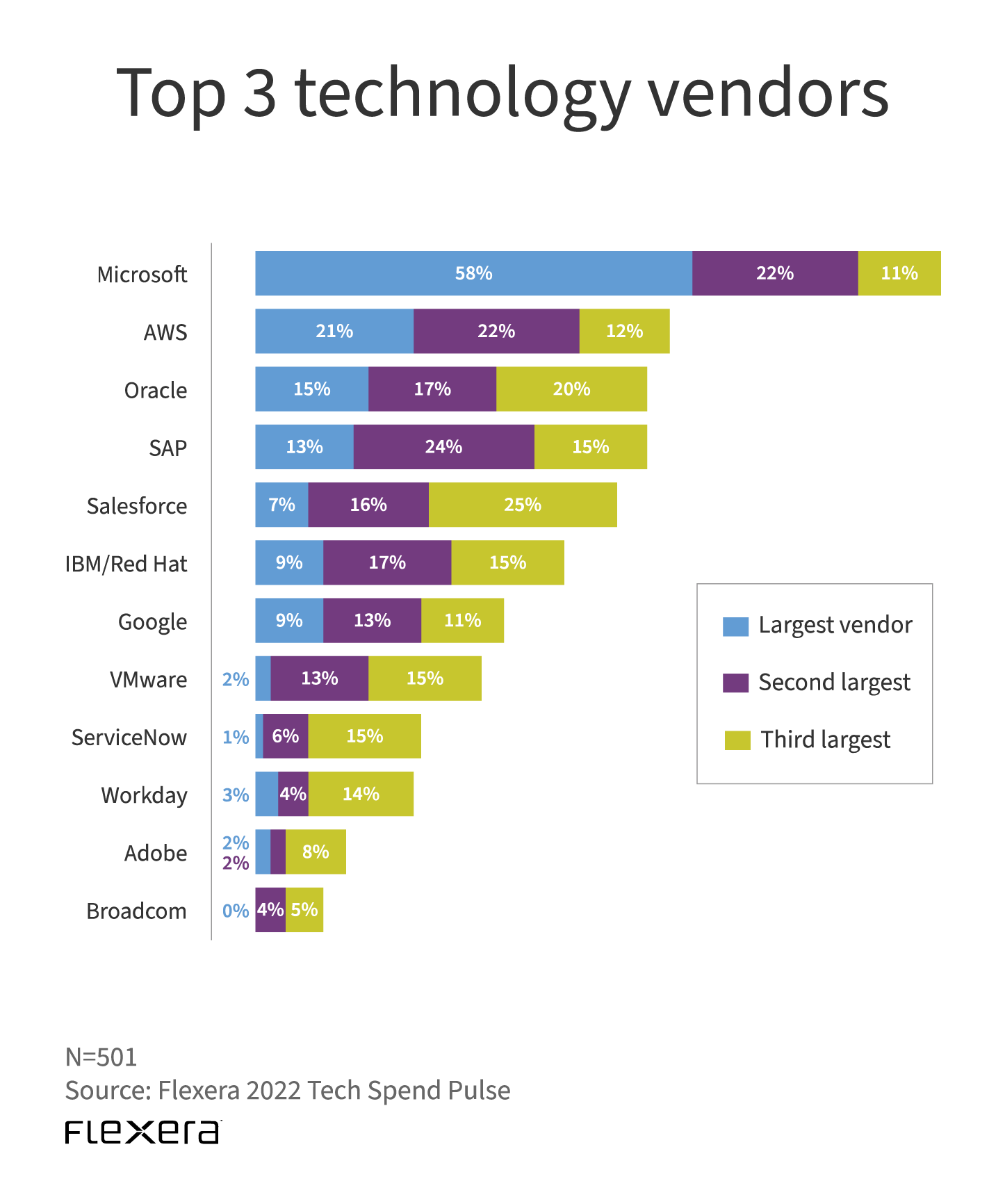When respondents were asked about their current and future use of leading technology vendors across traditional on-premises software, SaaS and public cloud, Microsoft continues to dominate the top spot. Another 22% say Microsoft is their second largest vendor based on spend. Both Oracle and SAP made gains (Oracle up to 15% from 6% last year, and SAP up to 13% from 6%), closing the gap with AWS.