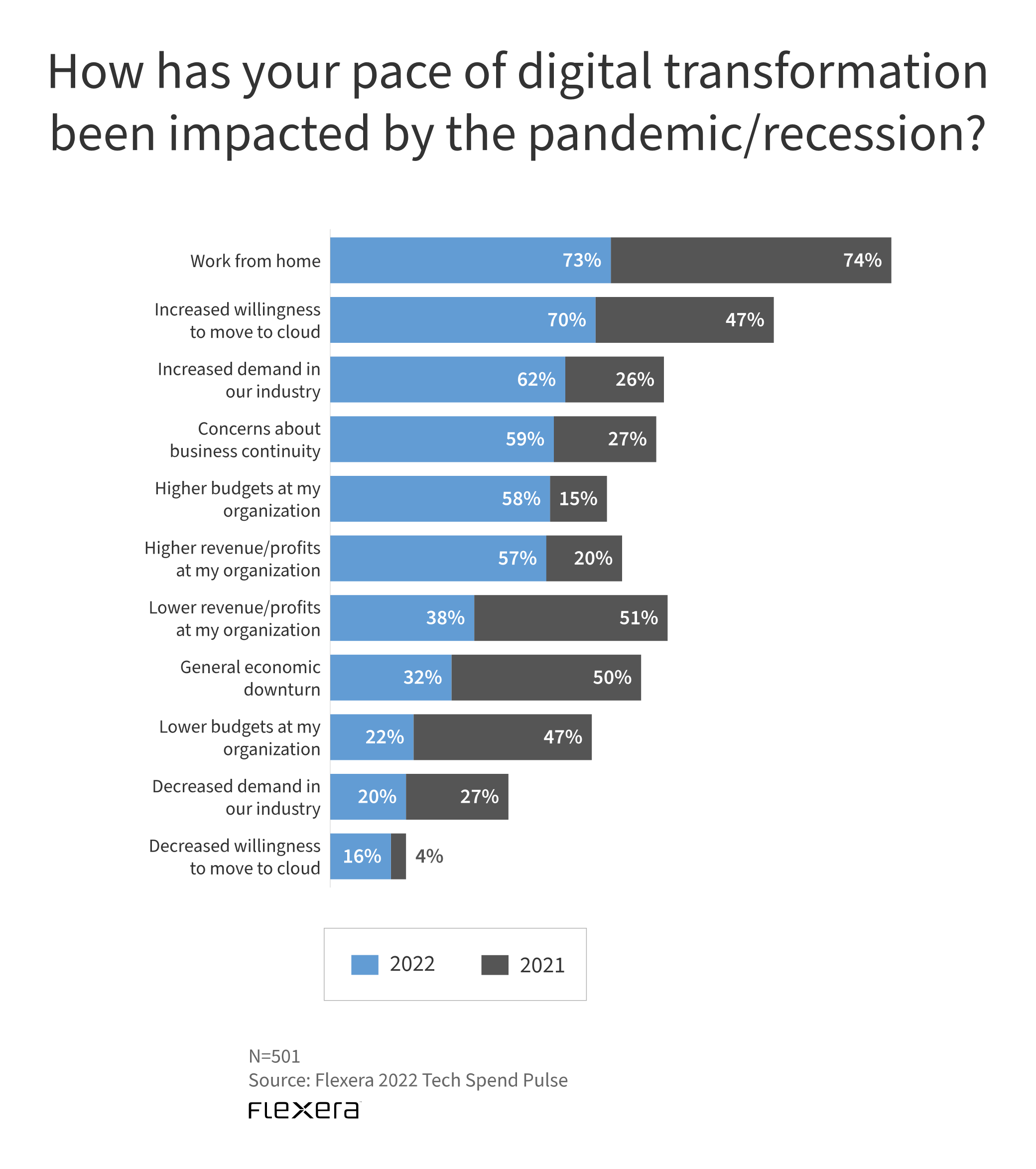 Both the 2021 and 2022 IT spending surveys included questions about the known impacts of the COVID-19 pandemic and how these will affect digital transformation activities. The negative impacts (such as lower revenue/profits at my organization and general economic downturn) all decreased significantly compared to previous years. Conversely, the more positive impacts such as higher budgets at organization, higher revenue/profits at organization and increased demand in our industry all increased significantly.