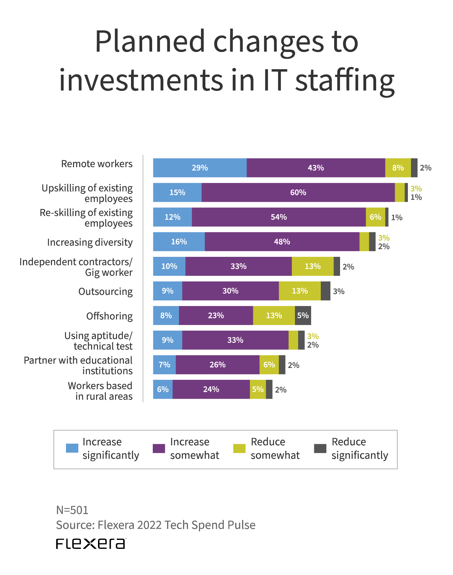 The pandemic and the ensuing Great Resignation forced organizations to rethink their investments in IT staff. Investment in remote workers remains at the top, but both the upskilling of existing employees and re-skilling of existing employees are top of mind as well.