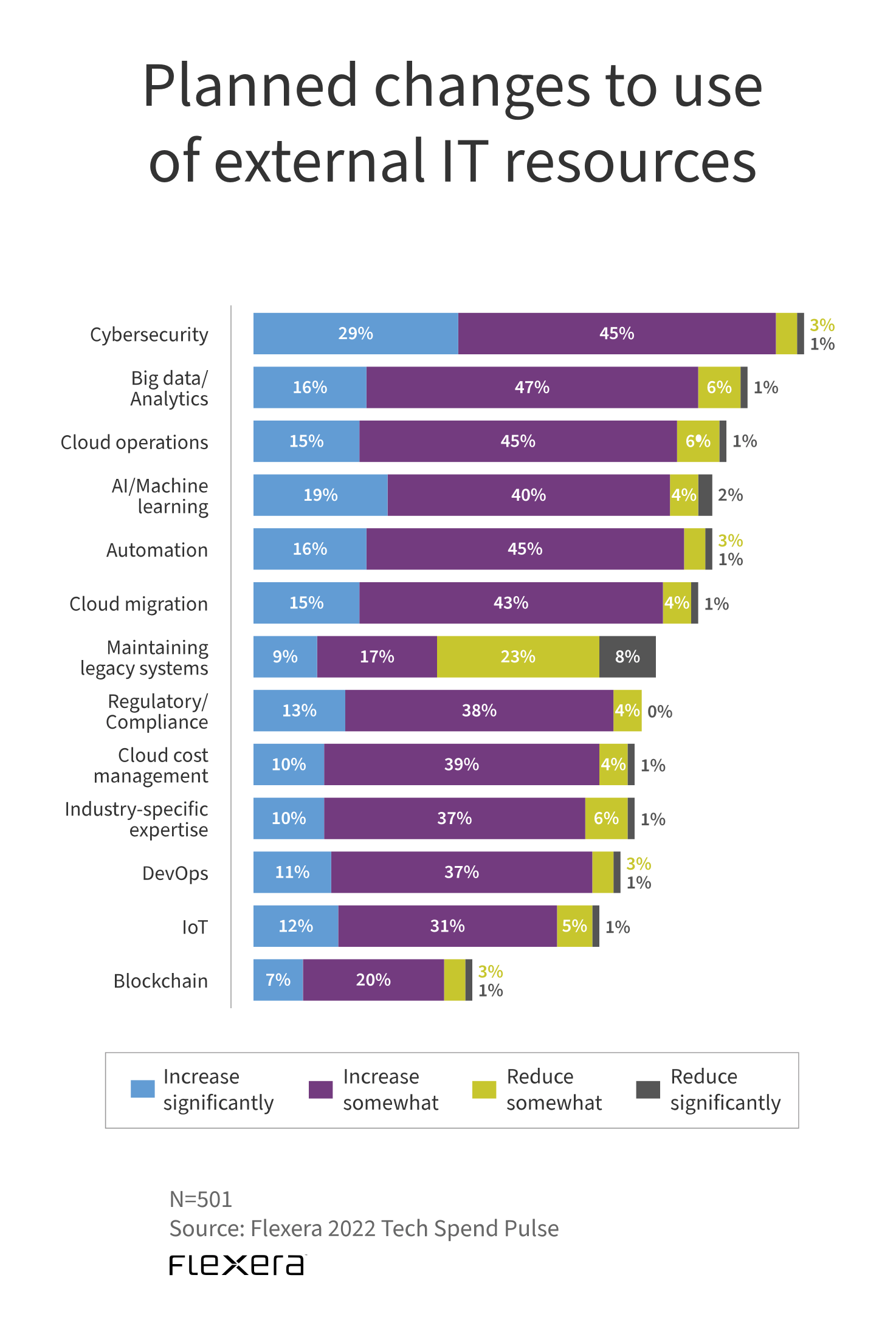 Tech spend continues to rise in the cloud and drop in on-premises software as organizations turn to SaaS and update infrastructure to support remote working. As we’ve seen with the Great Resignation and across the globe, workforces are adapting, and we expect those trends to continue as budgets continue to skew toward increases for SaaS, public cloud and remote IT devices like laptops and away from data centers, servers and on-premises software.