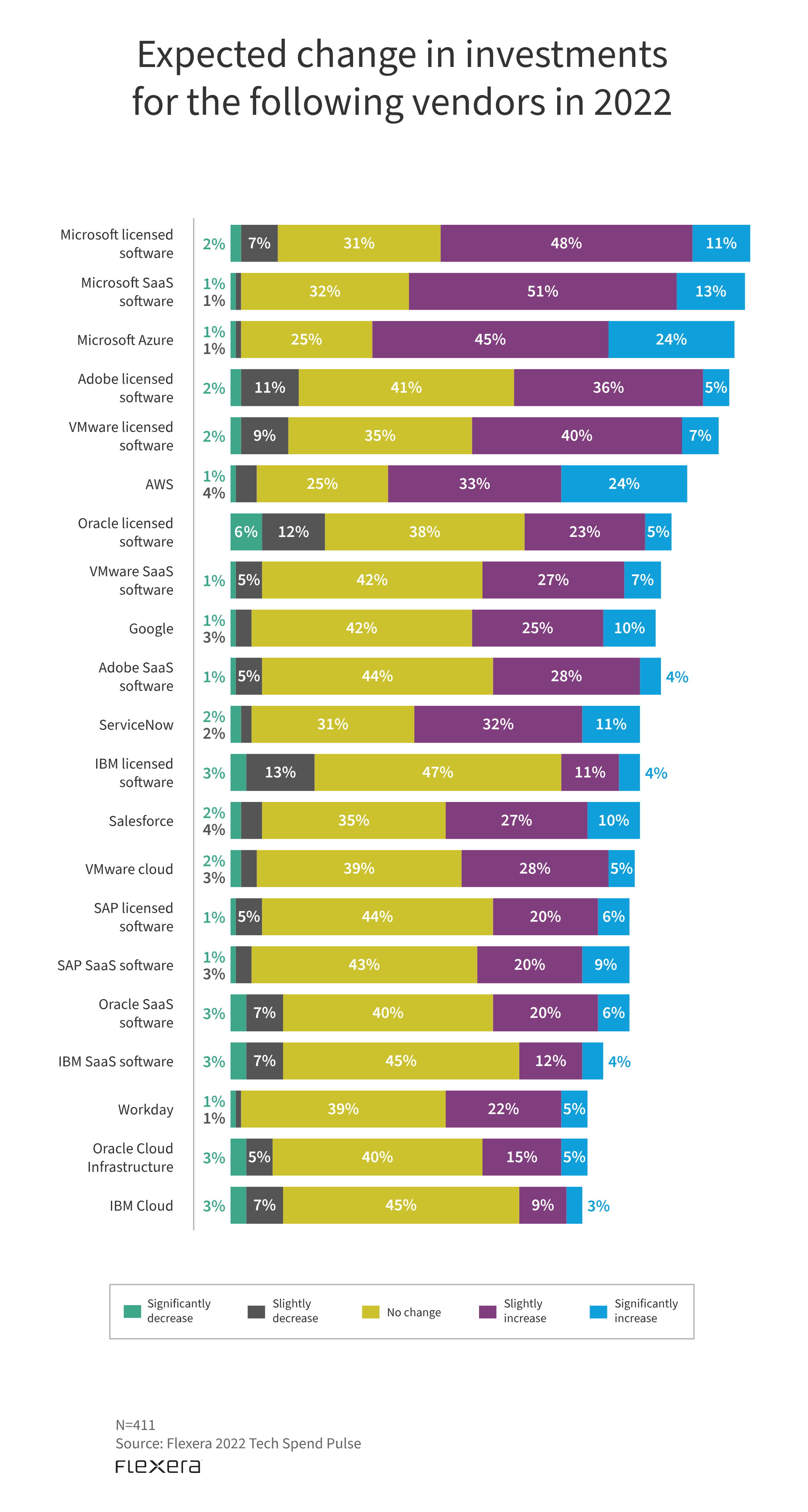 When looking at the expected change in specific vendors and their offerings, Microsoft showed the highest percentage of increase across all categories (licensed software, SaaS and cloud), followed by Adobe licensed software. The highest decrease in investment was expected in Oracle licensed software.