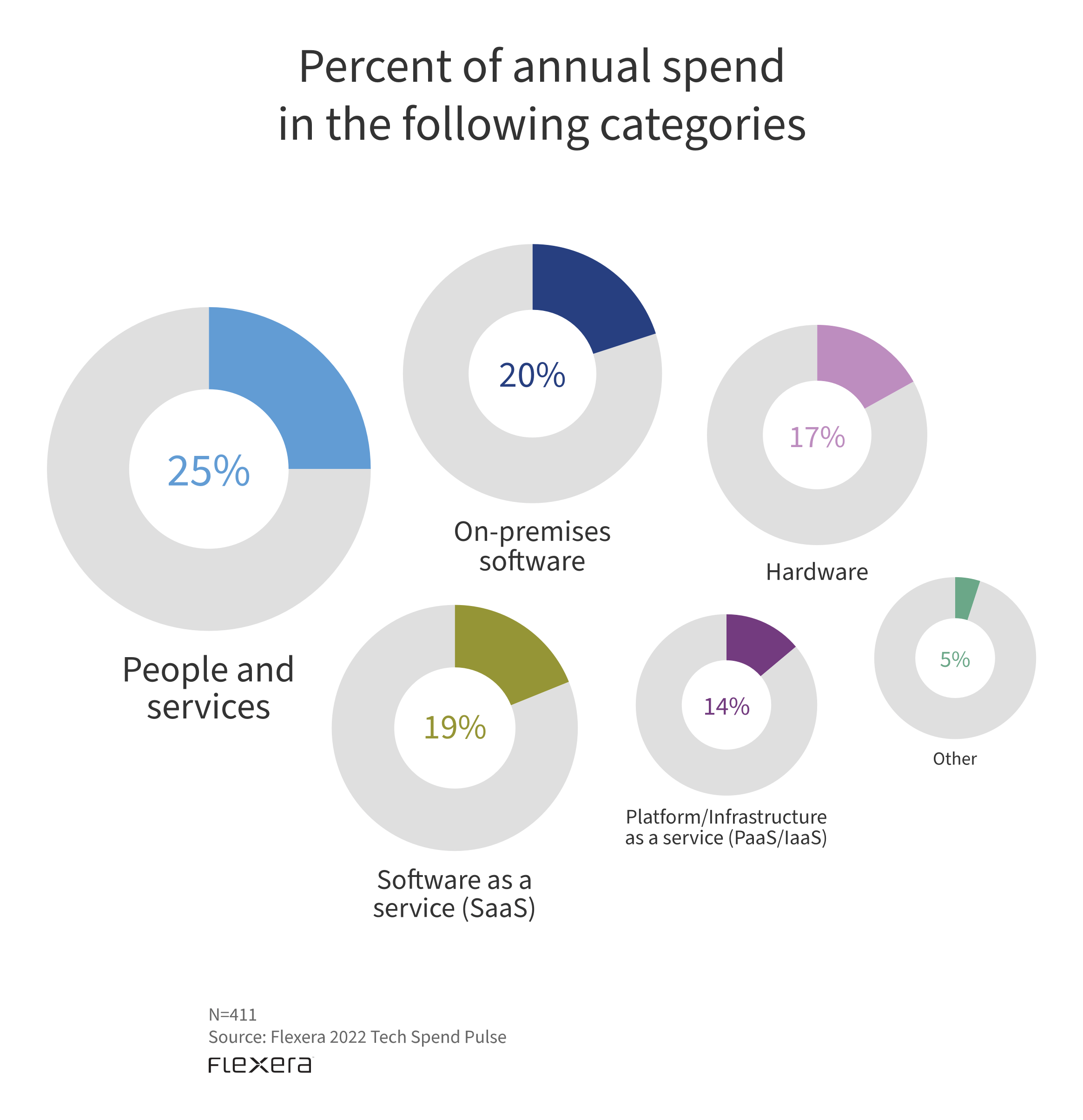 We see that a considerable percentage of IT spend—53%—is allocated to software and related assets, including SaaS, IaaS and PaaS. This represents a steady overall investment compared to 2021 (54%), however, SaaS has increased significantly from 10% to 19% from 2021 to 2022.