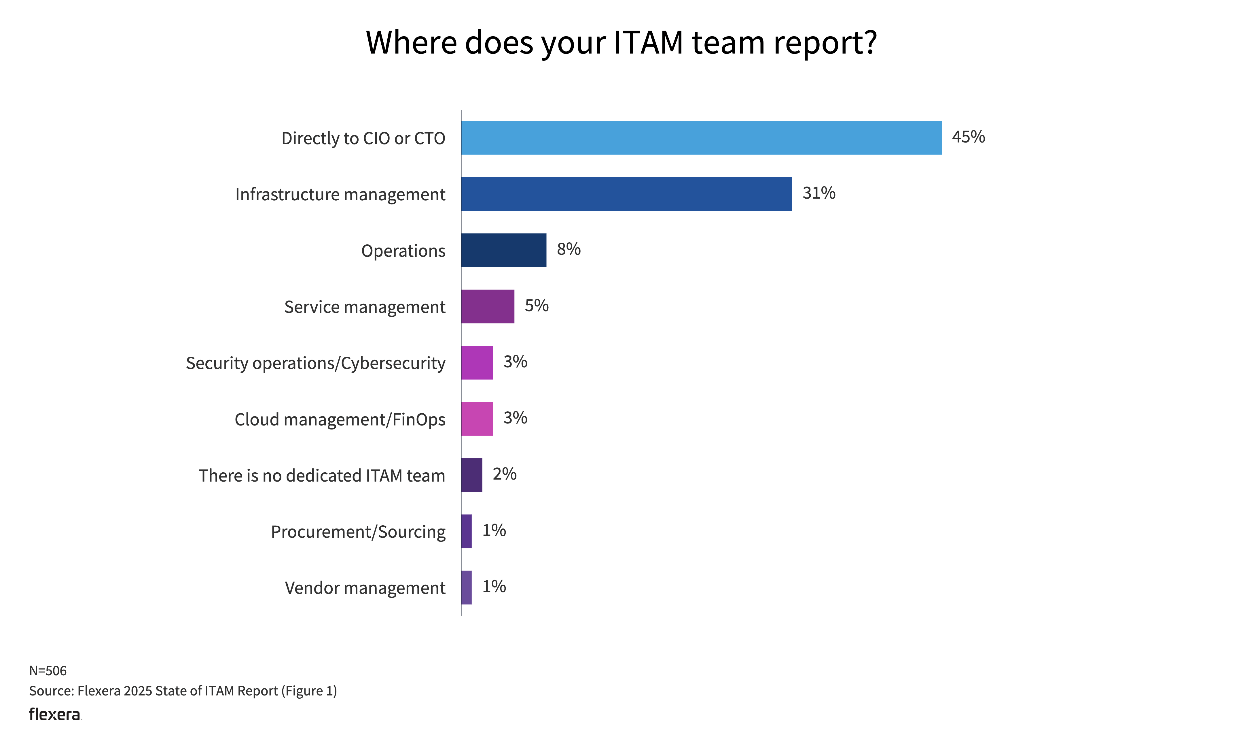 Compared to last year, we’re seeing a 5 percentage point increase in ITAM teams reporting to infrastructure management. Forty-five percent of respondents report directly to the CIO or CTO, and 31% report to infrastructure management.