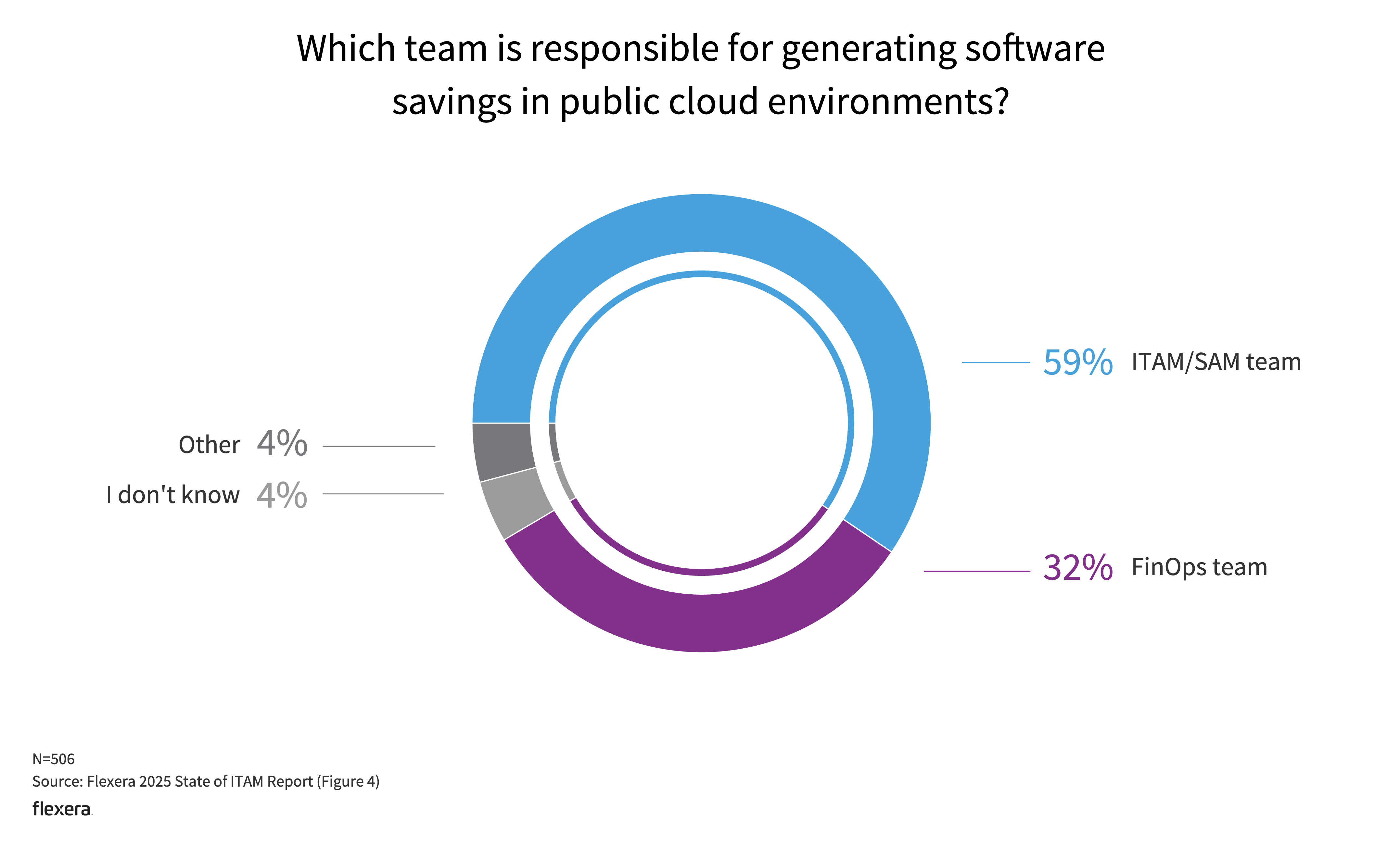 We also asked a new question in this year’s survey: Which team is responsible for generating software savings in public cloud environments? Results from our respondent pool show that roughly a third of companies have their FinOps teams manage software savings in public cloud environments—while nearly 60% are managed through ITAM teams. This suggests an area of opportunity for ITAM and FinOps teams to collaborate on optimizing software in cloud environments.
