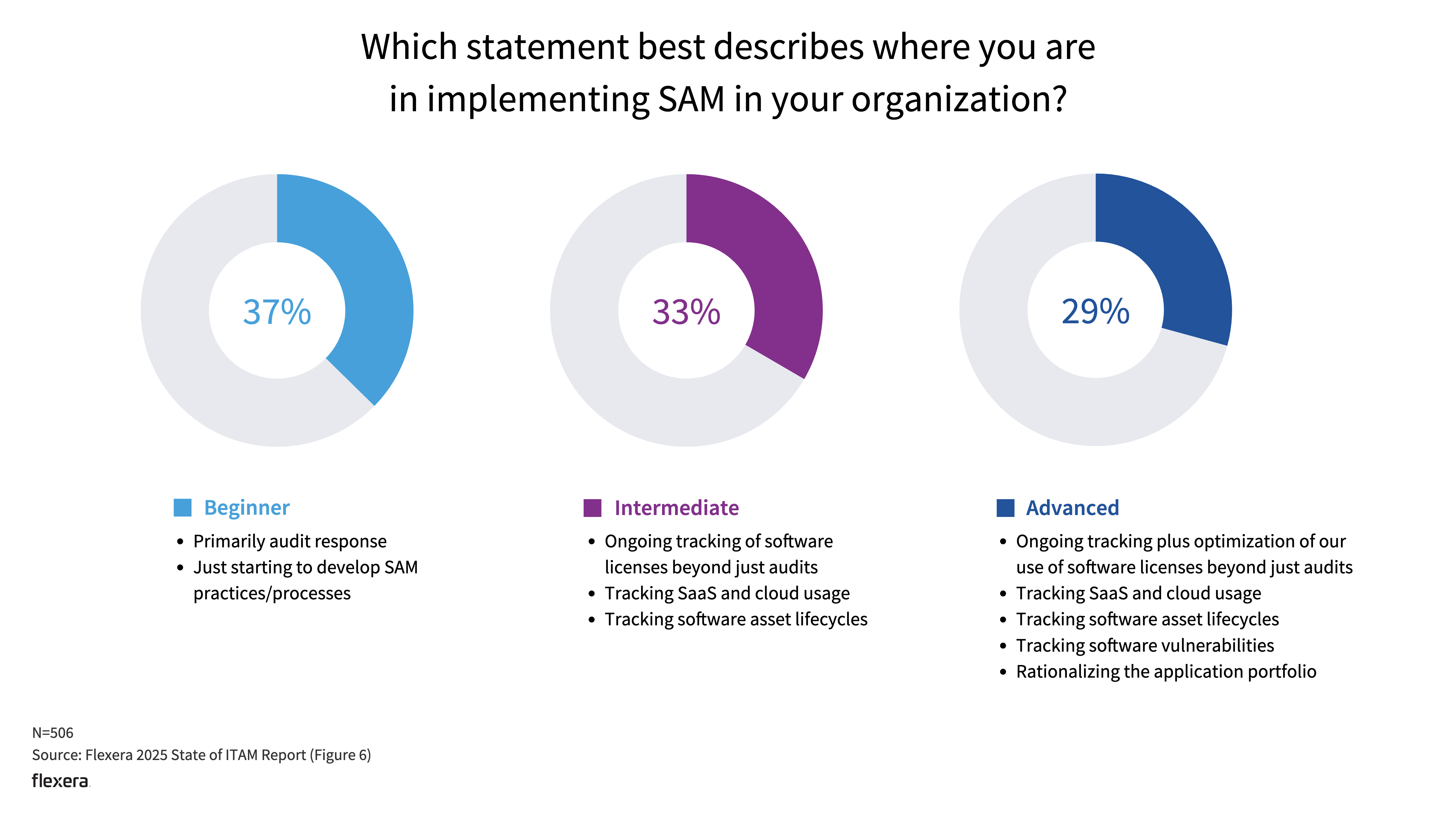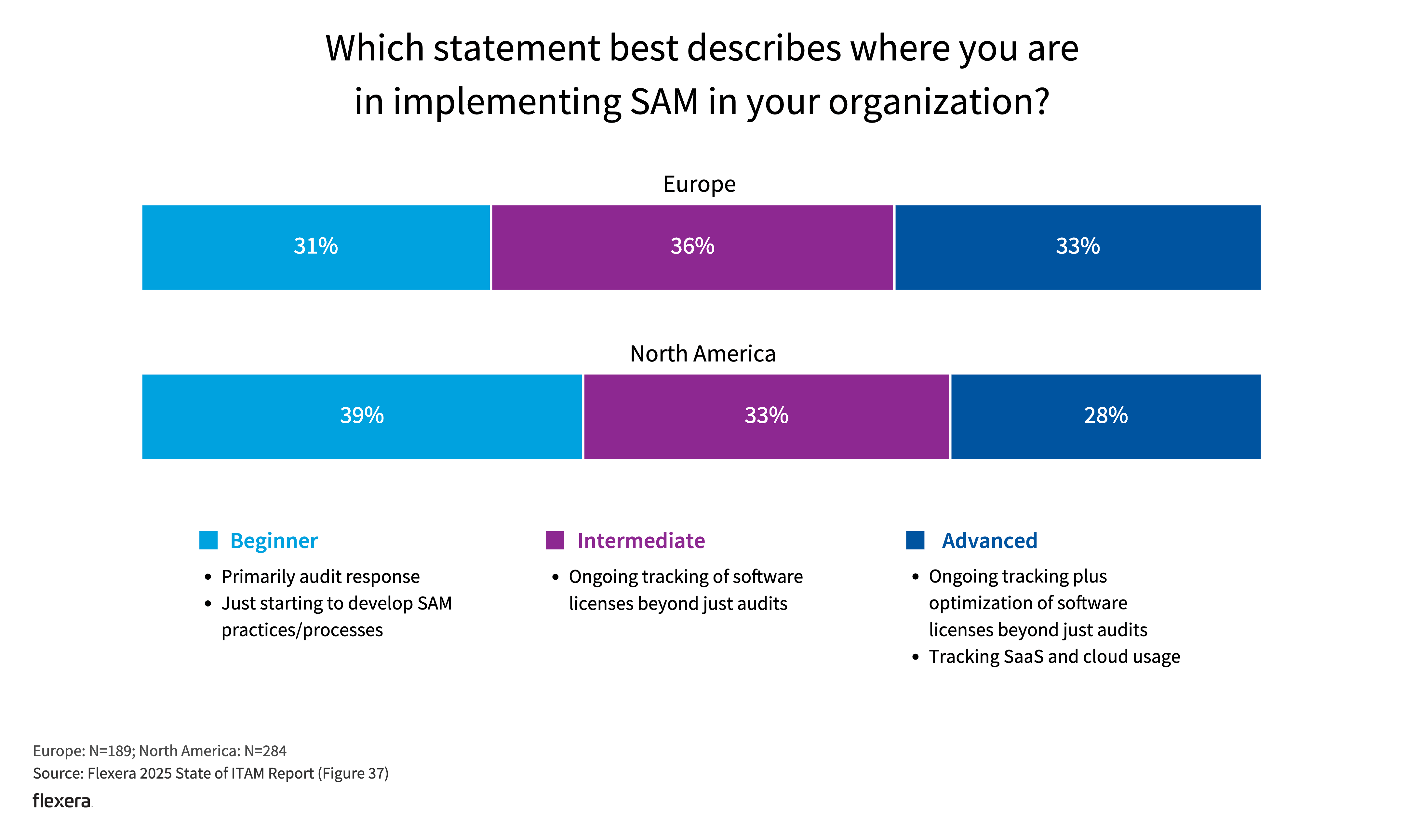 The majority of European respondents (36%) identify as intermediate when it comes to implementing SAM in their organization, and a third (33%) are advanced.
