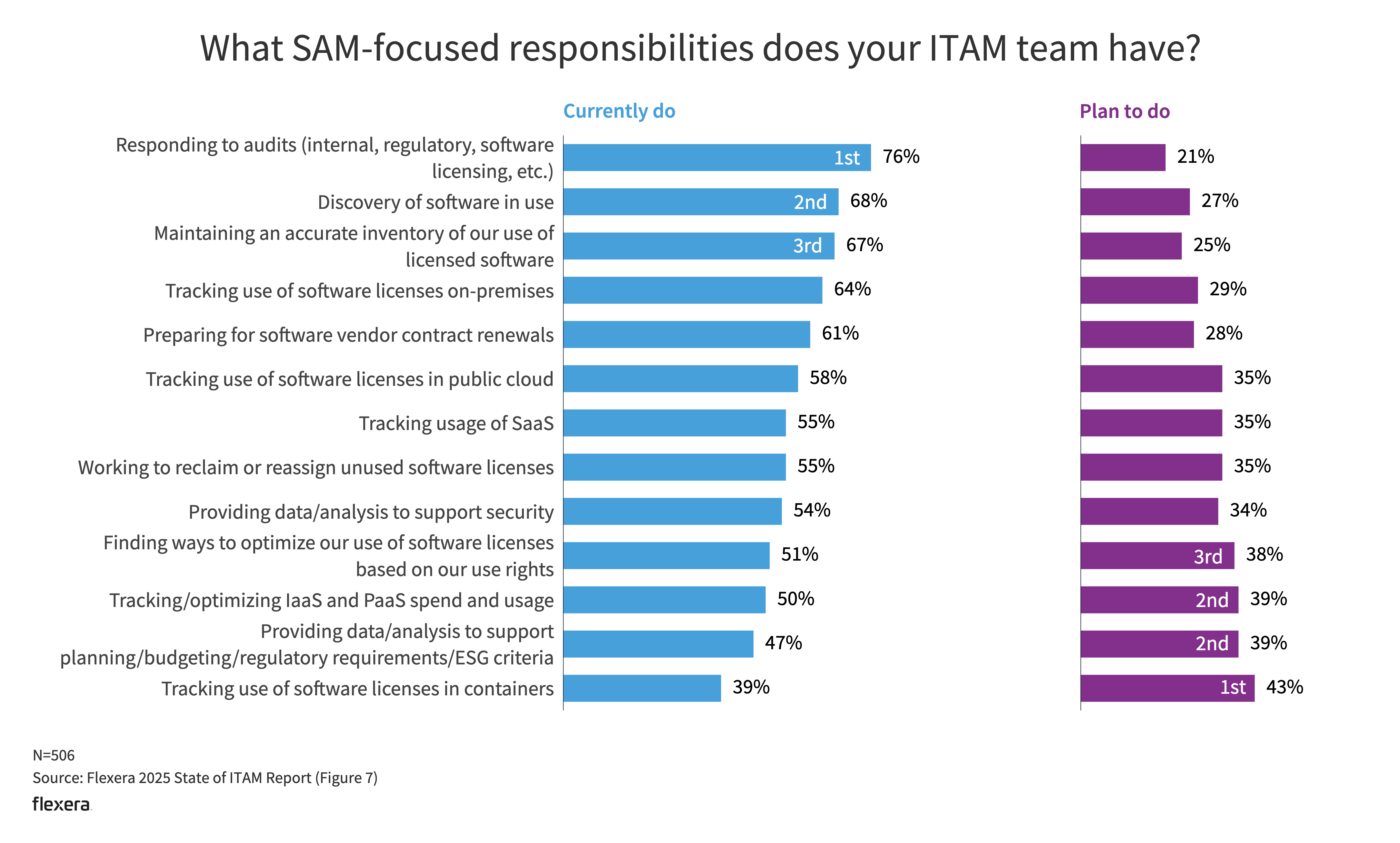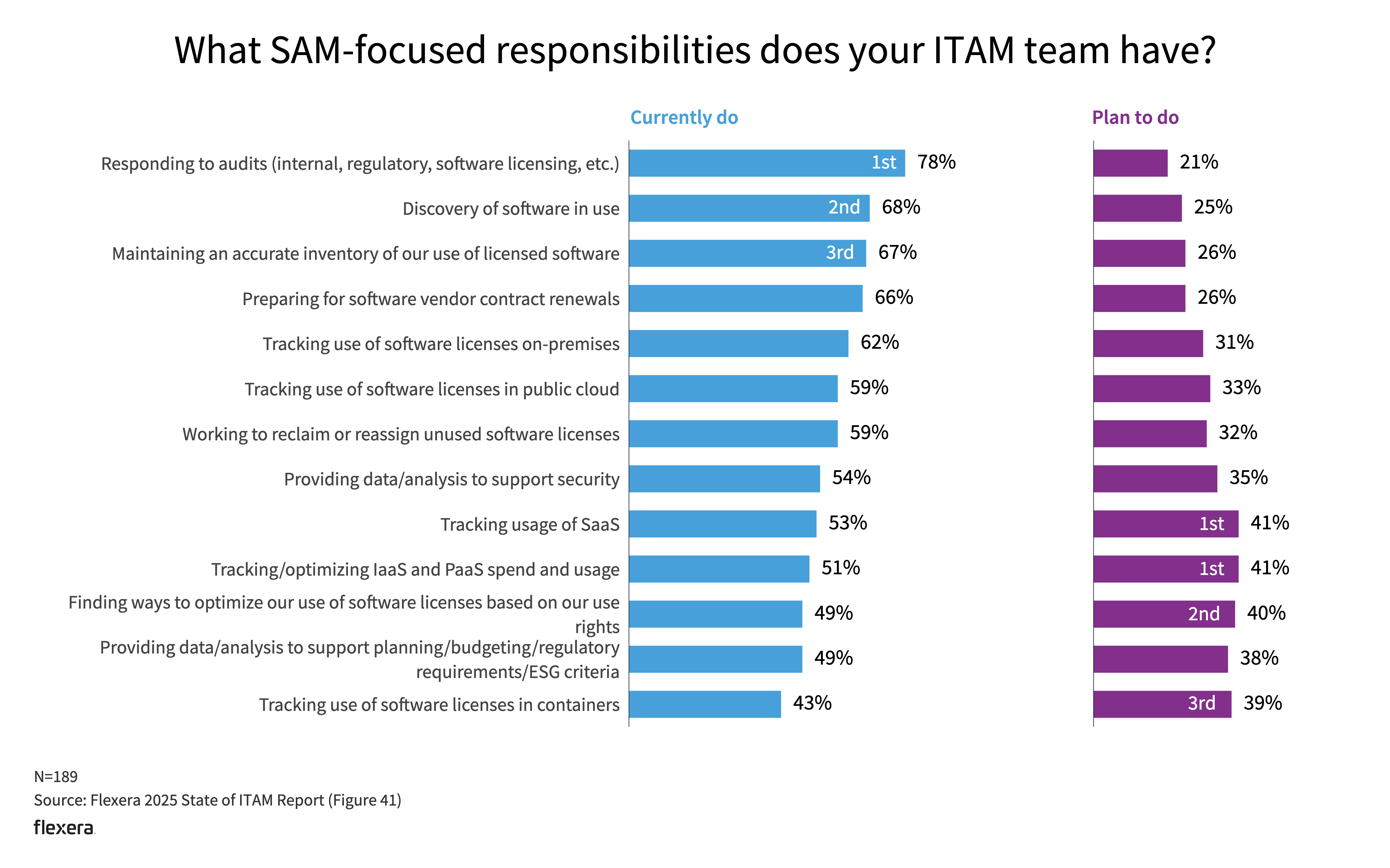 Responding to audits remains the top priority for SAM-focused responsibilities this year (76% currently do; 21% plan to do) and increased by 2 percentage points year over year. What’s more interesting is that maintaining an accurate inventory of licensed software has dropped 5 percentage points year over year. This directly impacts the accuracy of complying to vendor contracts and therefore not being audited.