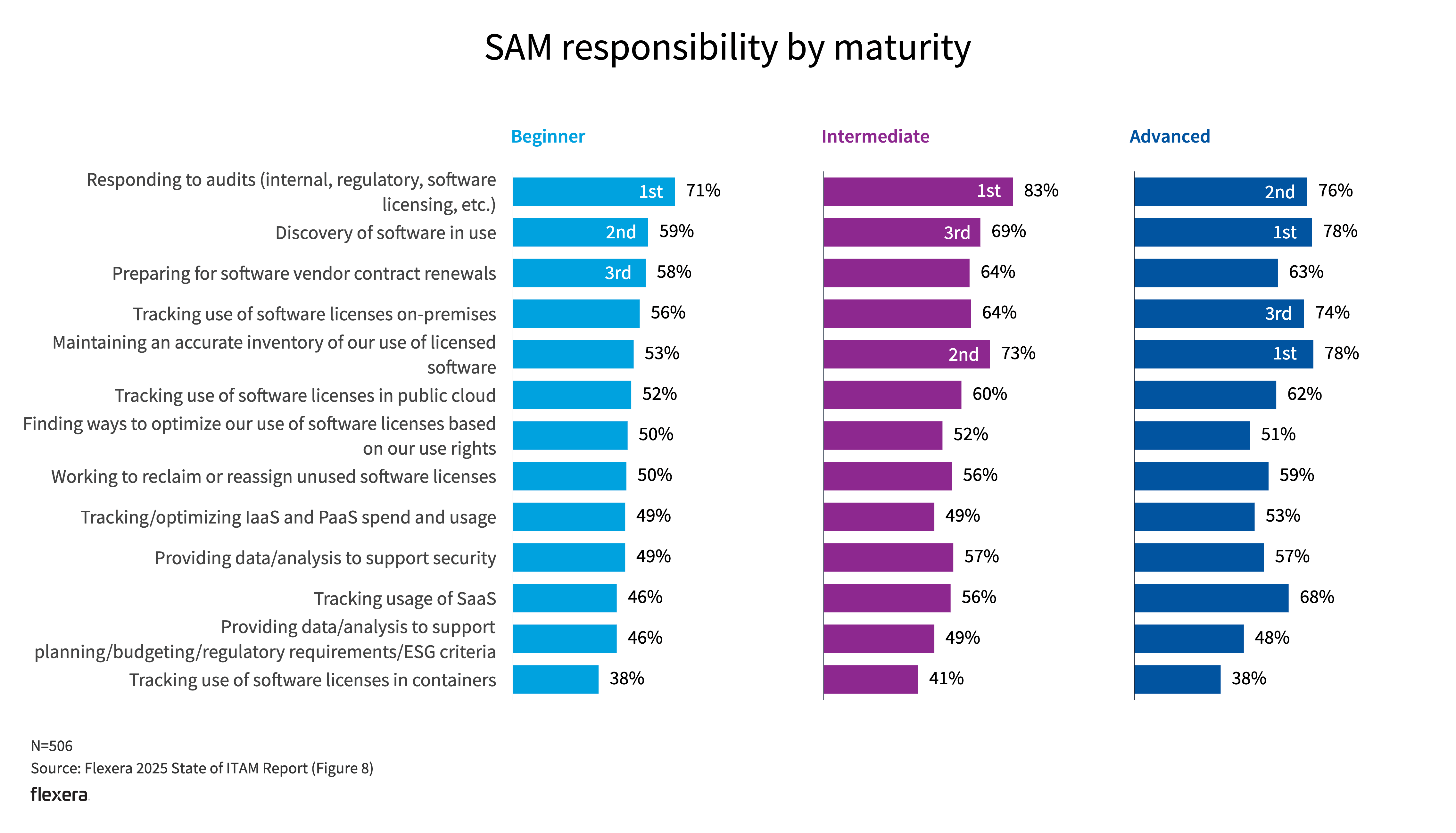 It’s interesting that both beginner and intermediate programs overwhelmingly focus their responsibility on responding to vendor audits as their top priority, while advanced programs are tied to both discovery of software in use and maintaining an accurate inventory. Responding to audits is still a priority, but this underscores the importance of these responsibilities in order to proactively respond to audits.