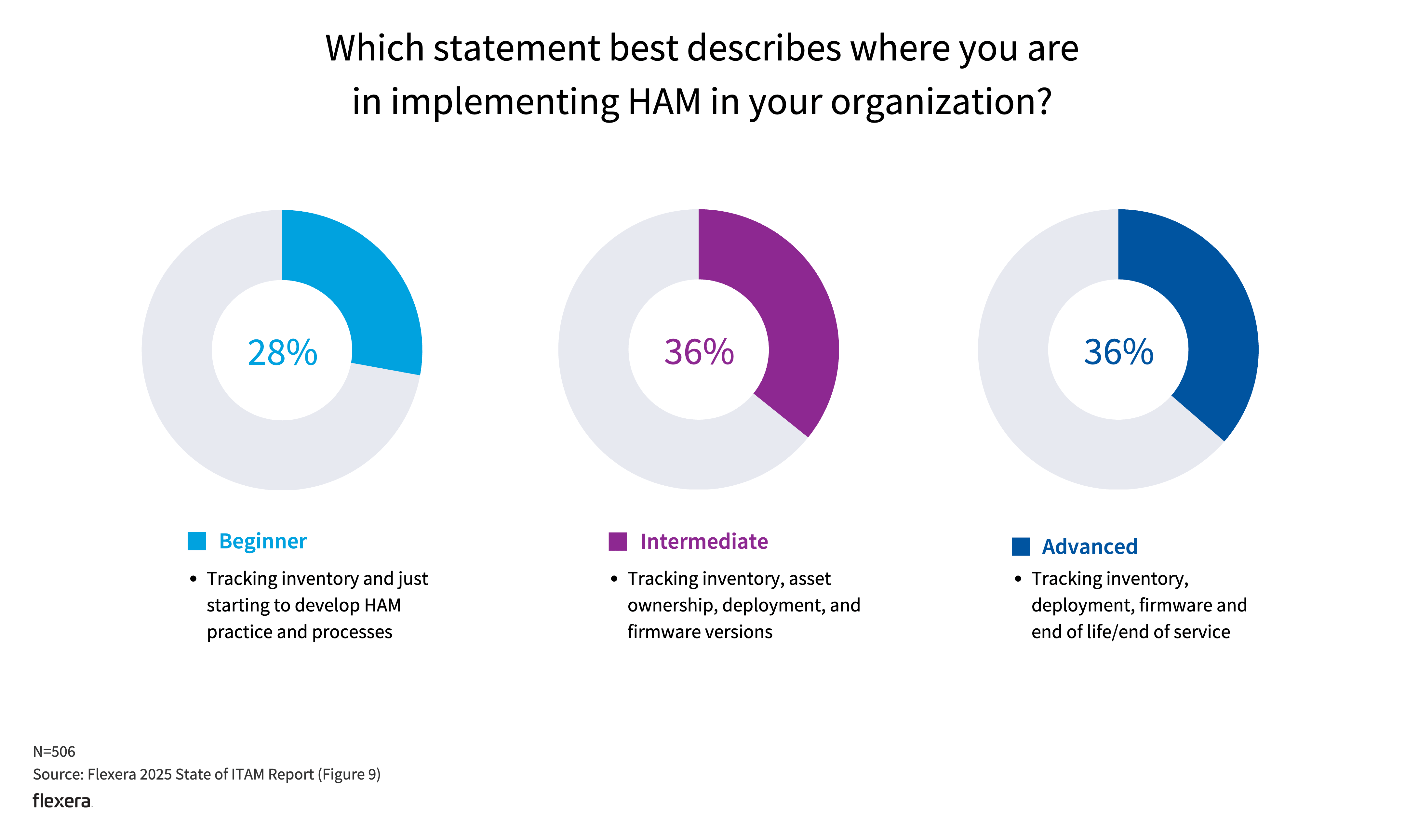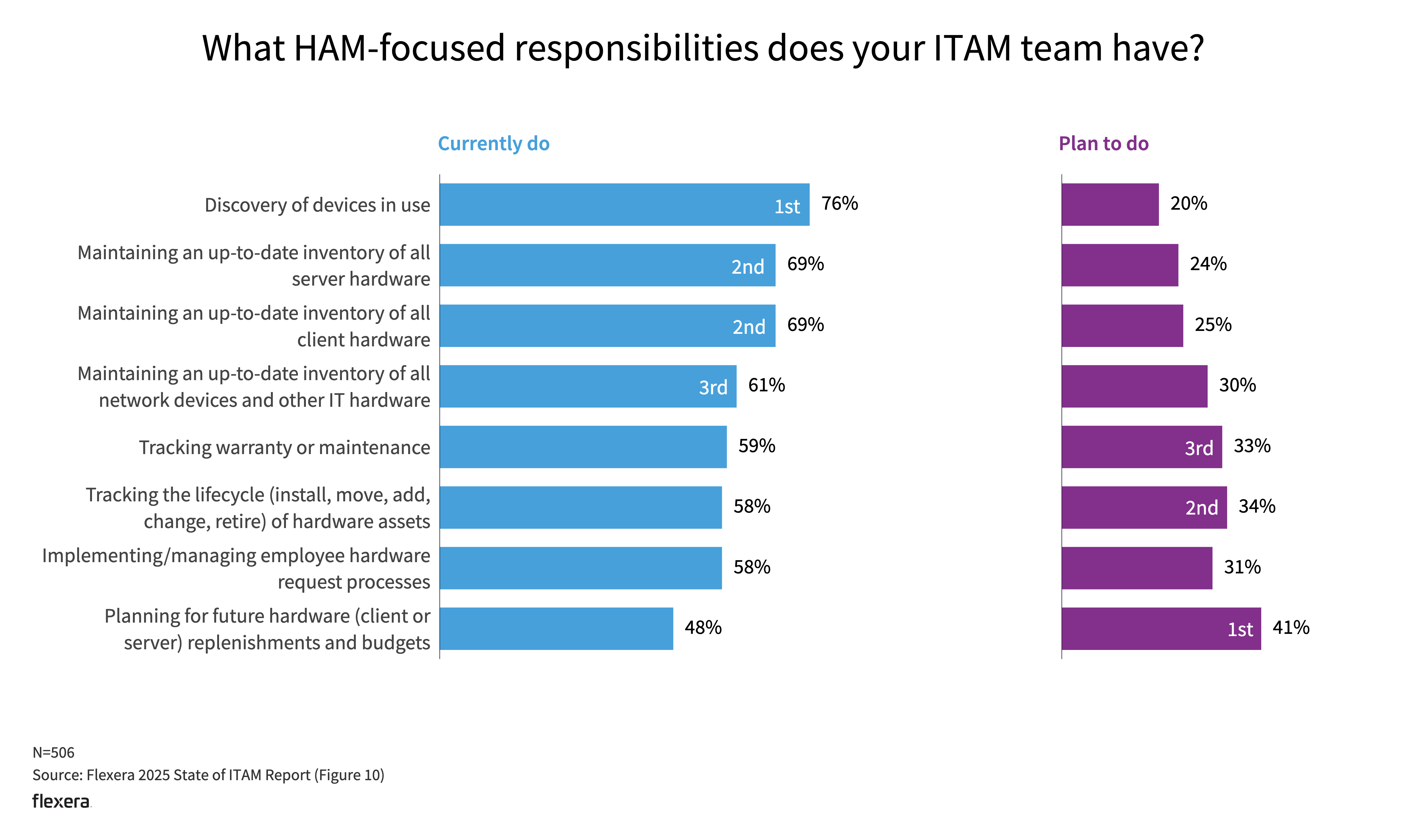 Regarding HAM maturity levels, there aren’t many changes since last year’s report, and HAM-focused responsibilities remain the same year over year: Discovering and inventorying all assets are still the top priorities.