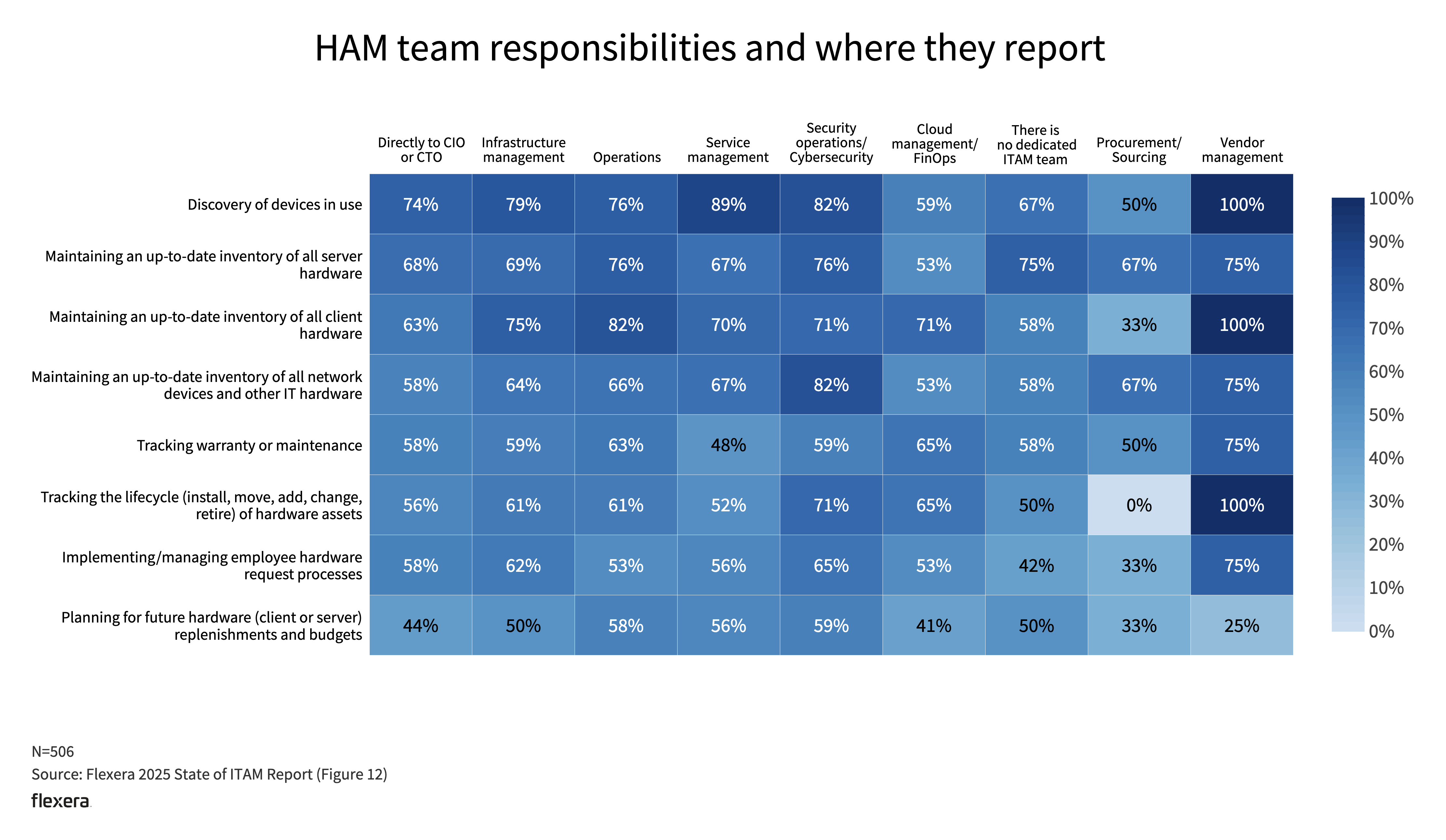 When considering HAM responsibilities, we’re seeing an increase in those who report directly to the CIO or CTO and a slight decrease in responsibilities for teams under infrastructure management.
