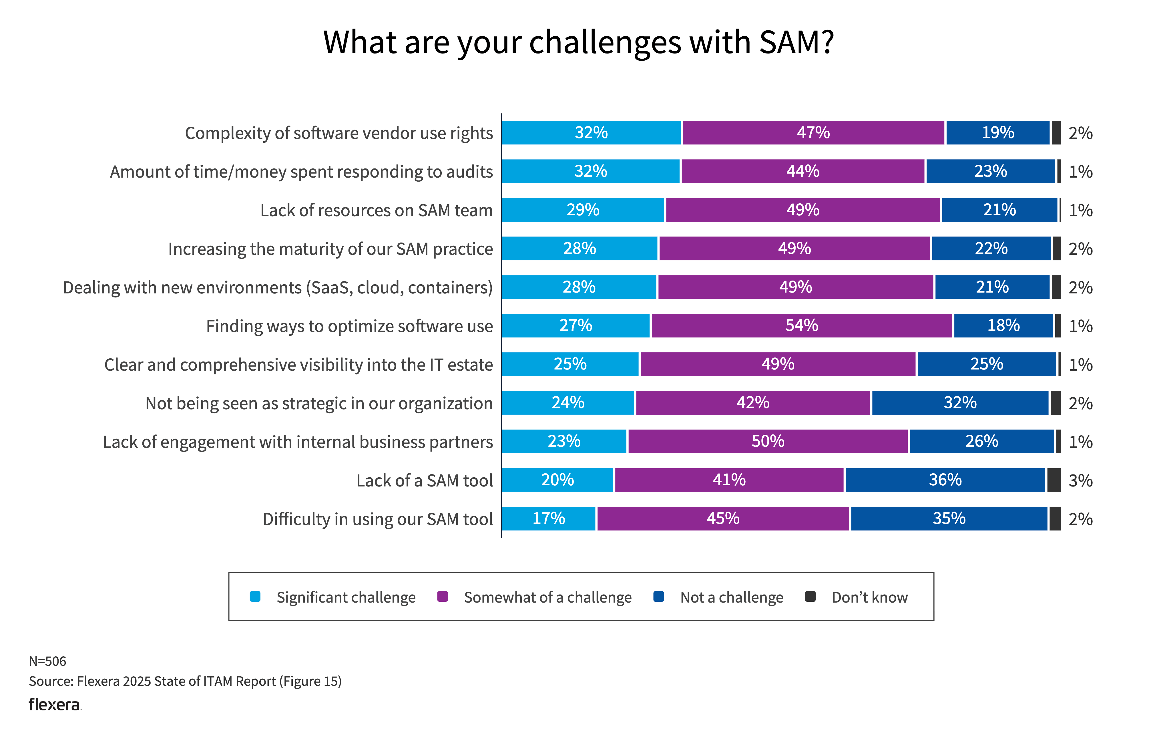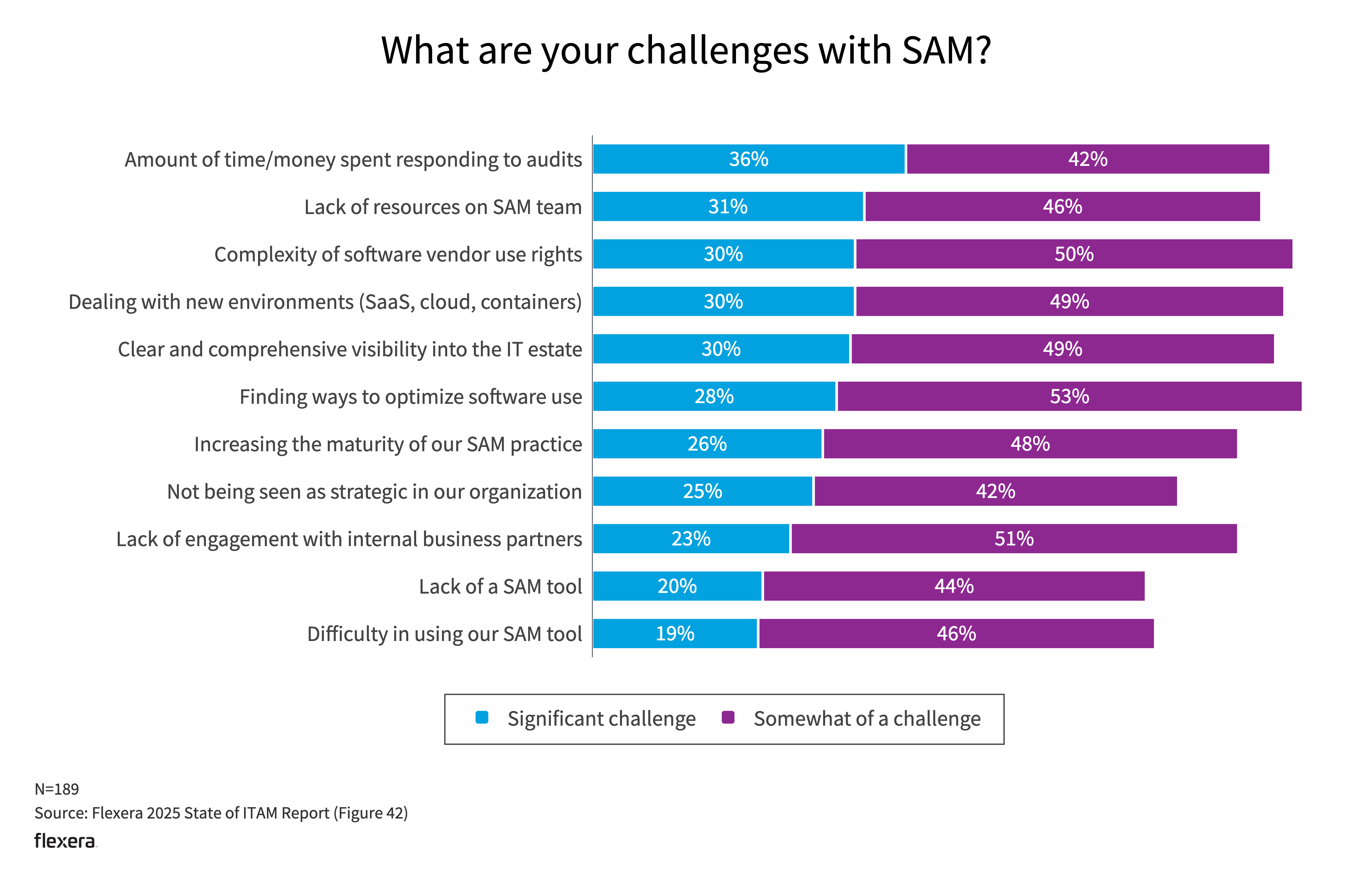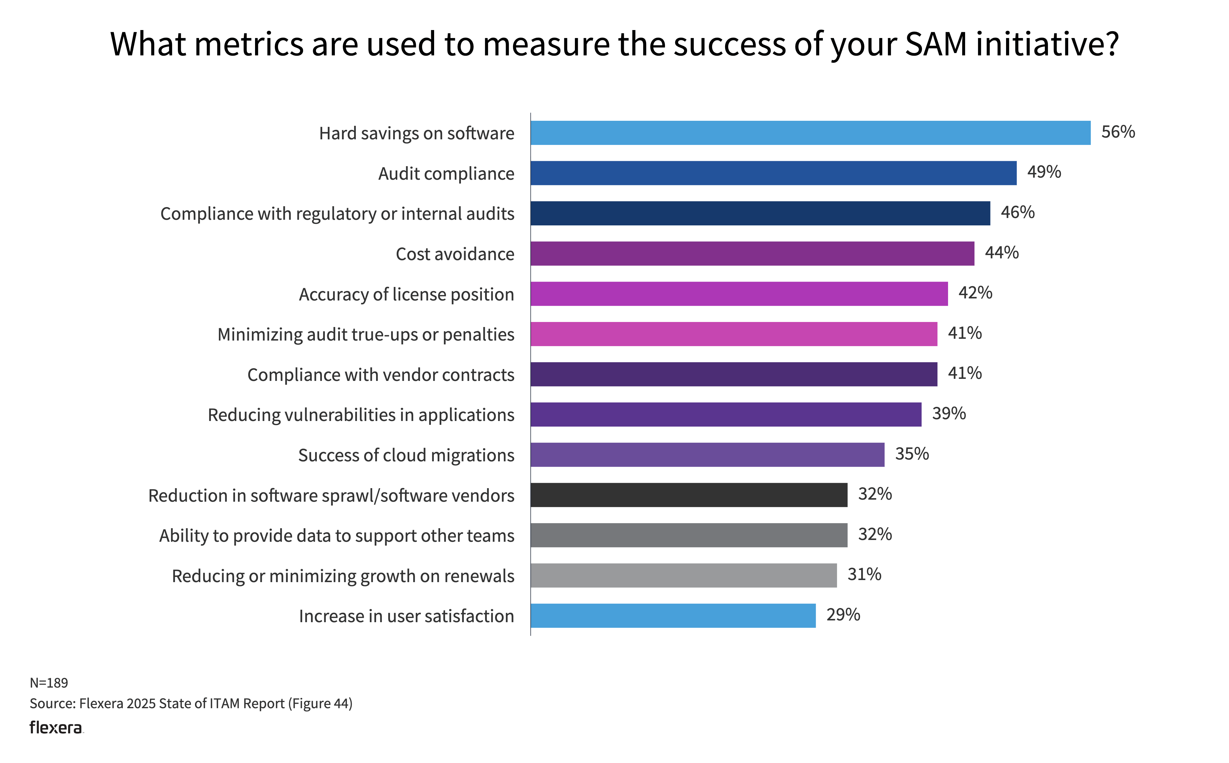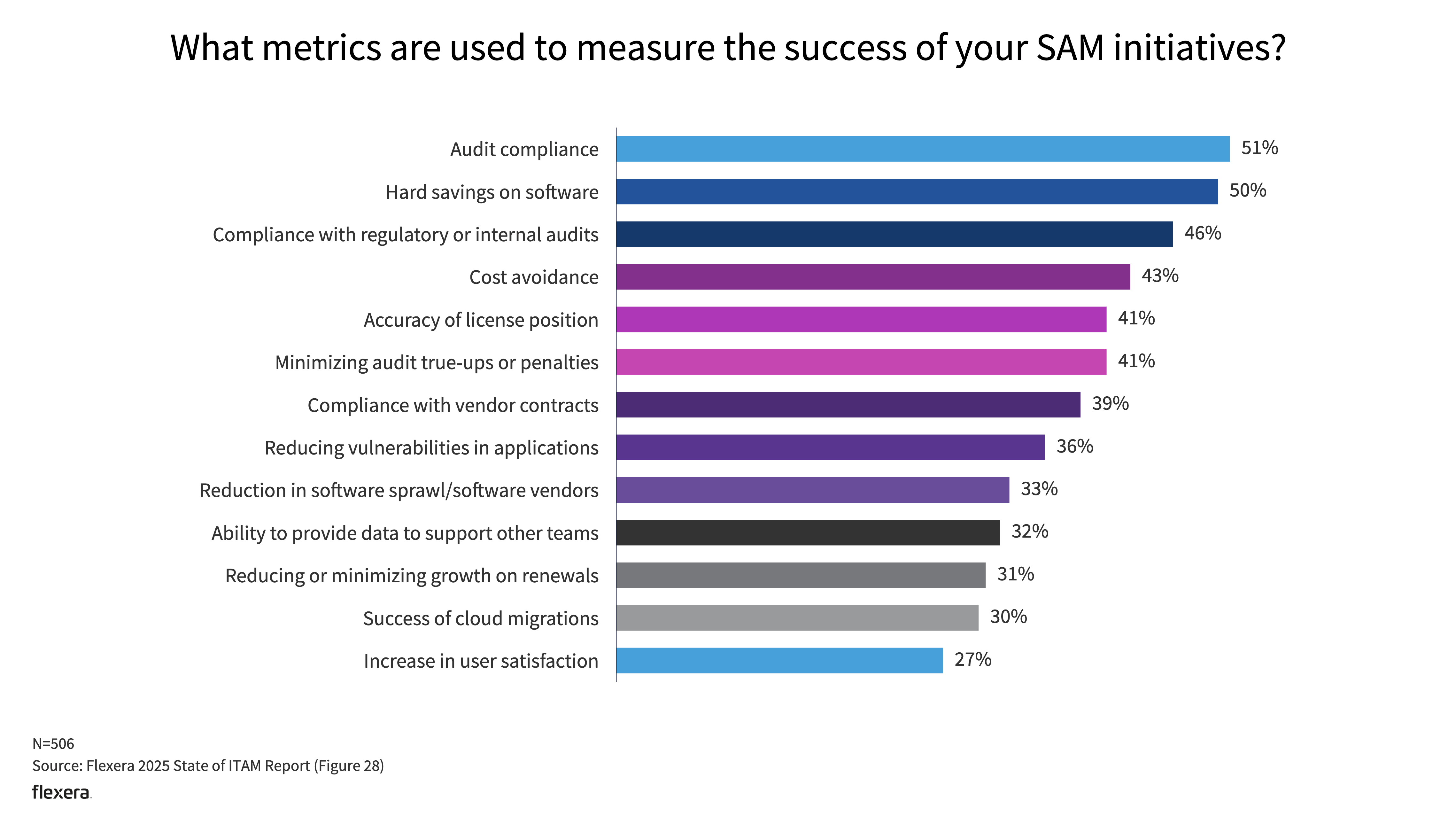 Audit compliance (51%) also remains at the top of the list of which metrics are used to measure the success of SAM initiatives, along with hard savings on software (50%) and compliance with regulatory or internal audits (46%).